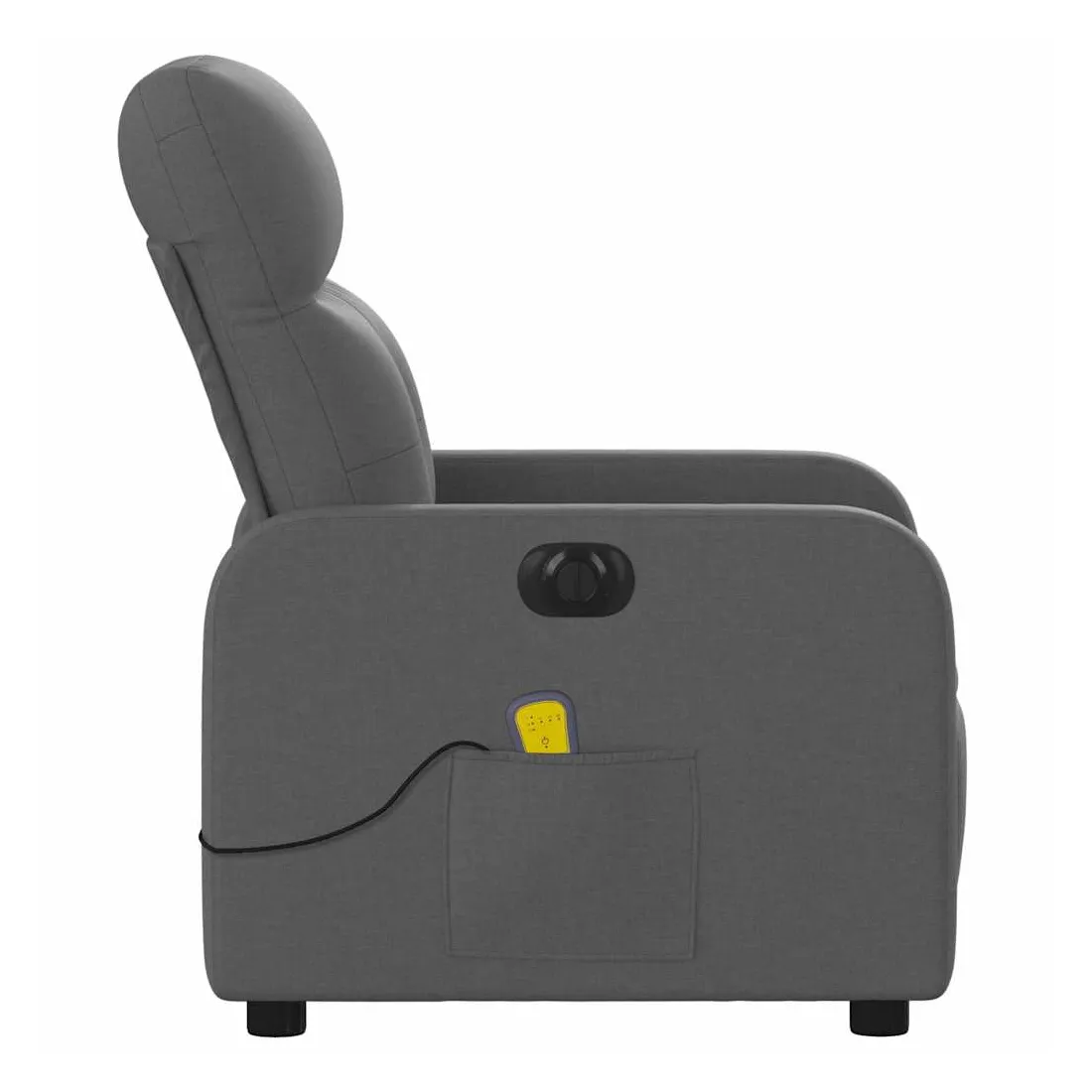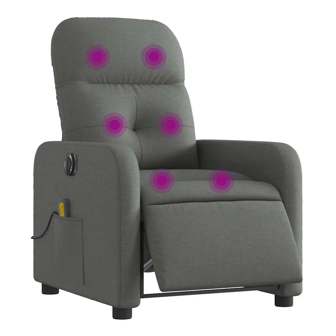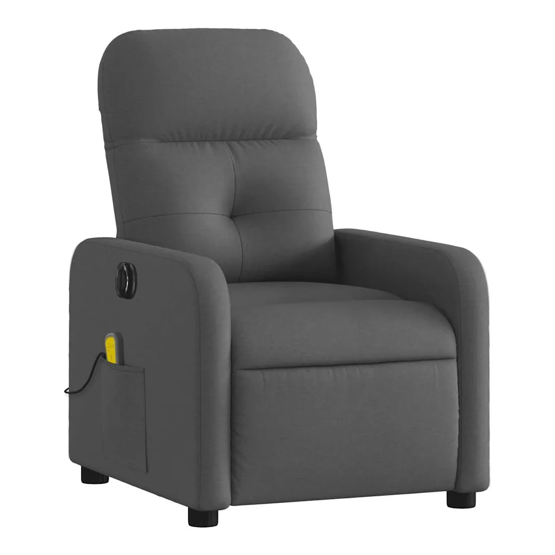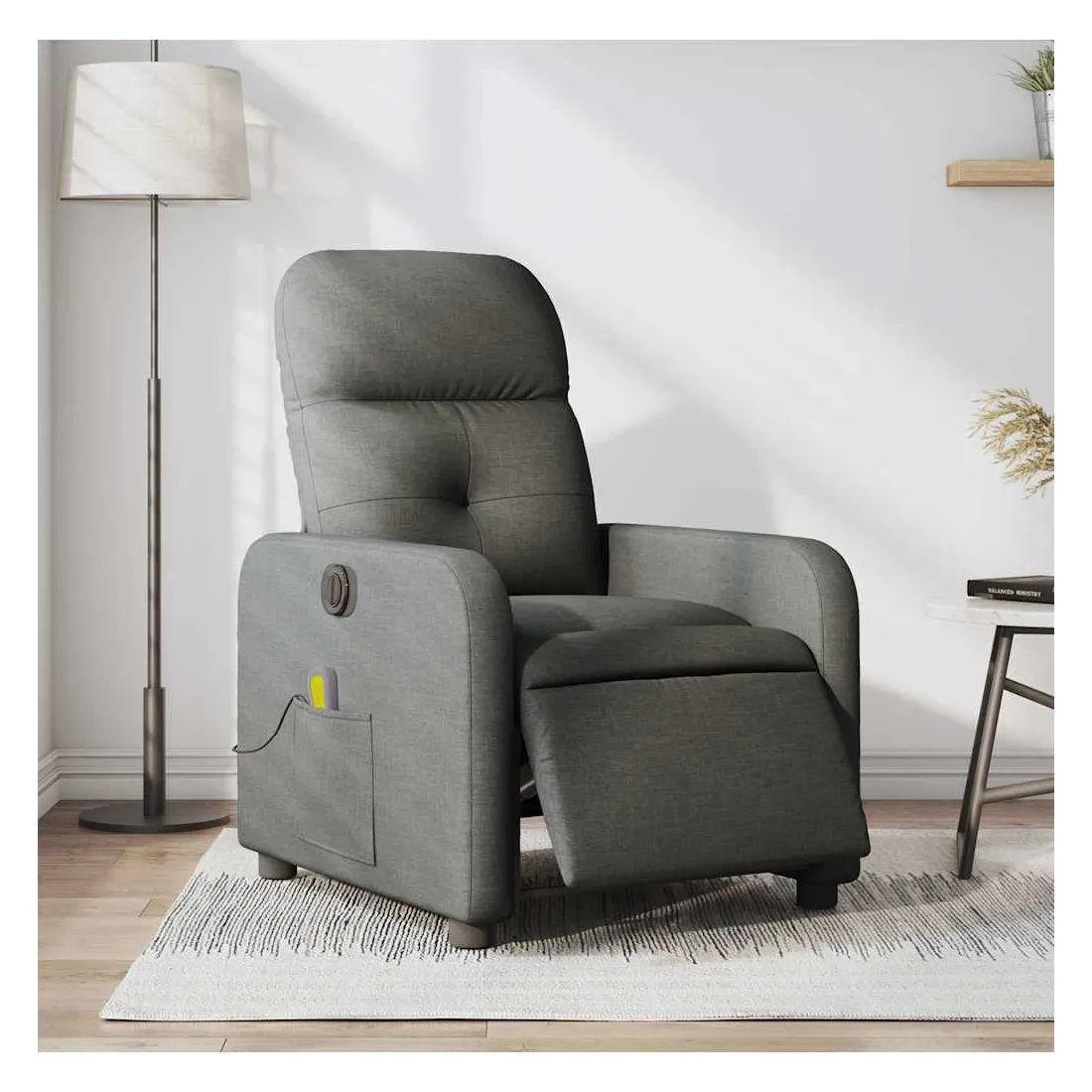 Asseyez-vous et détendez-vous dans ce fauteuil inclinable de massage électrique très confortable ! Fonction d'inclinaison électrique : ce fauteuil inclinable est équipé d'un moteur électrique qui permet de régler automatiquement le repose-pied et le dossier dans n'importe quelle position, selon votre confort, en appuyant simplement sur le bouton situé sur le côté du fauteuil. Cette fonction permet une inclinaison maximale de 135 degrés. En outre, le dossier peut revenir automatiquement à sa position d'origine par une simple pression sur le bouton.Fonction de vibration : les 6 points de massage vous permettent de faire l'expérience d'un massage mieux ciblé. De plus, la télécommande incluse vous permet de choisir différents programmes de massage. La fonction de massage est alimentée par le connecteur USB qui nécessite une source d'alimentation USB certifiée de 5 V (non fournie).Expérience d'assise confortable : le siège, le dossier et les larges accoudoirs bien rembourrés recouverts de tissu procurent une sensation confortable et chaleureuse, vous permettant de vous sentir enveloppé lorsque vous êtes assis. Le tissu présente un aspect simple et épuré et est respirant et durable.Poche latérale pratique : ce fauteuil est doté d'une poche latérale pour ranger votre télécommande ou garder vos objets essentiels à portée de main.Cadre solide et stable : le cadre en bois et en métal offre une structure solide et une grande stabilité. Ce fauteuil inclinable est confortable et durable.
