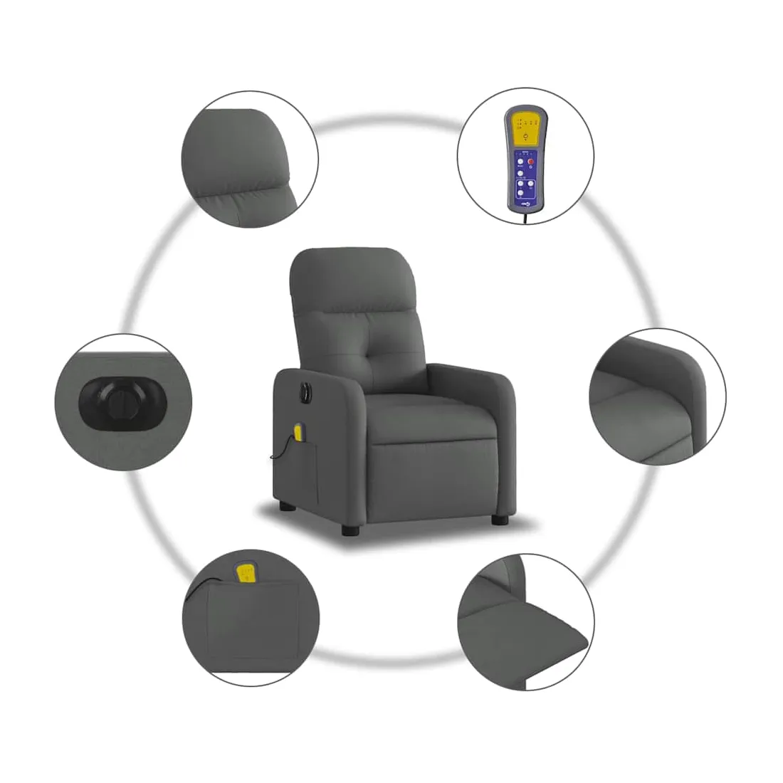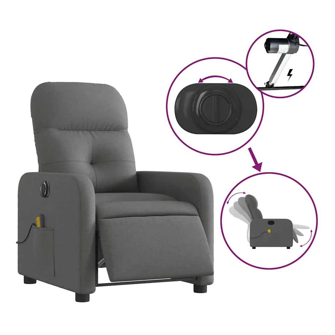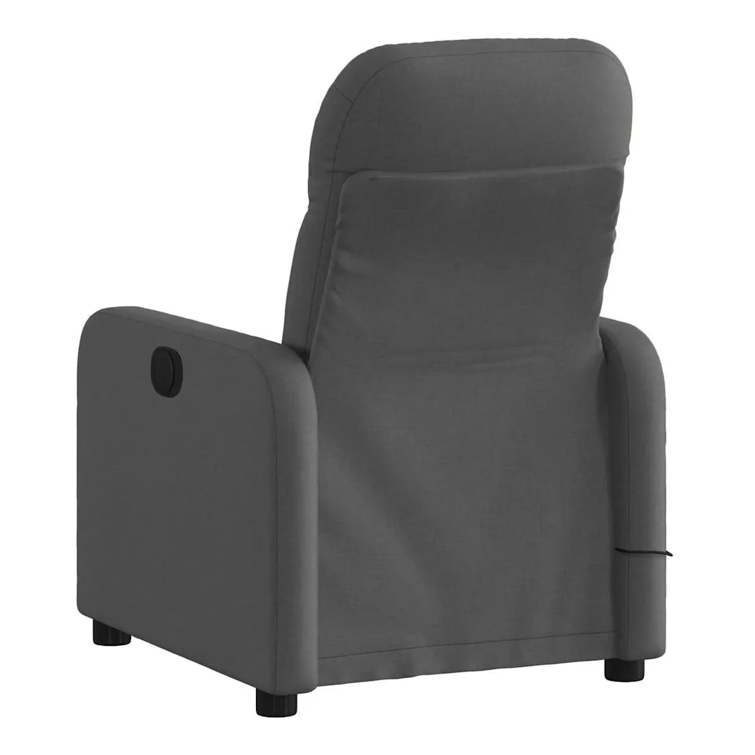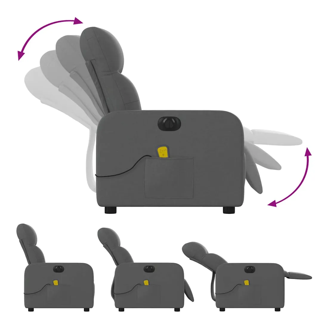 Asseyez-vous et détendez-vous dans ce fauteuil inclinable de massage électrique très confortable ! Fonction d'inclinaison électrique : ce fauteuil inclinable est équipé d'un moteur électrique qui permet de régler automatiquement le repose-pied et le dossier dans n'importe quelle position, selon votre confort, en appuyant simplement sur le bouton situé sur le côté du fauteuil. Cette fonction permet une inclinaison maximale de 135 degrés. En outre, le dossier peut revenir automatiquement à sa position d'origine par une simple pression sur le bouton.Fonction de vibration : les 6 points de massage vous permettent de faire l'expérience d'un massage mieux ciblé. De plus, la télécommande incluse vous permet de choisir différents programmes de massage. La fonction de massage est alimentée par le connecteur USB qui nécessite une source d'alimentation USB certifiée de 5 V (non fournie).Expérience d'assise confortable : le siège, le dossier et les larges accoudoirs bien rembourrés recouverts de tissu procurent une sensation confortable et chaleureuse, vous permettant de vous sentir enveloppé lorsque vous êtes assis. Le tissu présente un aspect simple et épuré et est respirant et durable.Poche latérale pratique : ce fauteuil est doté d'une poche latérale pour ranger votre télécommande ou garder vos objets essentiels à portée de main.Cadre solide et stable : le cadre en bois et en métal offre une structure solide et une grande stabilité. Ce fauteuil inclinable est confortable et durable.
