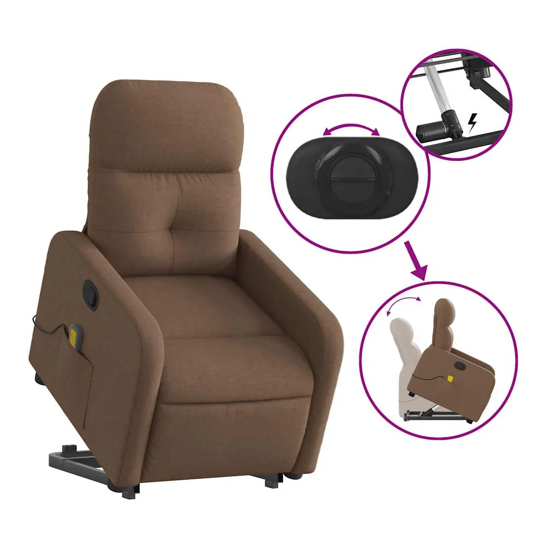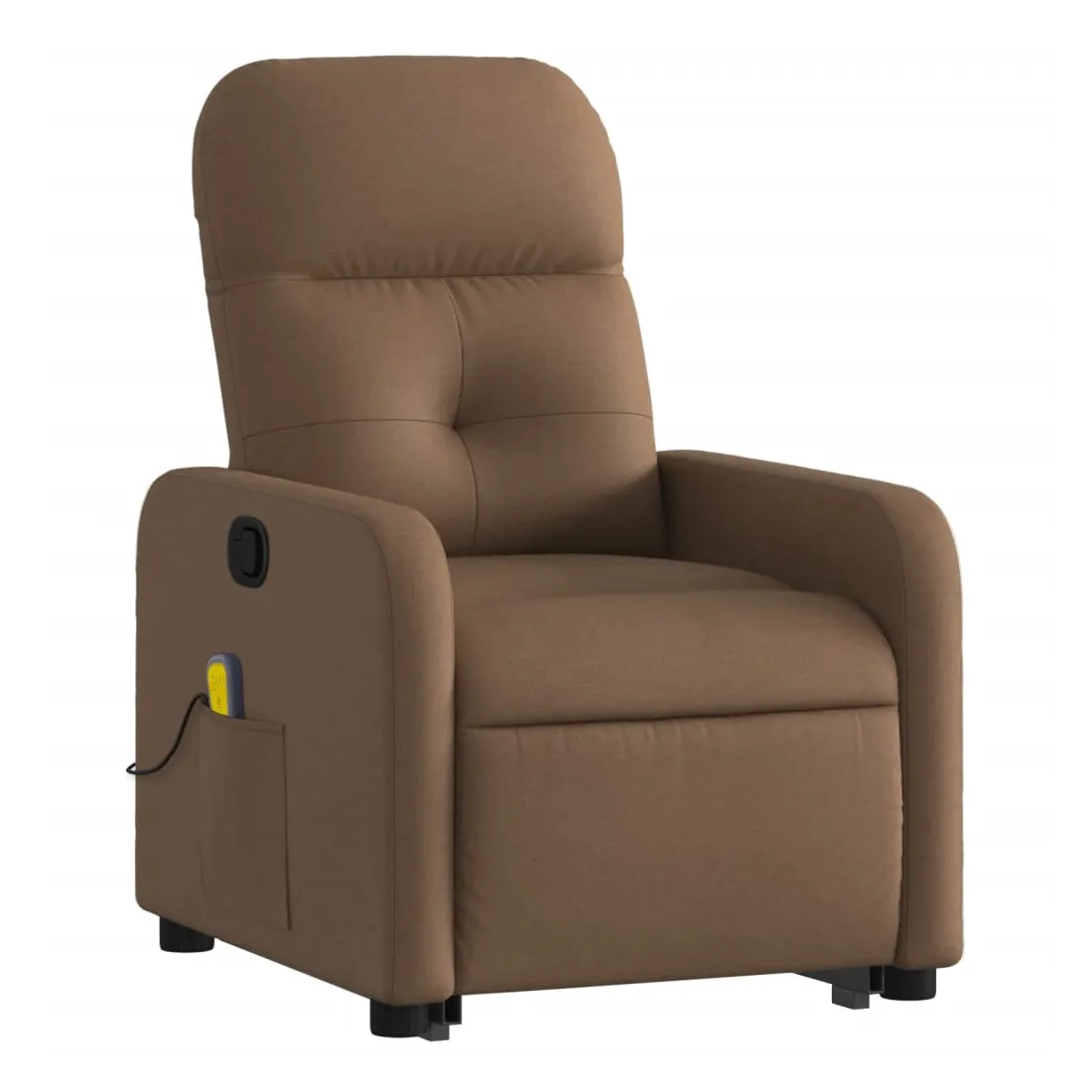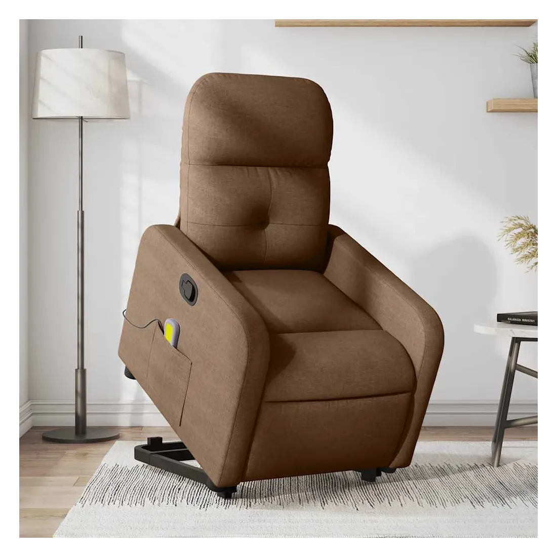 Asseyez-vous et détendez-vous dans ce fauteuil inclinable de massage très confortable ! Fonction de levage électrique : ce fauteuil inclinable pour personnes âgées est équipé d'un moteur électrique pour la fonction de levage. Grâce à la fonction qui pousse toute la chaise vers le haut, vous pouvez facilement vous tenir debout sans stresser votre dos et vos genoux en appuyant simplement sur le bouton.Fonction d'inclinaison manuelle : ce fauteuil inclinable est doté d'une poignée du côté droit. Vous pouvez régler manuellement le repose-pieds et le dossier dans n'importe quelle position selon votre confort en tirant simplement sur la poignée. Cette fonction permet une inclinaison maximale de 135 degrés. De plus, le dossier peut revenir rapidement à sa position d'origine en tirant simplement sur la poignée.Fonction de vibration : les 6 points de massage vous permettent de faire l'expérience d'un massage mieux ciblé. De plus, la télécommande incluse vous permet de choisir différents programmes de massage. La fonction de massage est alimentée par le connecteur USB qui nécessite une source d'alimentation USB certifiée de 5 V (non fournie).Expérience d'assise confortable : le siège, le dossier et les larges accoudoirs bien rembourrés recouverts de tissu procurent une sensation confortable et chaleureuse, vous permettant de vous sentir enveloppé lorsque vous êtes assis. Le tissu présente un aspect simple et épuré et est respirant et durable.Poche latérale pratique : ce fauteuil est doté d'une poche latérale pour ranger votre télécommande ou garder vos objets essentiels à portée de main.Cadre solide et stable : le cadre en bois et en métal offre une structure solide et une grande stabilité. Ce fauteuil inclinable est confortable et durable.