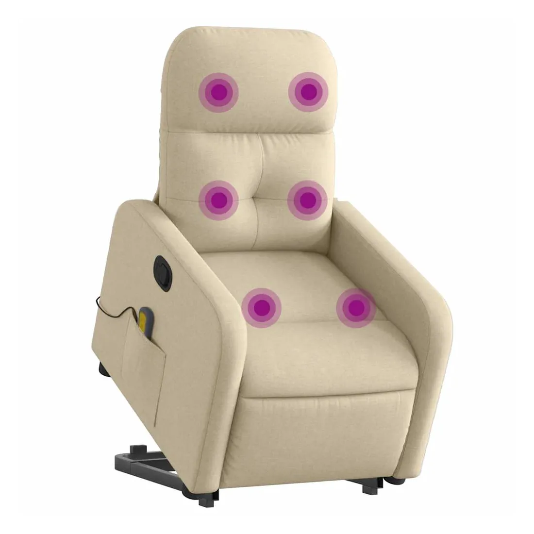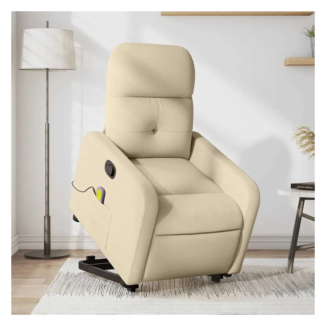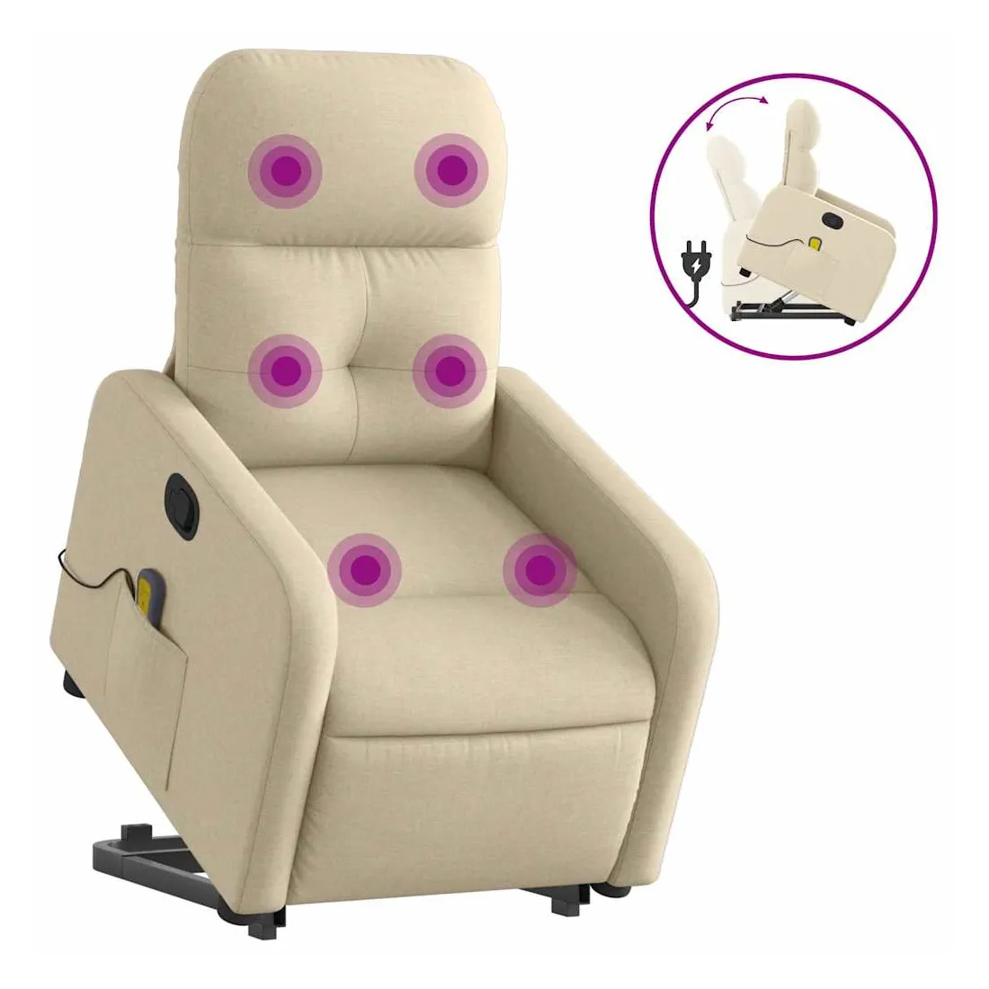 Asseyez-vous et détendez-vous dans ce fauteuil inclinable de massage très confortable ! Fonction de levage électrique : ce fauteuil inclinable pour personnes âgées est équipé d'un moteur électrique pour la fonction de levage. Grâce à la fonction qui pousse toute la chaise vers le haut, vous pouvez facilement vous tenir debout sans stresser votre dos et vos genoux en appuyant simplement sur le bouton.Fonction d'inclinaison manuelle : ce fauteuil inclinable est doté d'une poignée du côté droit. Vous pouvez régler manuellement le repose-pieds et le dossier dans n'importe quelle position selon votre confort en tirant simplement sur la poignée. Cette fonction permet une inclinaison maximale de 135 degrés. De plus, le dossier peut revenir rapidement à sa position d'origine en tirant simplement sur la poignée.Fonction de vibration : les 6 points de massage vous permettent de faire l'expérience d'un massage mieux ciblé. De plus, la télécommande incluse vous permet de choisir différents programmes de massage. La fonction de massage est alimentée par le connecteur USB qui nécessite une source d'alimentation USB certifiée de 5 V (non fournie).Expérience d'assise confortable : le siège, le dossier et les larges accoudoirs bien rembourrés recouverts de tissu procurent une sensation confortable et chaleureuse, vous permettant de vous sentir enveloppé lorsque vous êtes assis. Le tissu présente un aspect simple et épuré et est respirant et durable.Poche latérale pratique : ce fauteuil est doté d'une poche latérale pour ranger votre télécommande ou garder vos objets essentiels à portée de main.Cadre solide et stable : le cadre en bois et en métal offre une structure solide et une grande stabilité. Ce fauteuil inclinable est confortable et durable.