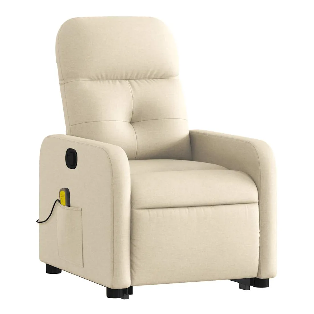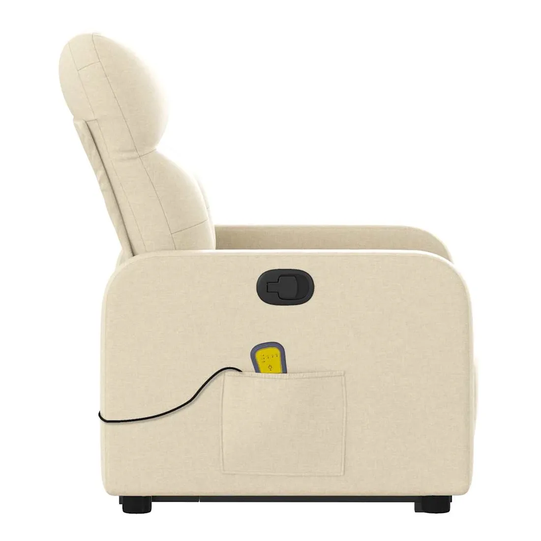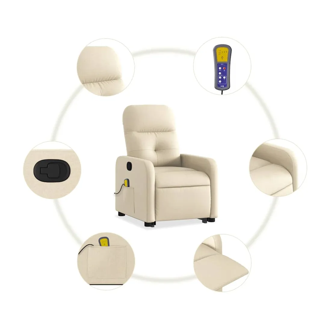 Asseyez-vous et détendez-vous dans ce fauteuil inclinable de massage très confortable ! Fonction de levage électrique : ce fauteuil inclinable pour personnes âgées est équipé d'un moteur électrique pour la fonction de levage. Grâce à la fonction qui pousse toute la chaise vers le haut, vous pouvez facilement vous tenir debout sans stresser votre dos et vos genoux en appuyant simplement sur le bouton.Fonction d'inclinaison manuelle : ce fauteuil inclinable est doté d'une poignée du côté droit. Vous pouvez régler manuellement le repose-pieds et le dossier dans n'importe quelle position selon votre confort en tirant simplement sur la poignée. Cette fonction permet une inclinaison maximale de 135 degrés. De plus, le dossier peut revenir rapidement à sa position d'origine en tirant simplement sur la poignée.Fonction de vibration : les 6 points de massage vous permettent de faire l'expérience d'un massage mieux ciblé. De plus, la télécommande incluse vous permet de choisir différents programmes de massage. La fonction de massage est alimentée par le connecteur USB qui nécessite une source d'alimentation USB certifiée de 5 V (non fournie).Expérience d'assise confortable : le siège, le dossier et les larges accoudoirs bien rembourrés recouverts de tissu procurent une sensation confortable et chaleureuse, vous permettant de vous sentir enveloppé lorsque vous êtes assis. Le tissu présente un aspect simple et épuré et est respirant et durable.Poche latérale pratique : ce fauteuil est doté d'une poche latérale pour ranger votre télécommande ou garder vos objets essentiels à portée de main.Cadre solide et stable : le cadre en bois et en métal offre une structure solide et une grande stabilité. Ce fauteuil inclinable est confortable et durable.