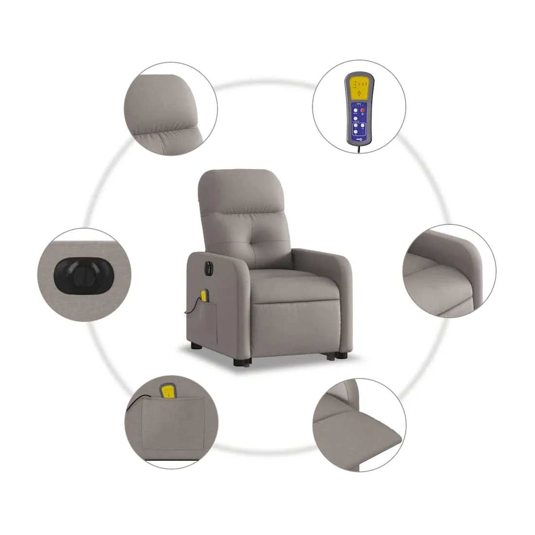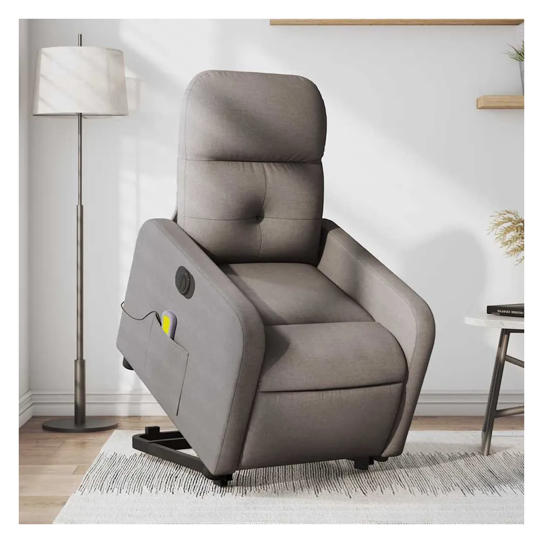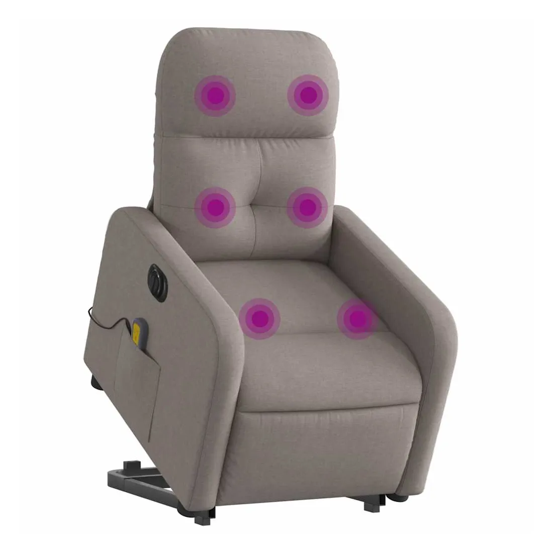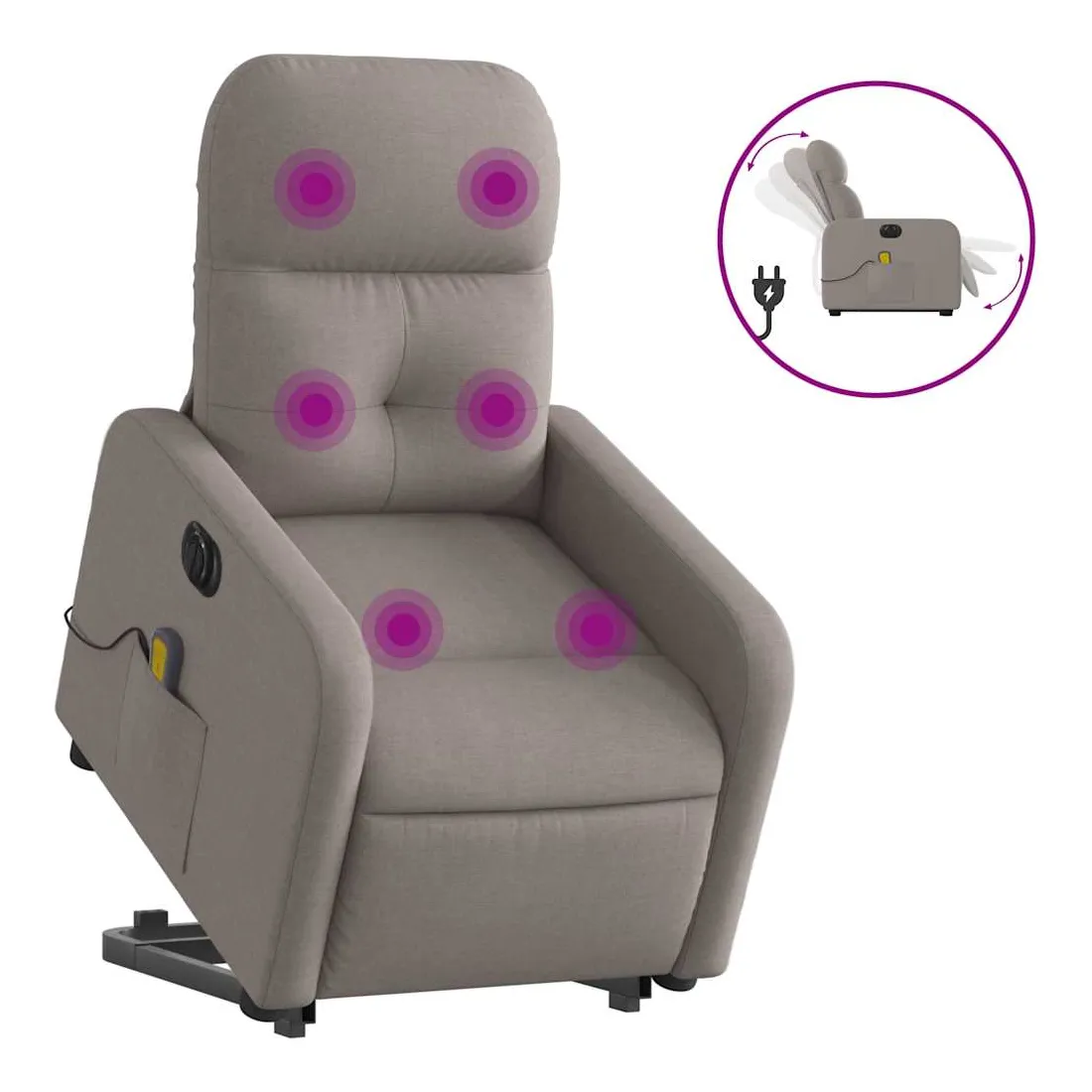 Asseyez-vous et détendez-vous dans ce fauteuil inclinable de massage électrique très confortable ! Fonction de levage électrique : ce fauteuil inclinable pour personnes âgées est équipé d'un moteur électrique pour la fonction de levage. Grâce à la fonction qui pousse toute la chaise vers le haut, vous pouvez facilement vous tenir debout sans stresser votre dos et vos genoux en appuyant simplement sur le bouton.Fonction d'inclinaison électrique : ce fauteuil inclinable est également équipé d'un moteur électrique qui permet de régler automatiquement le repose-pied et le dossier dans n'importe quelle position, selon votre confort, en appuyant simplement sur le bouton situé sur le côté du fauteuil. Cette fonction permet une inclinaison maximale de 135 degrés. En outre, le dossier peut revenir automatiquement à sa position d'origine par une simple pression sur le bouton.Fonction de vibration : les 6 points de massage vous permettent de faire l'expérience d'un massage mieux ciblé. De plus, la télécommande incluse vous permet de choisir différents programmes de massage. La fonction de massage est alimentée par le connecteur USB qui nécessite une source d'alimentation USB certifiée de 5 V (non fournie).Expérience d'assise confortable : le siège, le dossier et les larges accoudoirs bien rembourrés recouverts de tissu procurent une sensation confortable et chaleureuse, vous permettant de vous sentir enveloppé lorsque vous êtes assis. Le tissu présente un aspect simple et épuré et est respirant et durable.Poche latérale pratique : ce fauteuil est doté d'une poche latérale pour ranger votre télécommande ou garder vos objets essentiels à portée de main.