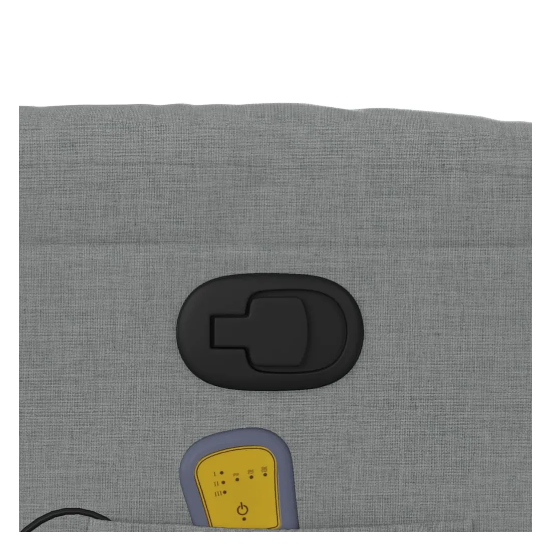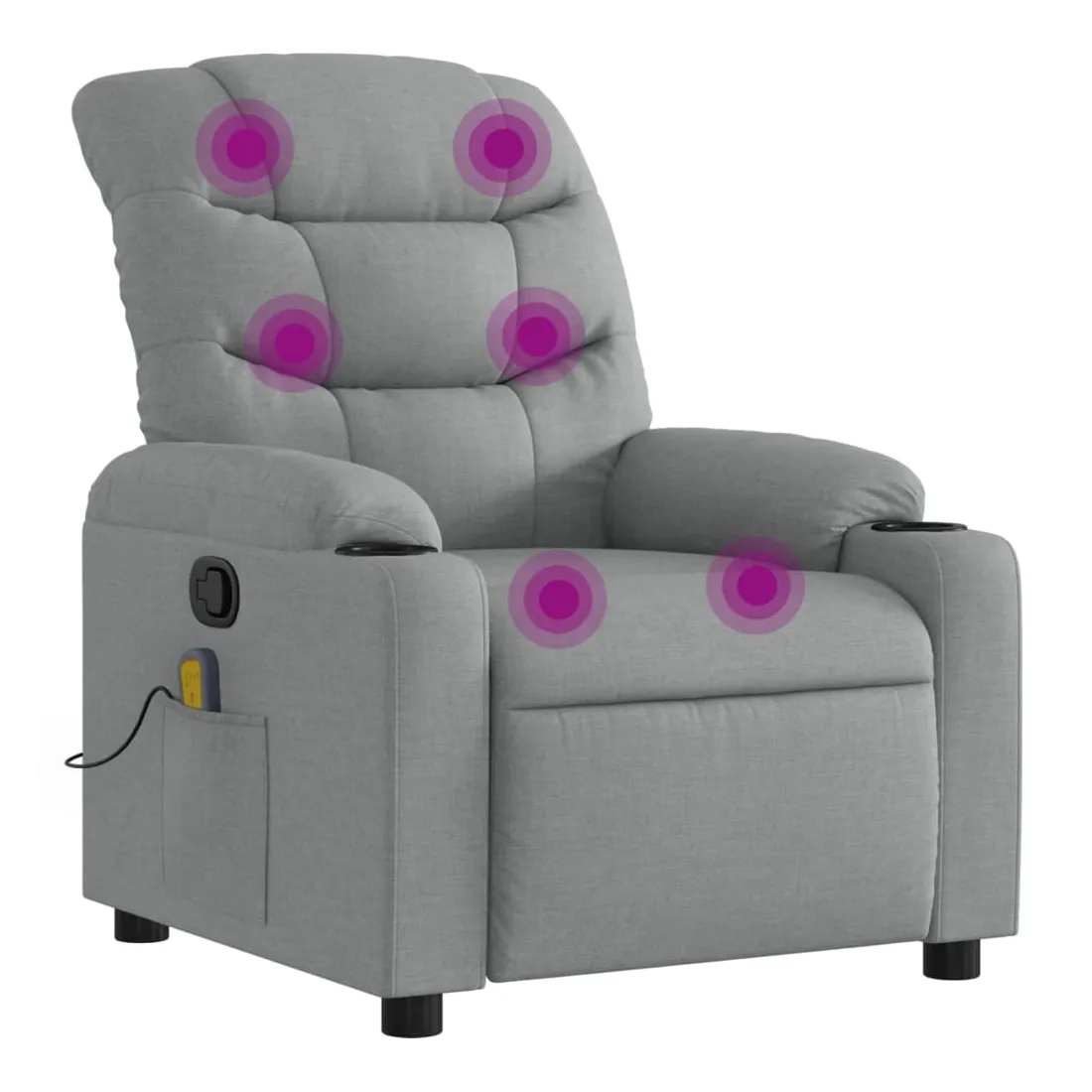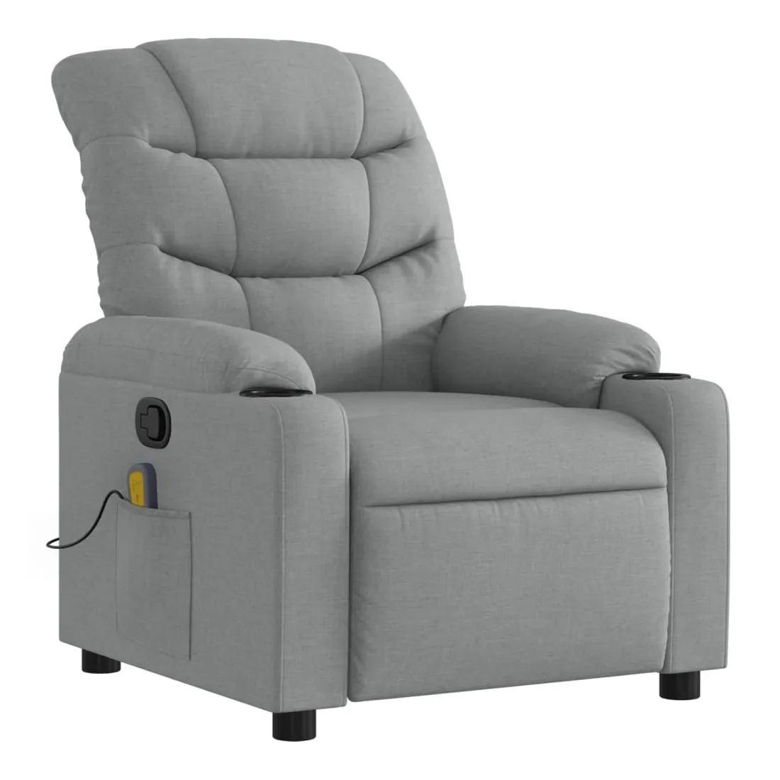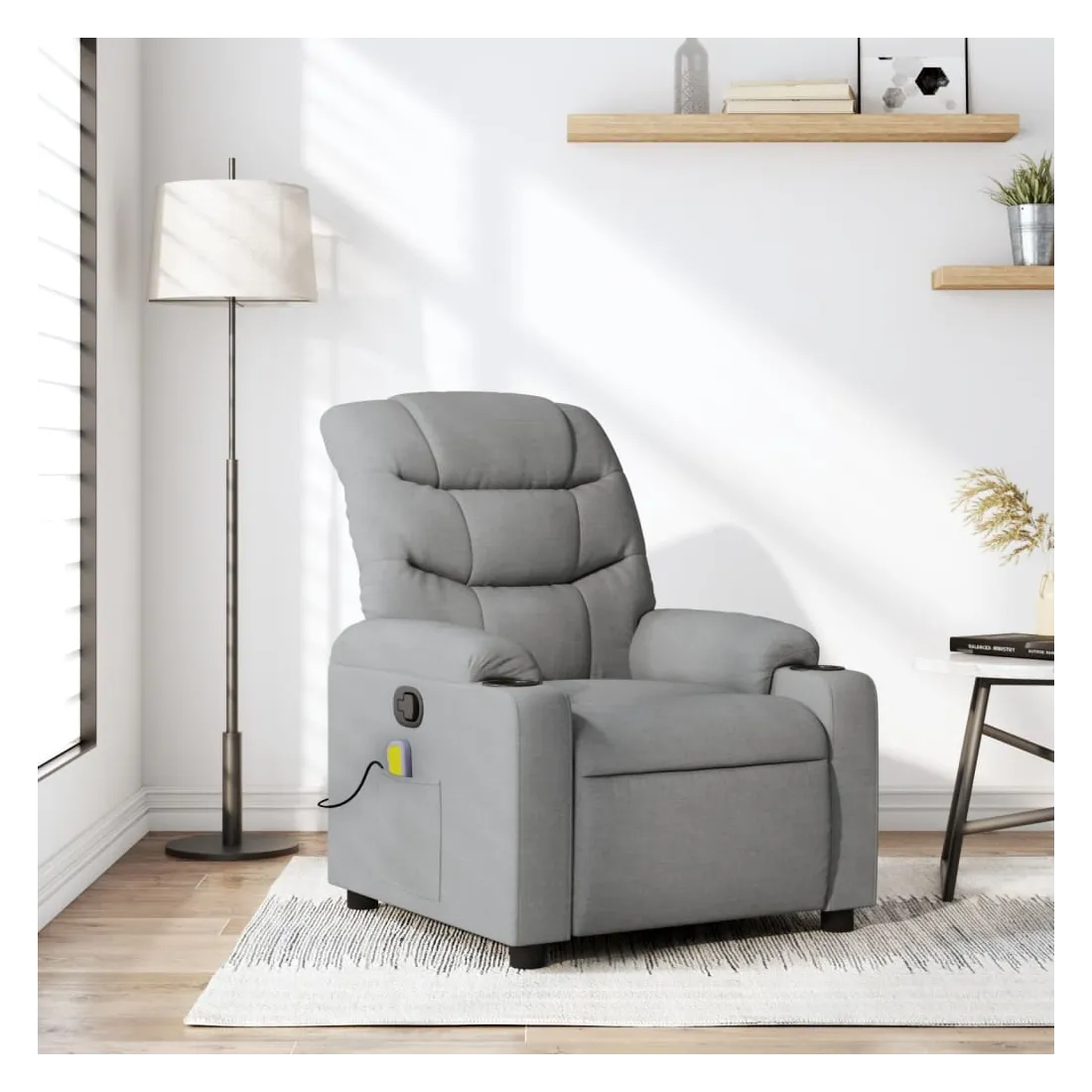 Asseyez-vous et détendez-vous dans ce fauteuil inclinable de massage très confortable ! Fonction d'inclinaison manuelle : ce fauteuil inclinable est doté d'une poignée du côté droit. Vous pouvez régler manuellement le repose-pieds et le dossier dans n'importe quelle position selon votre confort en tirant simplement sur la poignée. Cette fonction permet une inclinaison maximale de 135 degrés. De plus, le dossier peut revenir rapidement à sa position d'origine en tirant simplement sur la poignée.Fonction de vibration : les 6 points de massage vous permettent de faire l'expérience d'un massage mieux ciblé. De plus, la télécommande incluse vous permet de choisir différents programmes de massage. La fonction de massage est alimentée par le connecteur USB, mais la source d'alimentation USB 5V certifiée n'est pas incluse.Expérience d'assise confortable : le siège, le dossier et les larges accoudoirs bien rembourrés recouverts de tissu procurent une sensation confortable et chaleureuse, vous permettant de vous sentir enveloppé lorsque vous êtes assis. Le tissu présente un aspect simple et épuré et est respirant et durable.Porte-gobelets et poche latérale pratiques : ce fauteuil dispose de deux porte-gobelets pratiques pour vos boissons et d'une poche latérale pour votre télécommande ou pour garder vos objets essentiels à portée de main.Cadre solide et stable : le cadre en bois et en métal offre une structure solide et une grande stabilité. Ce fauteuil inclinable est confortable et durable.