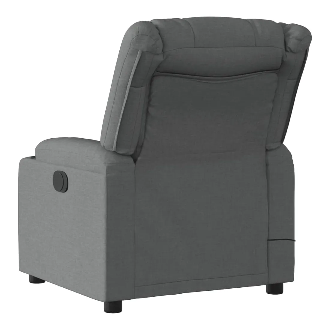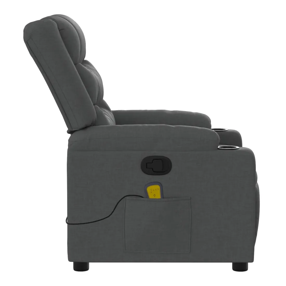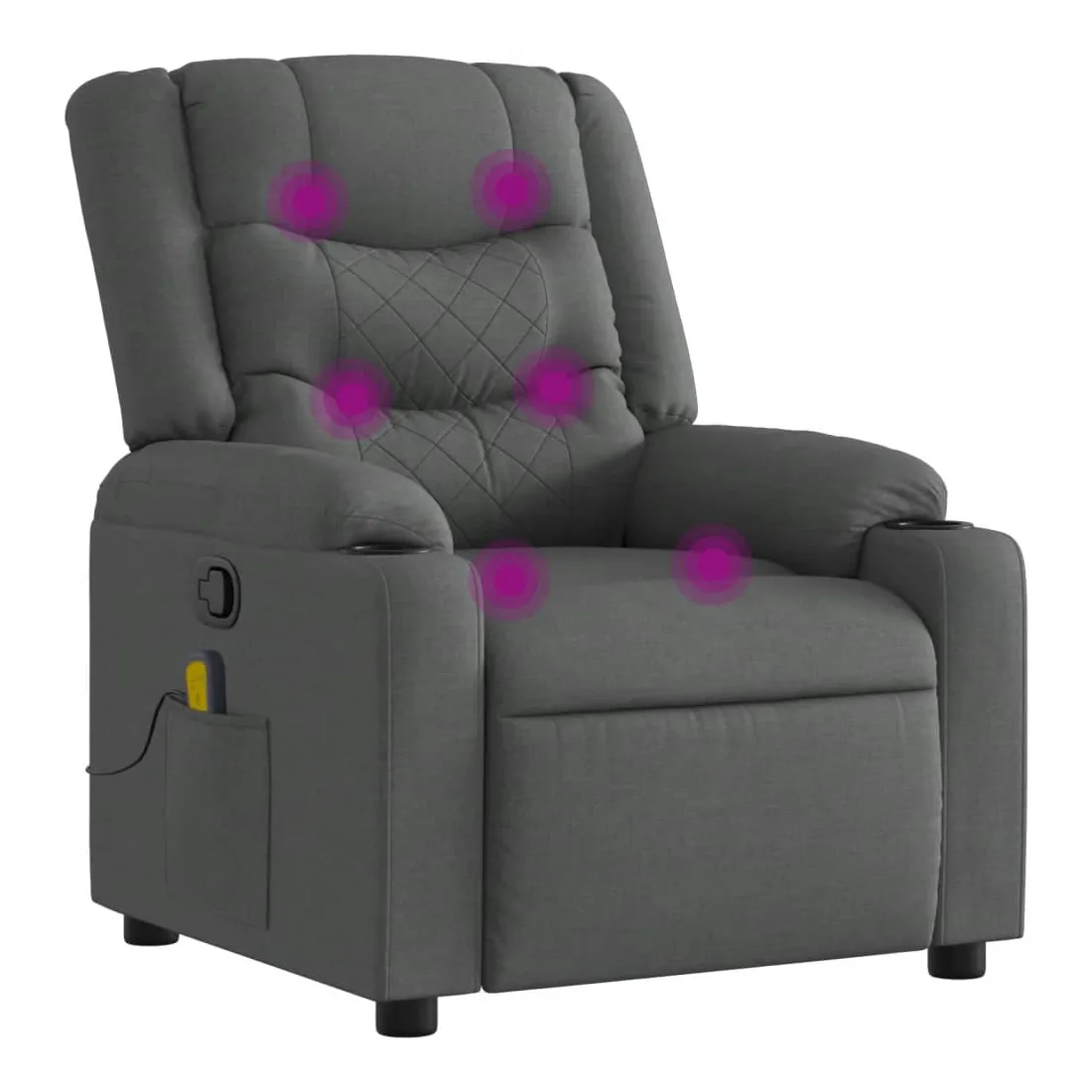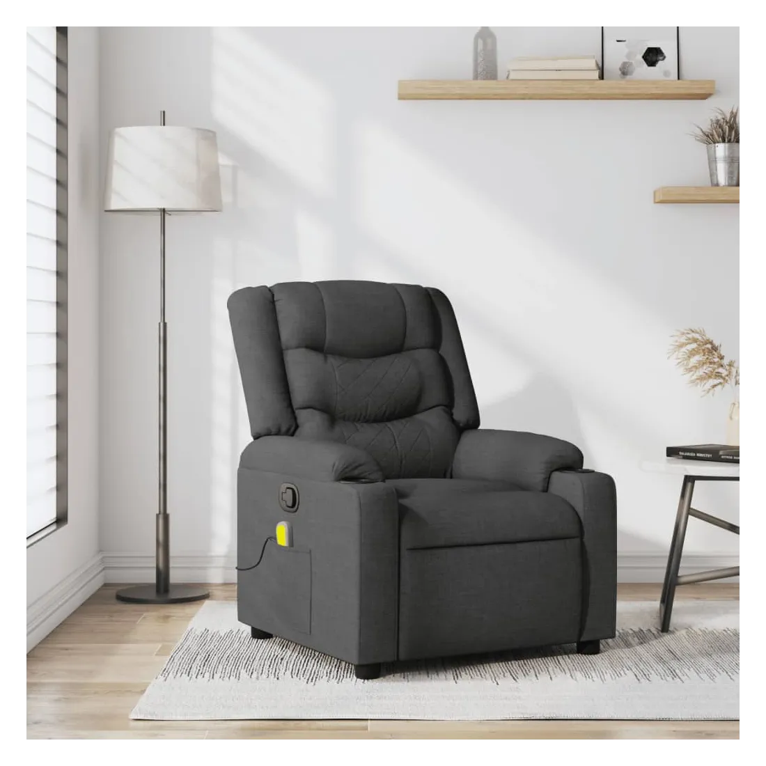 Asseyez-vous et détendez-vous dans ce fauteuil inclinable de massage très confortable ! Fonction d'inclinaison manuelle : ce fauteuil inclinable est doté d'une poignée du côté droit. Vous pouvez régler manuellement le repose-pieds et le dossier dans n'importe quelle position selon votre confort en tirant simplement sur la poignée. Cette fonction permet une inclinaison maximale de 135 degrés. De plus, le dossier peut revenir rapidement à sa position d'origine en tirant simplement sur la poignée.Fonction de vibration : les 6 points de massage vous permettent de faire l'expérience d'un massage mieux ciblé. De plus, la télécommande incluse vous permet de choisir différents programmes de massage. La fonction de massage est alimentée par le connecteur USB, mais la source d'alimentation USB 5V certifiée n'est pas incluse.Expérience d'assise confortable : le siège, le dossier et les larges accoudoirs bien rembourrés recouverts de tissu procurent une sensation confortable et chaleureuse, vous permettant de vous sentir enveloppé lorsque vous êtes assis. Le tissu présente un aspect simple et épuré et est respirant et durable.Porte-gobelets et poche latérale pratiques : ce fauteuil dispose de deux porte-gobelets pratiques pour vos boissons et d'une poche latérale pour votre télécommande ou pour garder vos objets essentiels à portée de main.Cadre solide et stable : le cadre en bois et en métal offre une structure solide et une grande stabilité. Ce fauteuil inclinable est confortable et durable.