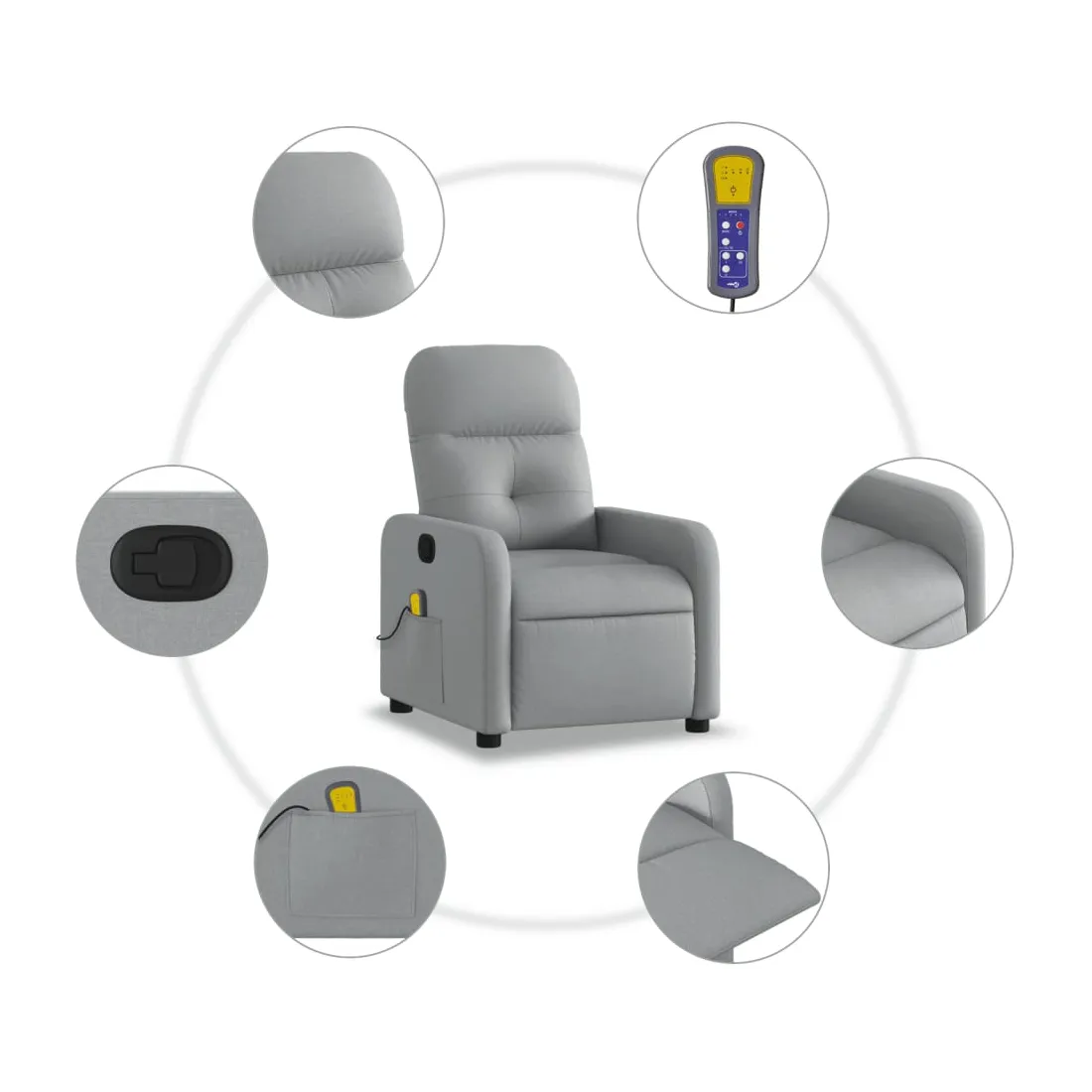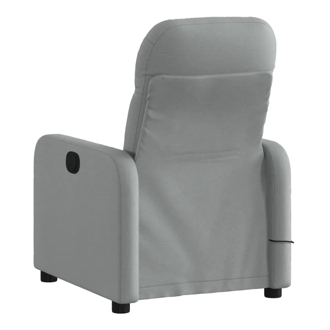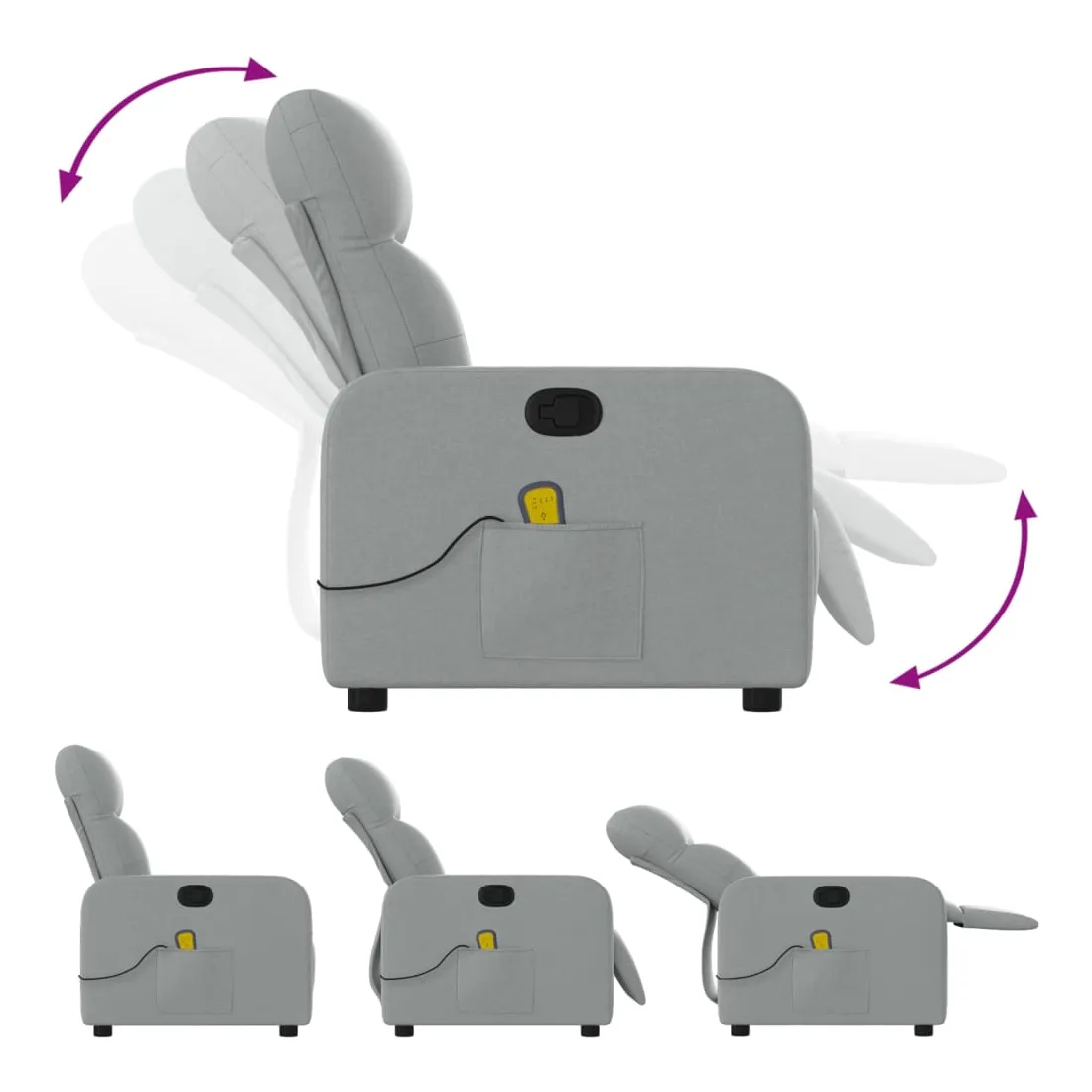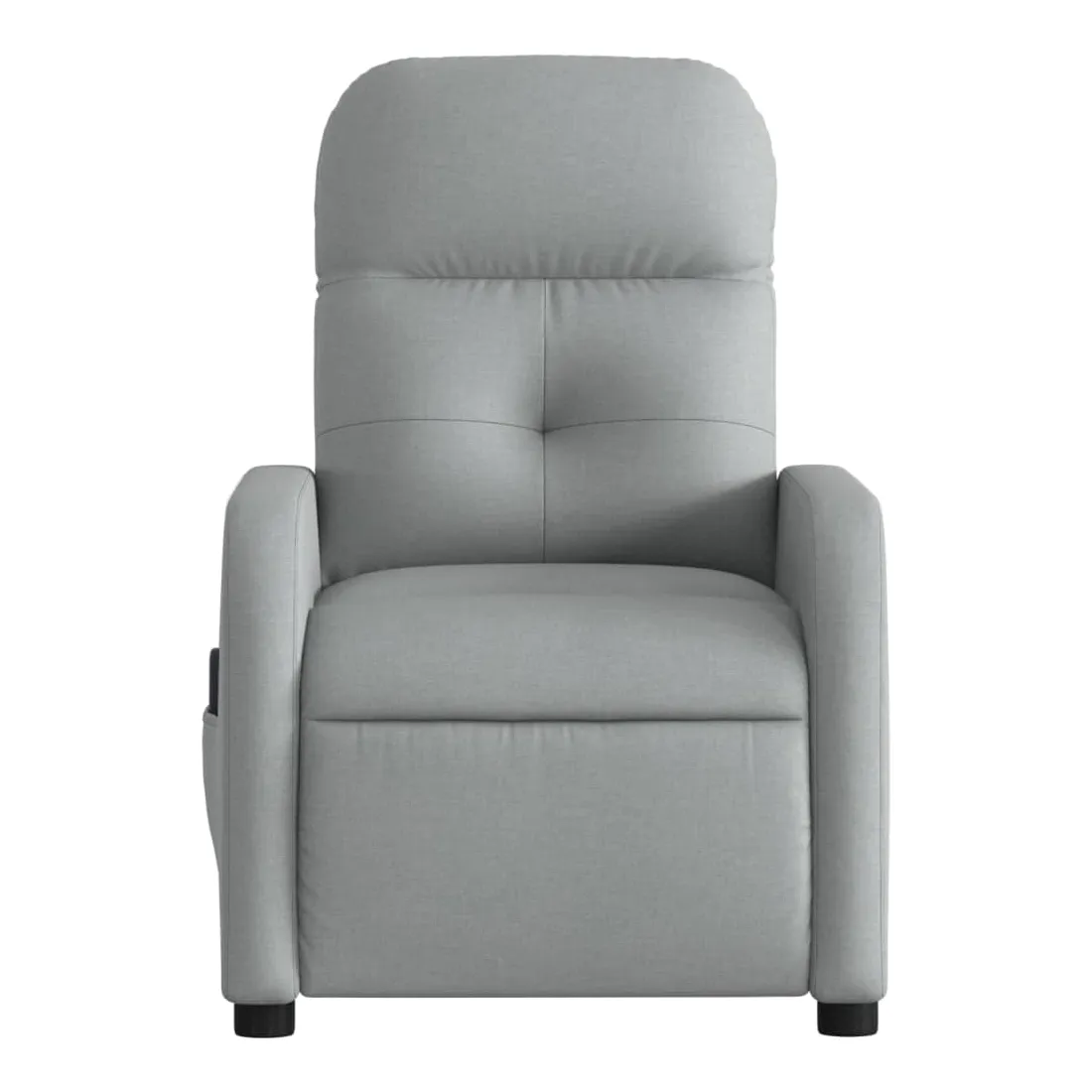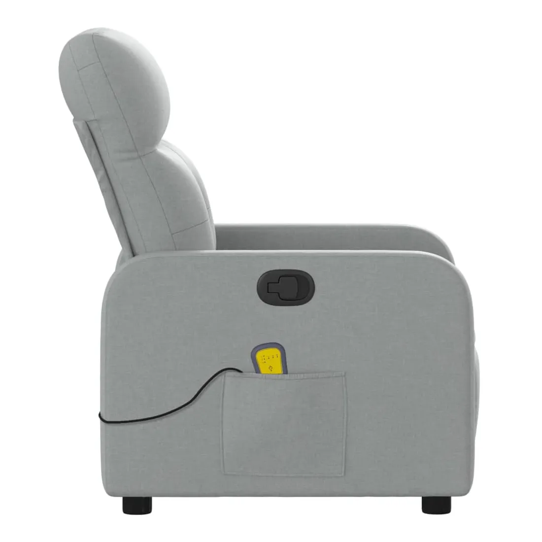 Asseyez-vous et détendez-vous dans ce fauteuil inclinable de massage très confortable ! Fonction d'inclinaison manuelle : ce fauteuil inclinable est doté d'une poignée du côté droit. Vous pouvez régler manuellement le repose-pieds et le dossier dans n'importe quelle position selon votre confort en tirant simplement sur la poignée. Cette fonction permet une inclinaison maximale de 135 degrés. De plus, le dossier peut revenir rapidement à sa position d'origine en tirant simplement sur la poignée.Fonction de vibration : les 6 points de massage vous permettent de faire l'expérience d'un massage mieux ciblé. De plus, la télécommande incluse vous permet de choisir différents programmes de massage. La fonction de massage est alimentée par le connecteur USB, mais la source d'alimentation USB 5V certifiée n'est pas incluse.Expérience d'assise confortable : le siège, le dossier et les larges accoudoirs bien rembourrés recouverts de tissu procurent une sensation confortable et chaleureuse, vous permettant de vous sentir enveloppé lorsque vous êtes assis. Le tissu présente un aspect simple et épuré et est respirant et durable.Poche latérale pratique : ce fauteuil est doté d'une poche latérale pour ranger votre télécommande ou garder vos objets essentiels à portée de main.Cadre solide et stable : le cadre en bois et en métal offre une structure solide et une grande stabilité. Ce fauteuil inclinable est confortable et durable.