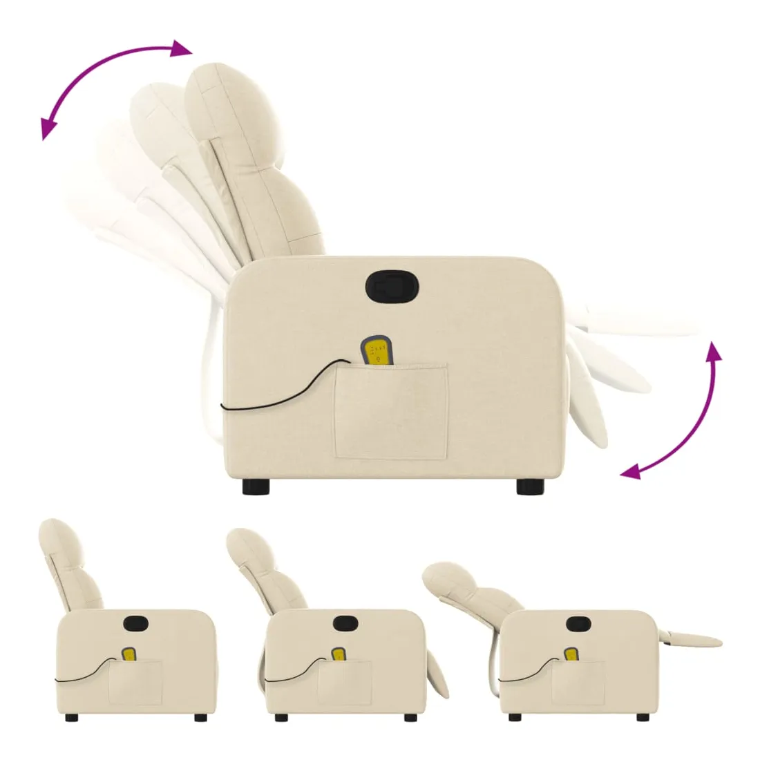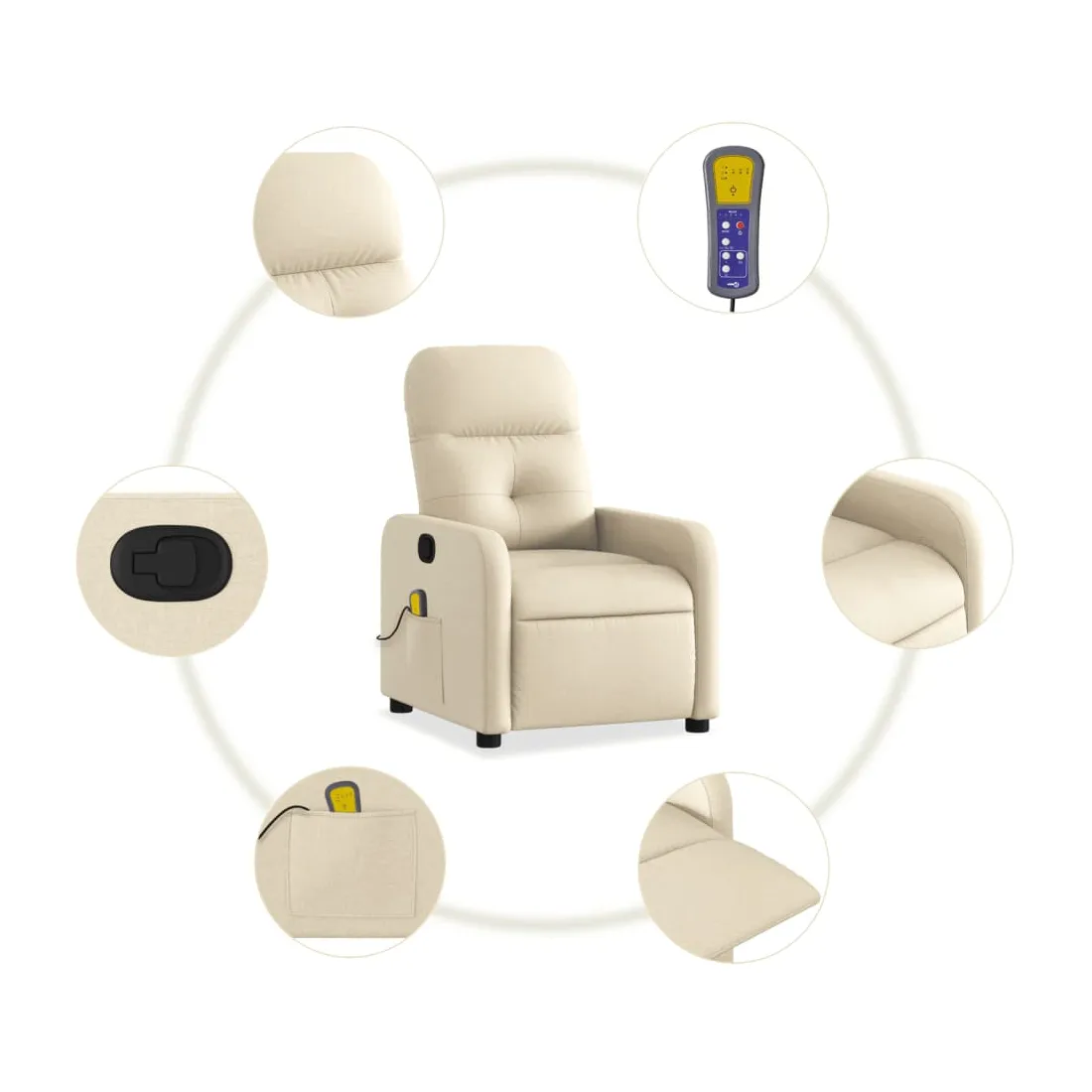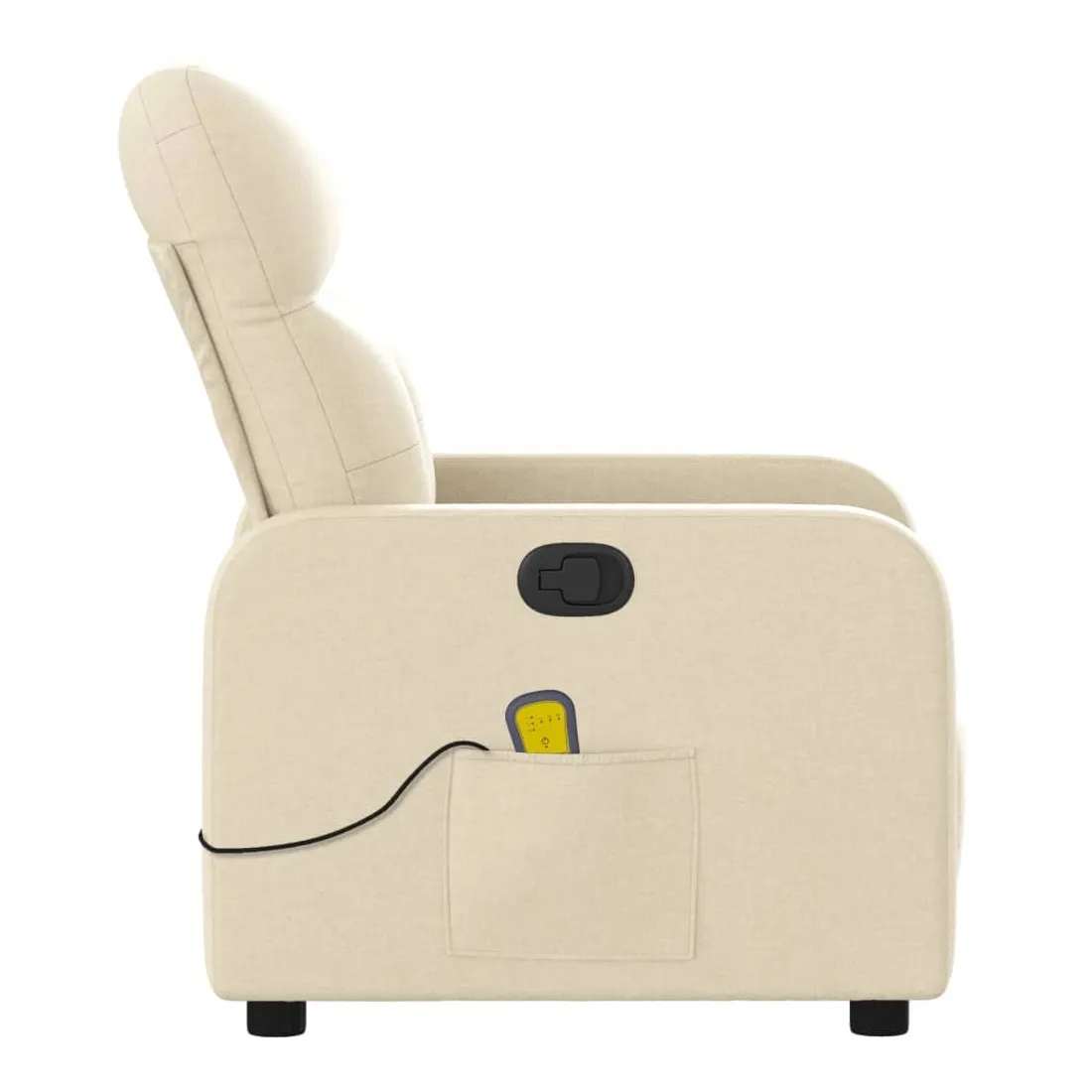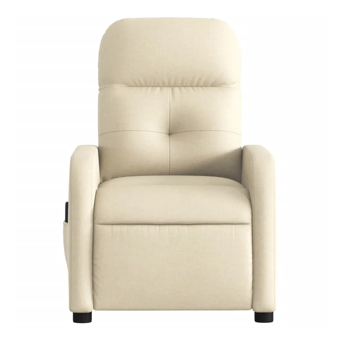 Asseyez-vous et détendez-vous dans ce fauteuil inclinable de massage très confortable ! Fonction d'inclinaison manuelle : ce fauteuil inclinable est doté d'une poignée du côté droit. Vous pouvez régler manuellement le repose-pieds et le dossier dans n'importe quelle position selon votre confort en tirant simplement sur la poignée. Cette fonction permet une inclinaison maximale de 135 degrés. De plus, le dossier peut revenir rapidement à sa position d'origine en tirant simplement sur la poignée.Fonction de vibration : les 6 points de massage vous permettent de faire l'expérience d'un massage mieux ciblé. De plus, la télécommande incluse vous permet de choisir différents programmes de massage. La fonction de massage est alimentée par le connecteur USB, mais la source d'alimentation USB 5V certifiée n'est pas incluse.Expérience d'assise confortable : le siège, le dossier et les larges accoudoirs bien rembourrés recouverts de tissu procurent une sensation confortable et chaleureuse, vous permettant de vous sentir enveloppé lorsque vous êtes assis. Le tissu présente un aspect simple et épuré et est respirant et durable.Poche latérale pratique : ce fauteuil est doté d'une poche latérale pour ranger votre télécommande ou garder vos objets essentiels à portée de main.Cadre solide et stable : le cadre en bois et en métal offre une structure solide et une grande stabilité. Ce fauteuil inclinable est confortable et durable.