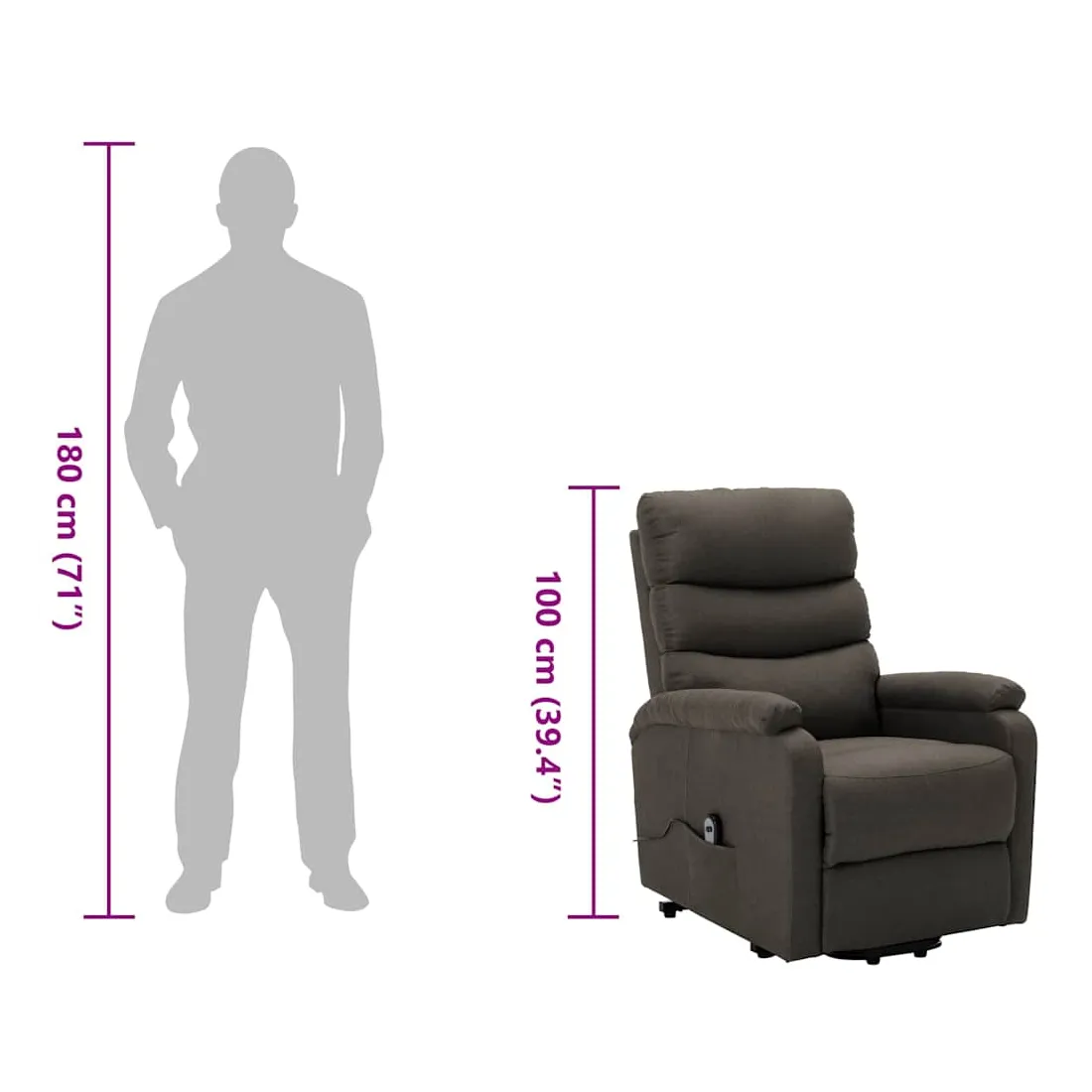 Asseyez-vous et détendez-vous dans ce fauteuil très confortable ! Fonction d'inclinaison manuelle : le fauteuil inclinable est spécialement conçu avec 3 positions d'inclinaison afin que vous puissiez régler manuellement le dossier et le repose-pieds selon votre confort.Fonction de levage électrique : ce fauteuil inclinable pour personnes âgées est équipé d'un moteur électrique pour la fonction de levage. Grâce à la fonction qui pousse toute la chaise vers le haut, vous pouvez facilement vous tenir debout sans stresser votre dos et vos genoux grâce à la commande manuelle à 2 boutons.Expérience d'assise confortable : le siège, le dossier et les larges accoudoirs rembourrés épais recouverts de tissu procurent une sensation confortable et chaleureuse, vous permettant de vous sentir enveloppé lorsque vous êtes assis. Le tissu présente un aspect simple et épuré, et est respirant et durable.Cadre solide et stable : le cadre en bois et en métal offre une structure solide et une grande stabilité. Ce fauteuil inclinable est confortable et durable.