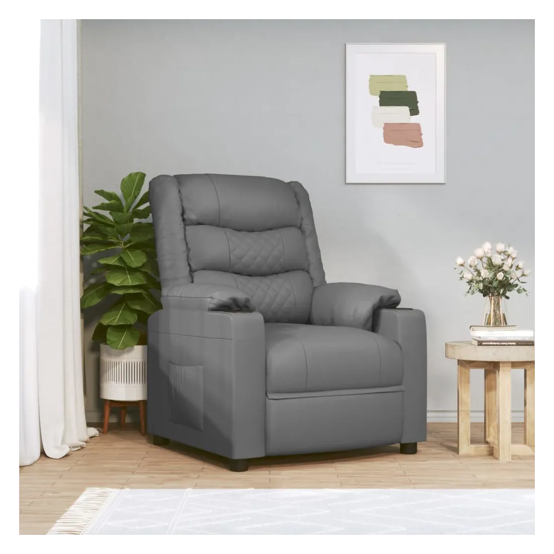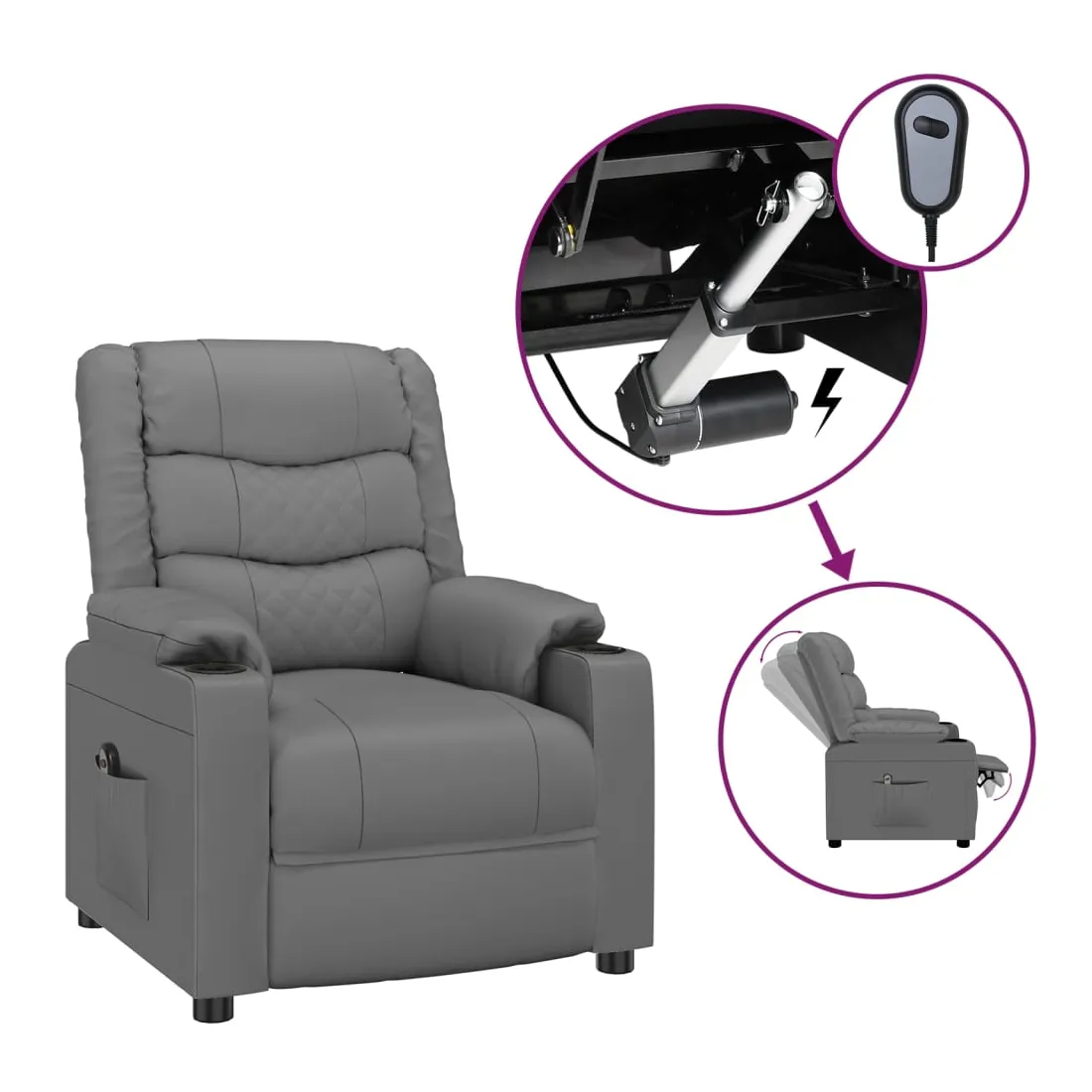 Asseyez-vous et détendez-vous dans ce fauteuil inclinable électrique très confortable ! Fonction d'inclinaison électrique : le fauteuil inclinable est équipé d'un moteur électrique pour la fonction d'inclinaison. Il offre 3 positions d'inclinaison et vous pouvez facilement régler le dossier et le repose-pied à l'aide de la commande manuelle à 2 boutons incluse, en fonction de votre confort.Expérience de siège confortable : le siège, le dossier et les larges accoudoirs rembourrés épais recouverts de similicuir procurent une sensation confortable et chaleureuse, vous faisant vous sentir enlacé lorsque vous êtes assis. Le simili cuir est un matériau très résistant. Il est résistant aux taches, ce qui le rend facile à nettoyer avec un chiffon humide. La surface lisse donne également un aspect luxueux et la beauté du cuir véritable.Cadre solide et stable : le cadre en bois et en métal offre une structure solide et une grande stabilité. Ce fauteuil inclinable est confortable et durable.