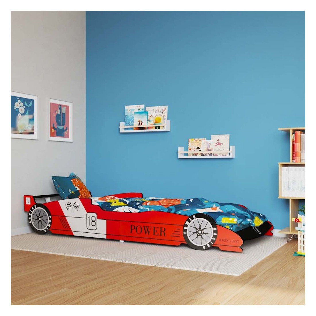 Ce lit pour enfants avec une conception de voiture de course attrayante et une construction solide sera un véritable élément attrayant dans la chambre à coucher de votre enfant. Confortable, fonctionnel et esthétique, ce lit est conçu pour assurer le plus grand confort et une sécurité maximale pour les enfants. Fabriqué à partir de matériaux de haute qualité, ce lit est doté d'une construction solide et robuste. Il est conçu avec des garde-corps des deux côtés pour empêcher votre enfant de tomber du lit. Les lattes robustes offrent le support nécessaire et peuvent résister à l'usure quotidienne. L'assemblage est facile. Le lit convient aux matelas mesurant 90 x 200 cm. Veuillez noter que la livraison inclut le cadre de lit seulement ; un matelas n'est pas inclus.