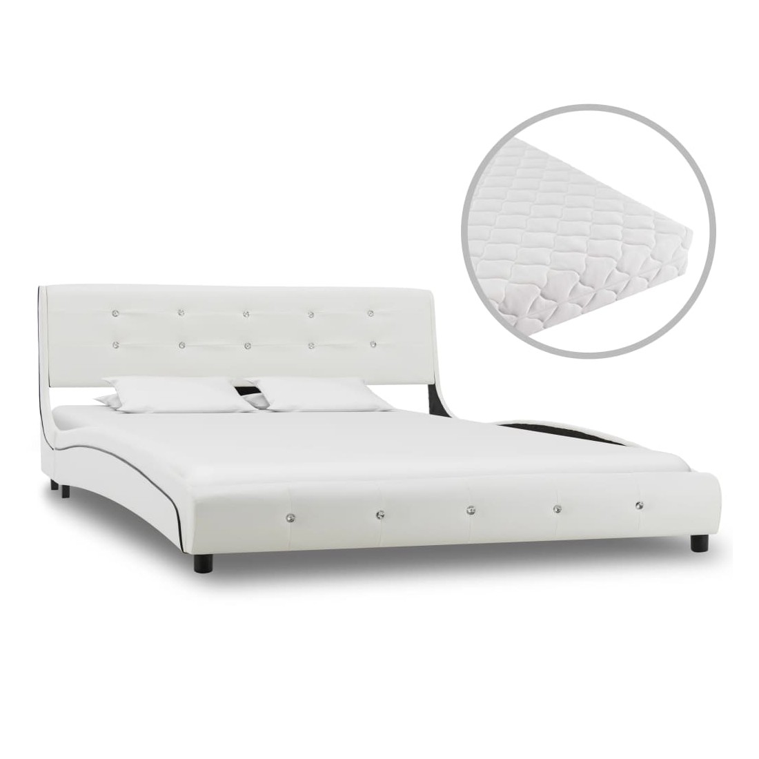 Ce cadre de lit classique deviendra l'attraction principale de votre chambre à coucher. Se distinguant par un design sobre mais élégant, ce cadre de lit ajoute une touche de charme élégant à la décoration de votre chambre à coucher. Fabriqué en fer et en bois, ce cadre de lit est extrêmement robuste et durable. Les pieds en acier enduit de poudre ajoutent une durabilité supplémentaire au lit. De plus, recouvert de similicuir durable, le lit dégage un aspect accueillant et se nettoie facilement. Comportant une épaisseur supplémentaire d'env. 17 cm, le matelas inclus est doux et confortable et a une housse rembourrée et lavable. Il répartit automatiquement votre poids et réduit le stress sur les points de pression de votre corps. Il est fortement recommandé pour soulager les douleurs articulaires, l'insomnie, les maux de dos et les douleurs au cou. La couche supérieure du matelas absorbe l'humidité et offre une bonne isolation thermique. De plus, la housse lavable rend le matelas facile à nettoyer, lui permettant de rester toujours hygiénique. Le matelas est constitué de 3 couches, de haut en bas : housse rembourrée lavable d'1 cm, mousse 30 D de 15 cm, housse rembourrée lavable d'1 cm. Remarque : pour des raisons d'hygiène, le matelas ne peut pas être retourné si l'emballage a été ouvert ou enlevé.