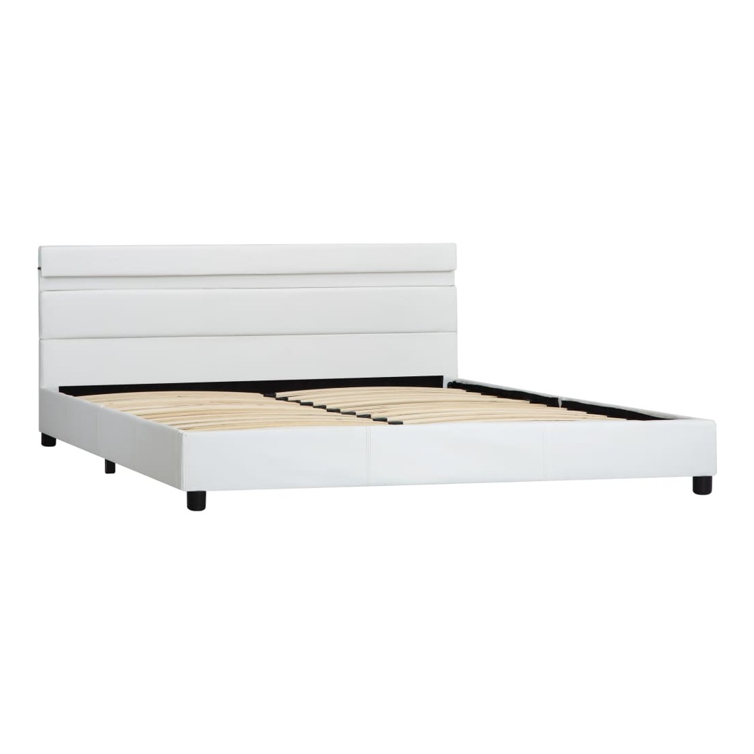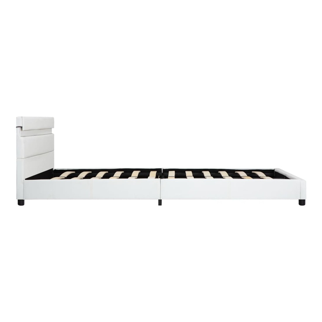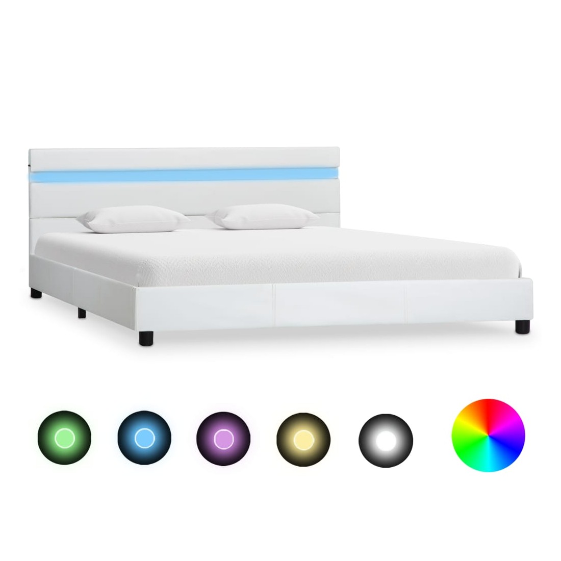 Ajoutez instantanément un goût moderne impressionnant à votre chambre à coucher avec notre cadre de lit en faux cuir ! Distingué par un design simple mais intemporel, le cadre de lit ajoute une touche de charme élégant à la décoration de votre chambre à coucher. La structure en fer enduit de poudre et les lattes de bois renforcent la solidité et la durabilité du lit. Rembourré de similicuir durable et facile à nettoyer, le lit dégage un look accueillant. De plus, avec sa bande à LED changeant de couleur sur la tête de lit, le lit apportera une touche vraiment pratique et décorative à votre chambre à coucher. Avec la télécommande fonctionnelle à 24 touches fournie, vous pouvez facilement régler l’alimentation, la luminosité et les différentes couleurs clignotantes de la bande lumineuse à LED pour créer un spectacle de lumière époustouflant. Le lit rembourré convient à un matelas de 120 x 200 cm. Veuillez noter que la livraison inclut un cadre de lit seulement ; un matelas n'est pas inclus. Le lit est facile à assembler. Vous pouvez chercher le matelas correspondant dans notre boutique. Remarque : ce produit est doté d'un connecteur USB, mais la source d'alimentation certifiée de USB 5V n'est pas incluse.