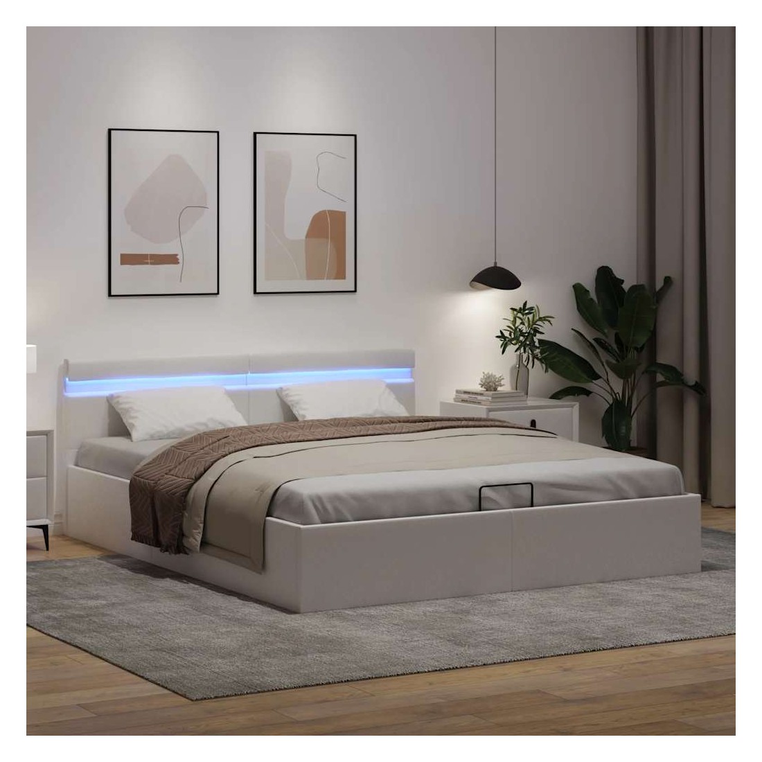 Ajoutez instantanément un goût moderne impressionnant à votre chambre à coucher grâce à notre cadre de lit en similicuir hydraulique ! Ce lit double se caractérise par un design simple mais élégant, ainsi que par une construction solide, car il est fabriqué en MDF robuste et résistant. Ce lit rembourré transforme l'espace inutilisé sous le matelas en espace de rangement, avec suffisamment d'espace pour ranger les vêtements, les draps, les couvertures, etc. Le mécanisme de levage à gaz hydraulique facilite le soulèvement du matelas. Le sommier à lattes restera droit une fois soulevé pour vous laisser les deux mains libres d'enlever ou de stocker des articles en dessous. Le cadre en acier enduit de poudre et les lattes en contreplaqué ajoutent à la robustesse et à la durabilité du lit. Rembourré de similicuir brillant, ce lit semble accueillant et facile à entretenir. Ce meuble de chambre à coucher convient à un matelas de 160 x 200 cm. Ce lit est équipé de lumières LED qui peuvent être facilement réglées pour créer un spectacle lumineux personnalisé. Vous pouvez personnaliser les modes, les couleurs et la luminosité pour améliorer l'ambiance de votre espace intérieur. Ce produit est facile à assembler. Veuillez noter que la livraison inclut un cadre de lit seulement ; un matelas n'est pas inclus. Vous pouvez chercher le matelas correspondant dans notre boutique. Remarque : ce produit est doté d'un connecteur USB, mais la source d'alimentation certifiée de USB 5V n'est pas incluse.