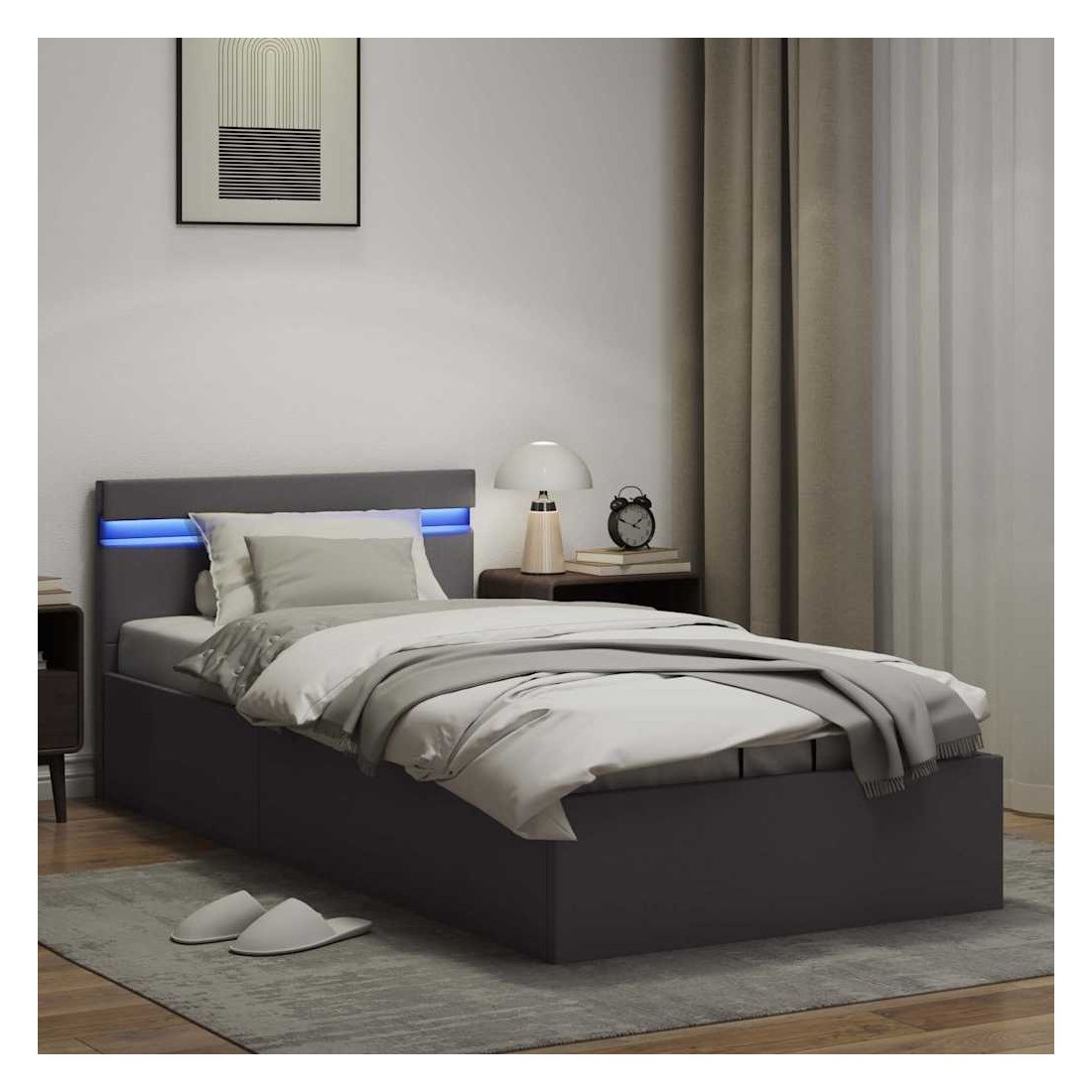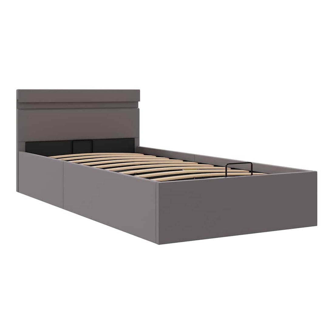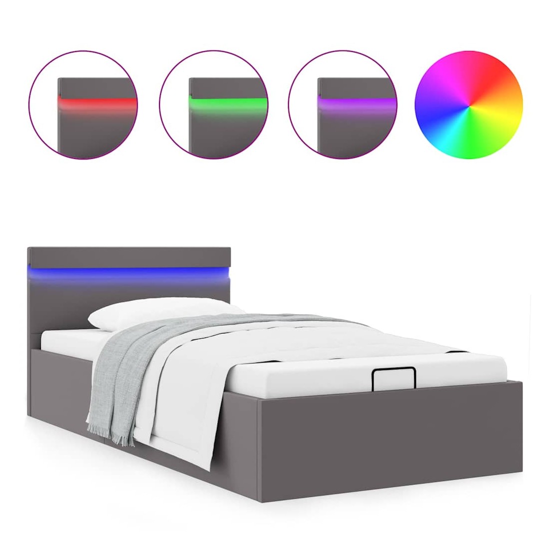 Ajoutez instantanément un goût moderne impressionnant à votre chambre à coucher grâce à notre cadre de lit en similicuir hydraulique ! Ce lit simple se caractérise par un design simple mais élégant, ainsi que par une construction solide, car il est fabriqué en MDF robuste et résistant. Ce lit rembourré transforme l'espace inutilisé sous le matelas en espace de rangement, avec suffisamment d'espace pour ranger les vêtements, les draps, les couvertures, etc. Le mécanisme de levage à gaz hydraulique facilite le soulèvement du matelas. Le sommier à lattes restera droit une fois soulevé pour vous laisser les deux mains libres d'enlever ou de stocker des articles en dessous. Le cadre en acier enduit de poudre et les lattes en contreplaqué ajoutent à la robustesse et à la durabilité du lit. Rembourré de similicuir brillant, ce lit semble accueillant et facile à entretenir. Ce meuble de chambre à coucher convient à un matelas de 90 x 200 cm. Ce lit est équipé de lumières LED qui peuvent être facilement réglées pour créer un spectacle lumineux personnalisé. Vous pouvez personnaliser les modes, les couleurs et la luminosité pour améliorer l'ambiance de votre espace intérieur. Ce produit est facile à assembler. Veuillez noter que la livraison inclut un cadre de lit seulement ; un matelas n'est pas inclus. Vous pouvez chercher le matelas correspondant dans notre boutique. Remarque : ce produit est doté d'un connecteur USB, mais la source d'alimentation certifiée de USB 5V n'est pas incluse.