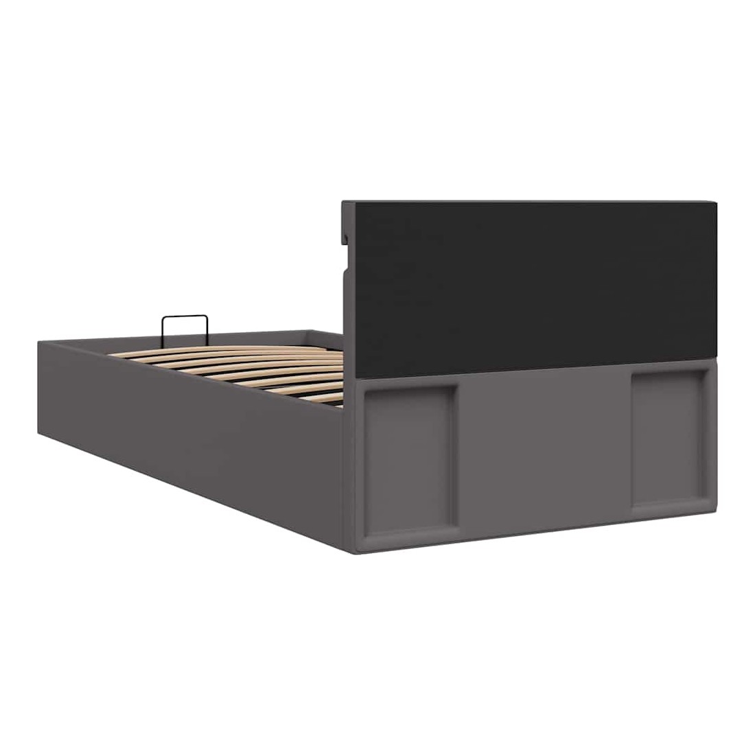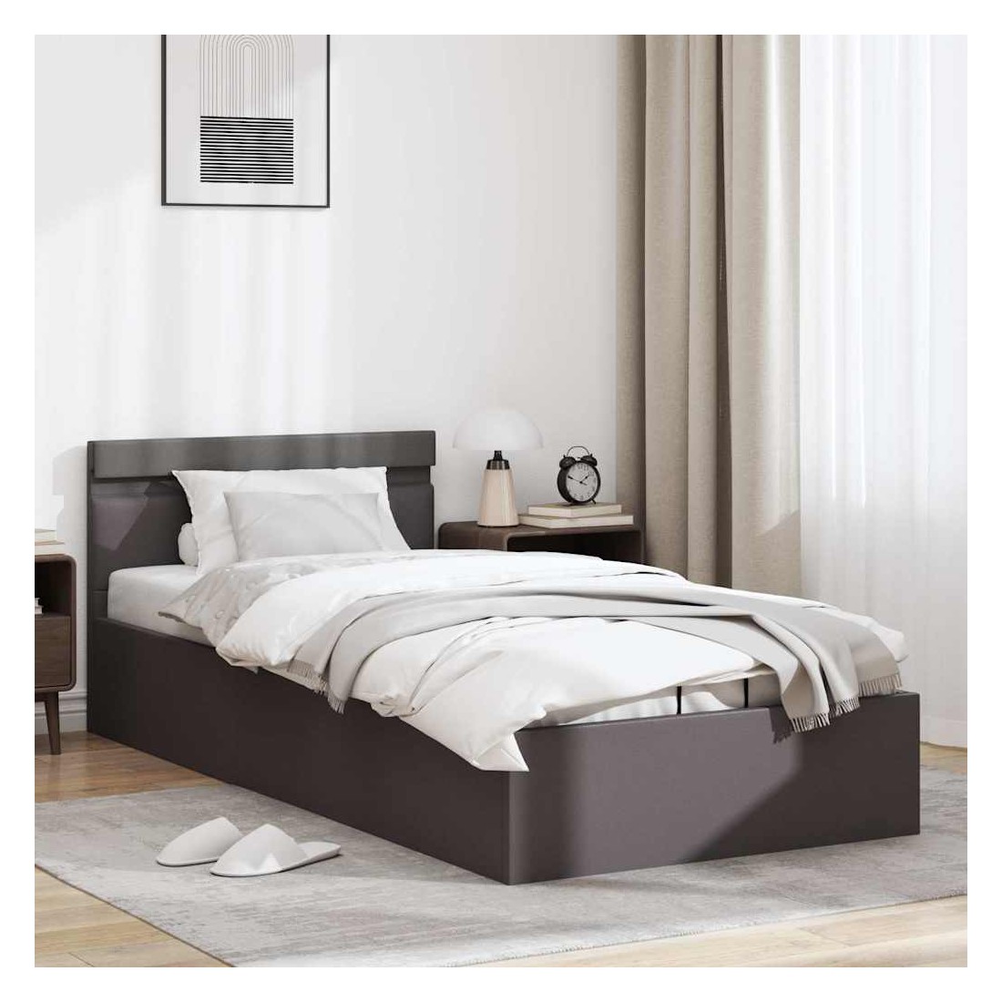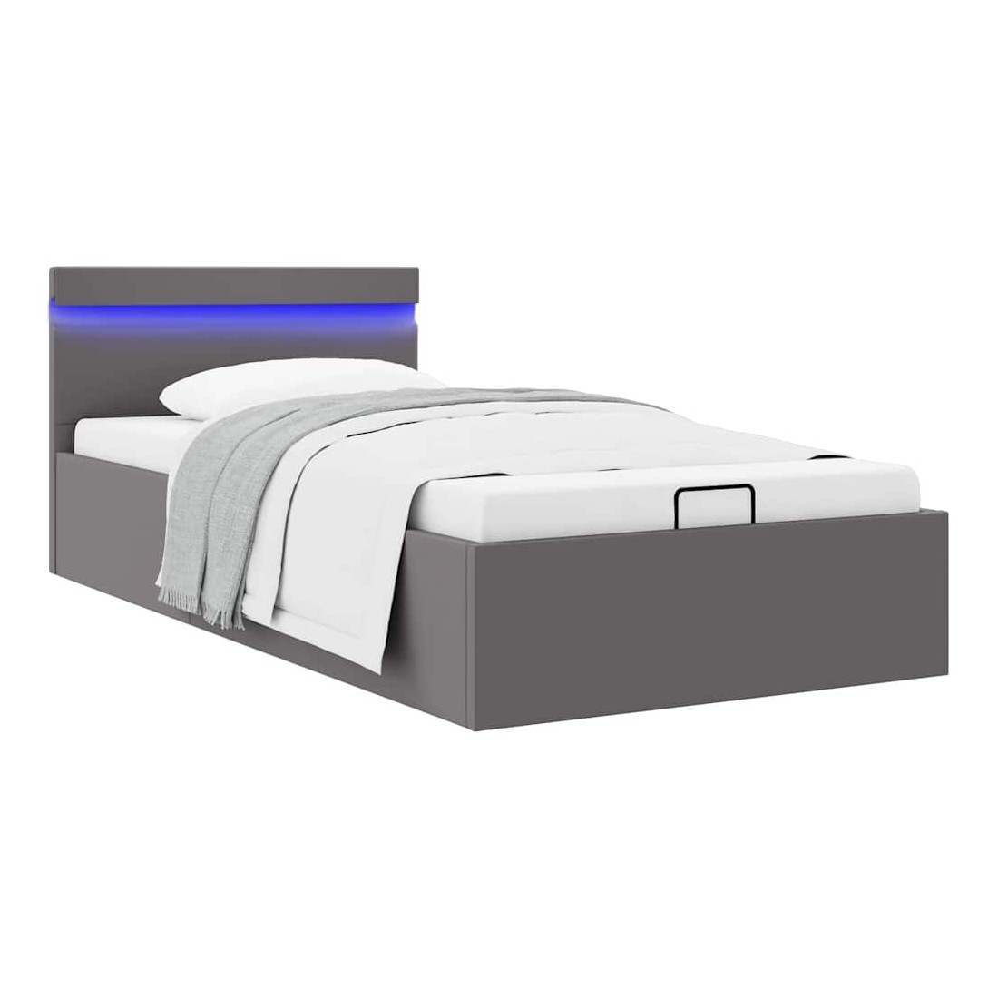 Ajoutez instantanément un goût moderne impressionnant à votre chambre à coucher grâce à notre cadre de lit en similicuir hydraulique ! Ce lit simple se caractérise par un design simple mais élégant, ainsi que par une construction solide, car il est fabriqué en MDF robuste et résistant. Ce lit rembourré transforme l'espace inutilisé sous le matelas en espace de rangement, avec suffisamment d'espace pour ranger les vêtements, les draps, les couvertures, etc. Le mécanisme de levage à gaz hydraulique facilite le soulèvement du matelas. Le sommier à lattes restera droit une fois soulevé pour vous laisser les deux mains libres d'enlever ou de stocker des articles en dessous. Le cadre en acier enduit de poudre et les lattes en contreplaqué ajoutent à la robustesse et à la durabilité du lit. Rembourré de similicuir brillant, ce lit semble accueillant et facile à entretenir. Ce meuble de chambre à coucher convient à un matelas de 90 x 200 cm. Ce lit est équipé de lumières LED qui peuvent être facilement réglées pour créer un spectacle lumineux personnalisé. Vous pouvez personnaliser les modes, les couleurs et la luminosité pour améliorer l'ambiance de votre espace intérieur. Ce produit est facile à assembler. Veuillez noter que la livraison inclut un cadre de lit seulement ; un matelas n'est pas inclus. Vous pouvez chercher le matelas correspondant dans notre boutique. Remarque : ce produit est doté d'un connecteur USB, mais la source d'alimentation certifiée de USB 5V n'est pas incluse.