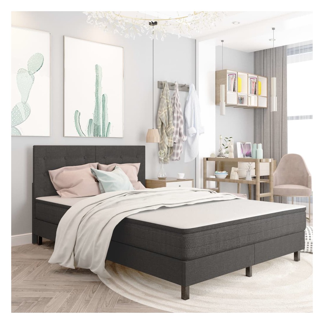 Ce sommier tapissier ajoute une touche de charme élégant à la décoration de votre chambre à coucher avec un design sobre. Le cadre de lit, en MDF et en métal, est extrêmement robuste et durable. Rembourré d'un tissu durable et résistant à l'usure, le lit dégage un look accueillant et il est facile à nettoyer. Doté d'une épaisseur supplémentaire d'env. 20 cm, le matelas à dessus de couette avec sommiers amortisseurs vous assure une bonne nuit de sommeil. Il est fait de mousse spécialement conçue avec des couches pour soulager les points de pression. La conception du ressort interne comporte des ressorts supplémentaires qui offrent un soutien optimal. C'est également une excellente solution pour les personnes lourdes et les personnes souffrant de transpiration excessive. Le matelas retro