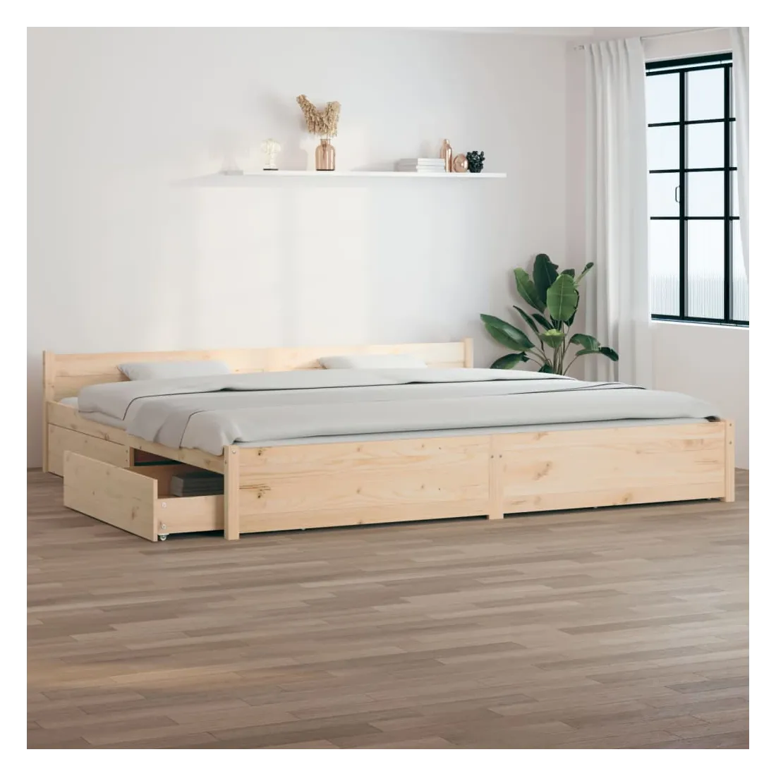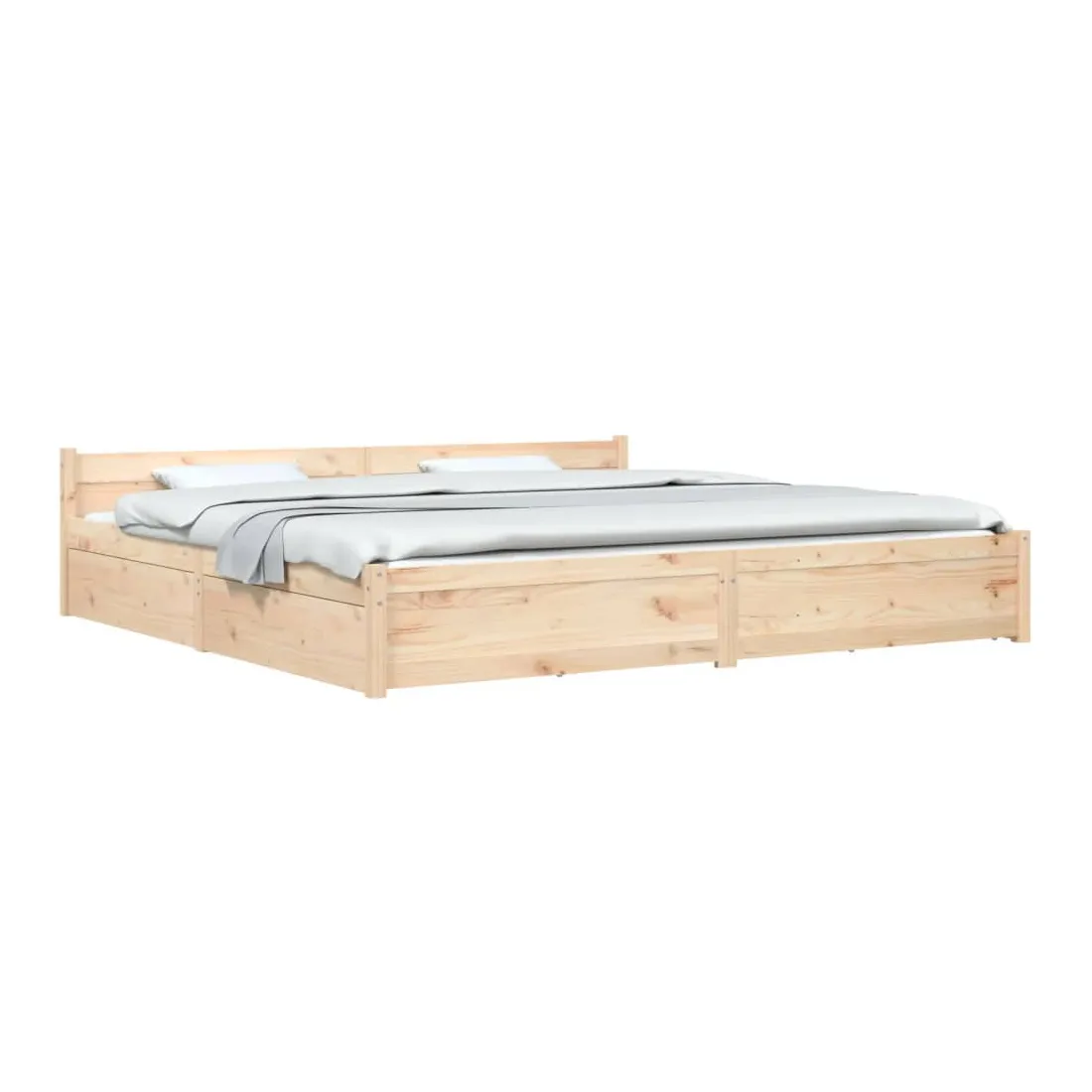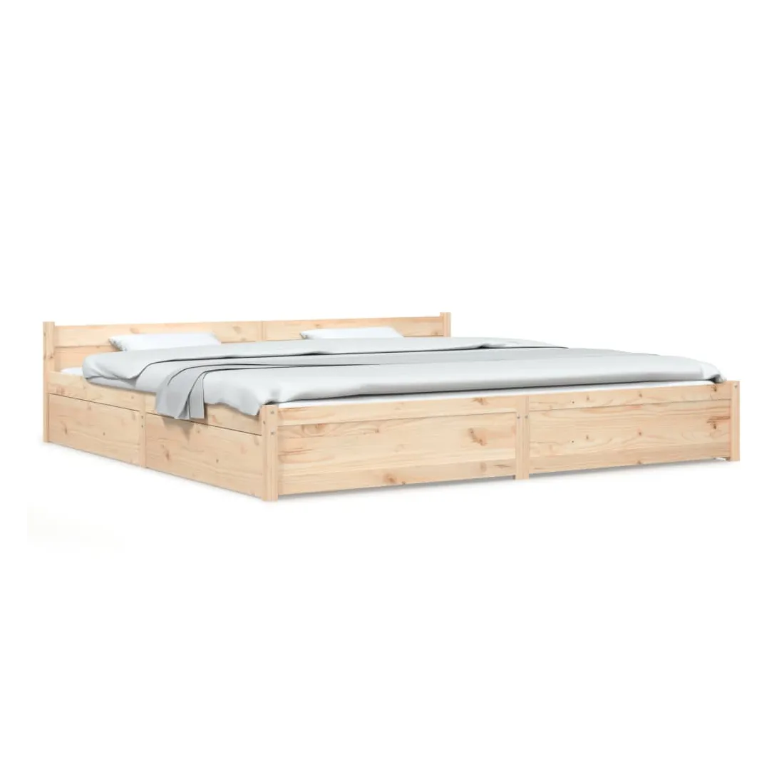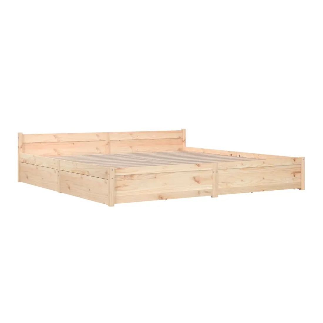 Ajoutez une touche moderne à votre chambre à coucher avec notre cadre de lit en bois classique ! Il apportera une touche pratique et décorative à votre intérieur. Bois de pin massif : le bois de pin massif est un matériau naturel magnifique. Le bois de pin a un grain droit et les nœuds donnent au matériau son aspect caractéristique et rustique.Lattes robustes : les lattes de contreplaqué assurent une bonne répartition du poids, garantissant que le matelas reste en place à chaque torsion de votre corps pendant le sommeil.Fonction de rangement : les tiroirs de lit inclus offrent suffisamment d'espace de rangement pour ranger vos articles essentiels, gardant votre pièce propre et bien rangée.Tête de lit confortable : la tête de lit classique vous permet de vous reposer confortablement lorsque vous lisez ou regardez un film. Remarque :La livraison comprend uniquement un cadre de lit. Le matelas n'est pas inclus. Vous pouvez consulter notre boutique pour trouver les matelas assortis.Ce cadre de lit convient à un matelas mesurant 200 x 200 cm.