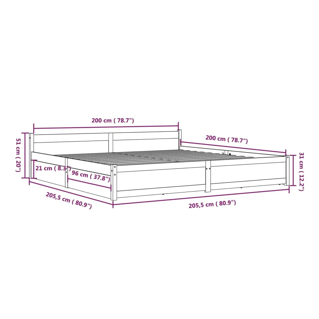 - Dimensions du lit : 205,5 x 205,5 x 51 cm (L x l x H)