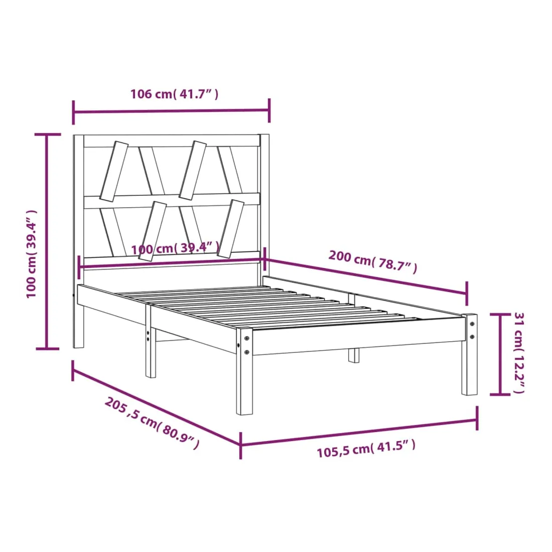 - Dimensions du cadre de lit : 205,5 x 105,5 x 31 cm (L x l x H)