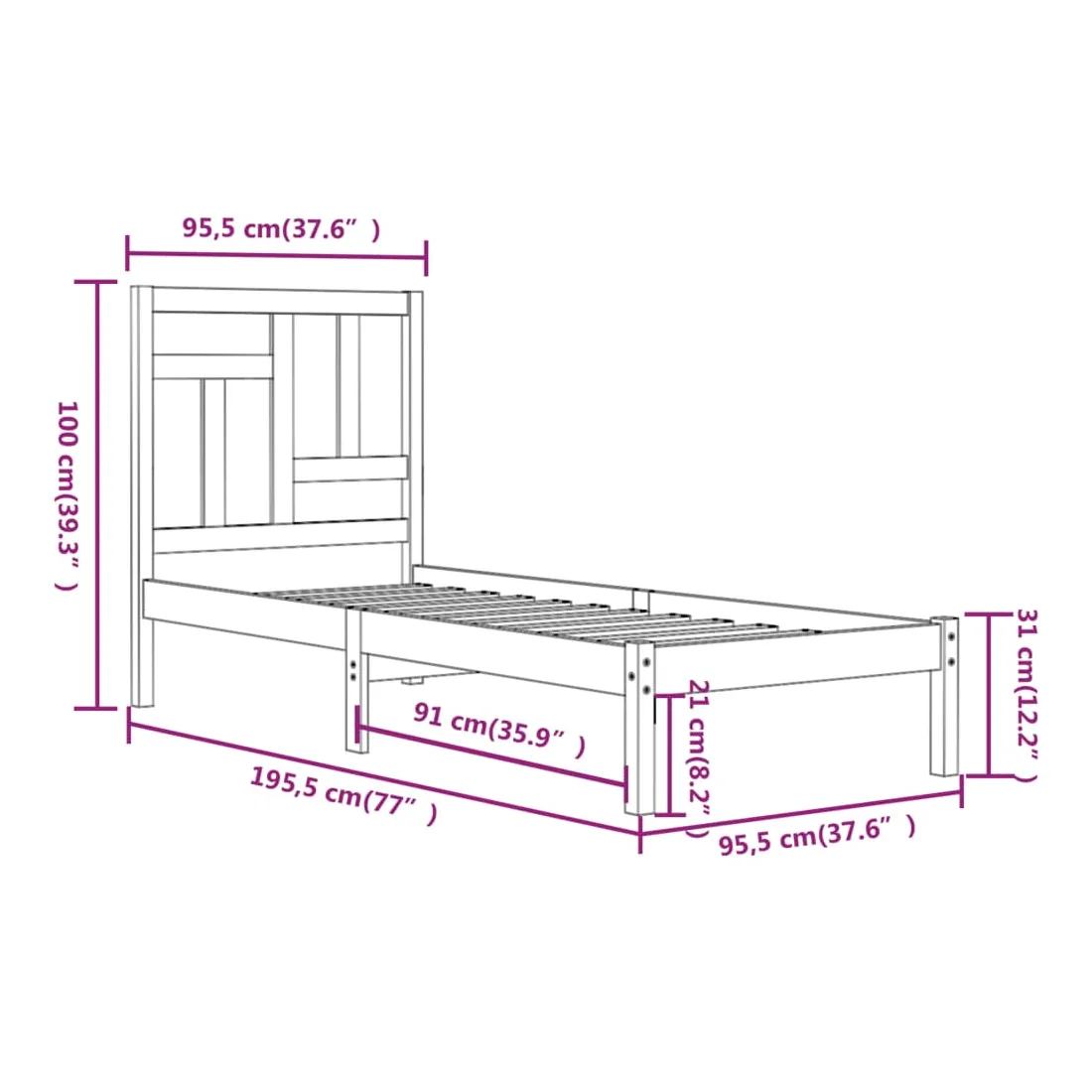 • Dimensions du cadre de lit : 195,5 x 95,5 x 31 cm (L x l x H)