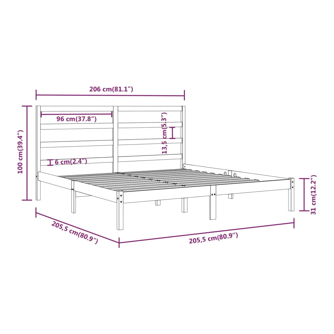 • Dimensions de la tête de lit : 206 x 4 x 100 cm (l x P x H)
