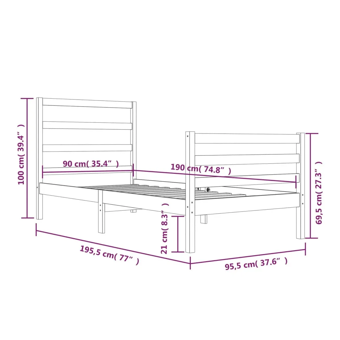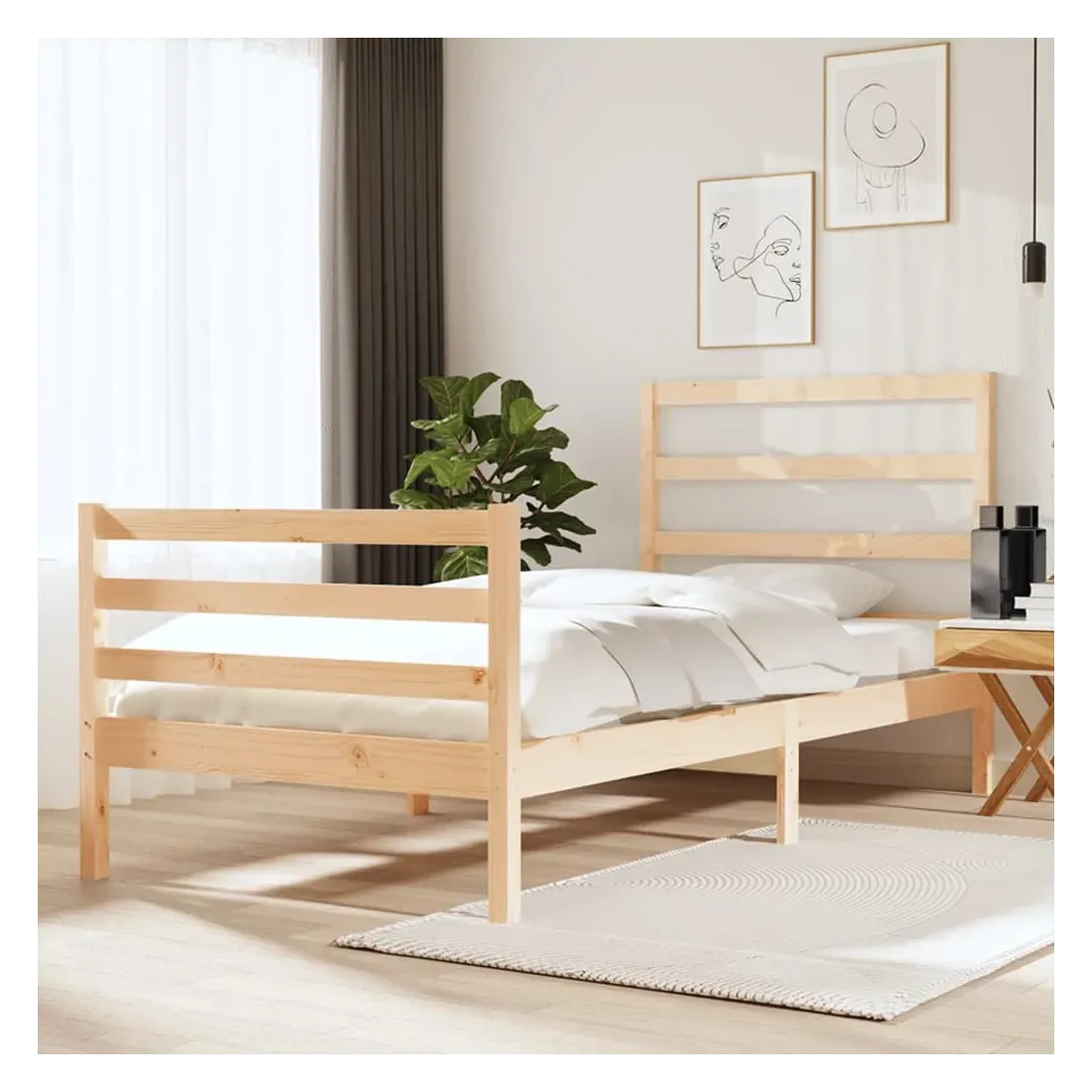 Avec un design simple mais intemporel, ce cadre de lit en bois sera un supplément vraiment pratique et décoratif à votre chambre à coucher. Bois de pin massif : le bois de pin massif est un matériau naturel magnifique. Le bois de pin a un grain droit et les nœuds donnent au matériau son aspect caractéristique et rustique.Cadre de lit robuste : le cadre en bois assure robustesse et stabilité. Les lattes apportent un soutien supplémentaire à votre lit. Il prolonge la durée de vie de votre matelas en absorbant la majeure partie du stress et du poids sur le lit.Soutien confortable : la tête de lit vous offre un excellent soutien dorsal lorsque vous êtes assis au lit pour lire ou regarder des films. Remarque :Le matelas n'est pas inclus. Vous pouvez consulter notre boutique pour trouver les matelas assortis.Ce cadre de lit en bois convient à un matelas mesurant 90 x 190 cm (simple).
