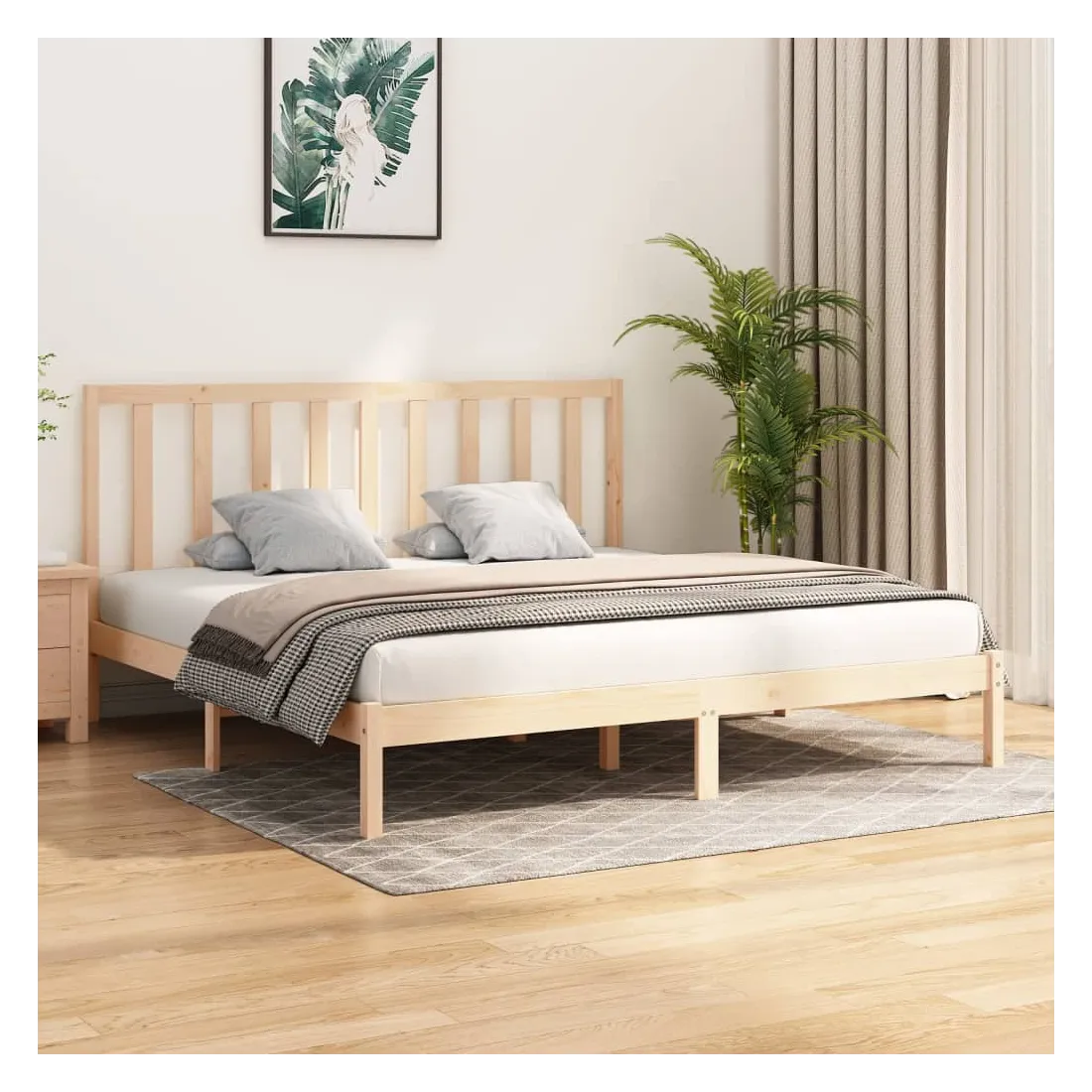 Avec un design simple mais intemporel, ce cadre de lit en bois sera un supplément vraiment pratique et décoratif à votre chambre à coucher. Matériau de première qualité : le bois de pin massif est un matériau naturel magnifique. Le bois de pin a un grain droit et les nœuds donnent au matériau son aspect caractéristique et rustique.Cadre de lit robuste : le cadre en bois assure robustesse et stabilité. Les lattes apportent un soutien supplémentaire à votre lit. Il prolonge la durée de vie de votre matelas en absorbant la majeure partie du stress et du poids sur le lit.Soutien confortable : la tête de lit du cadre de lit vous offre un excellent soutien dorsal lorsque vous êtes assis au lit pour lire ou regarder des films. Remarque :Le matelas n'est pas inclus. Vous pouvez consulter notre boutique pour trouver les matelas assortis.Ce cadre de lit en bois convient à un matelas mesurant 200 x 200 cm.