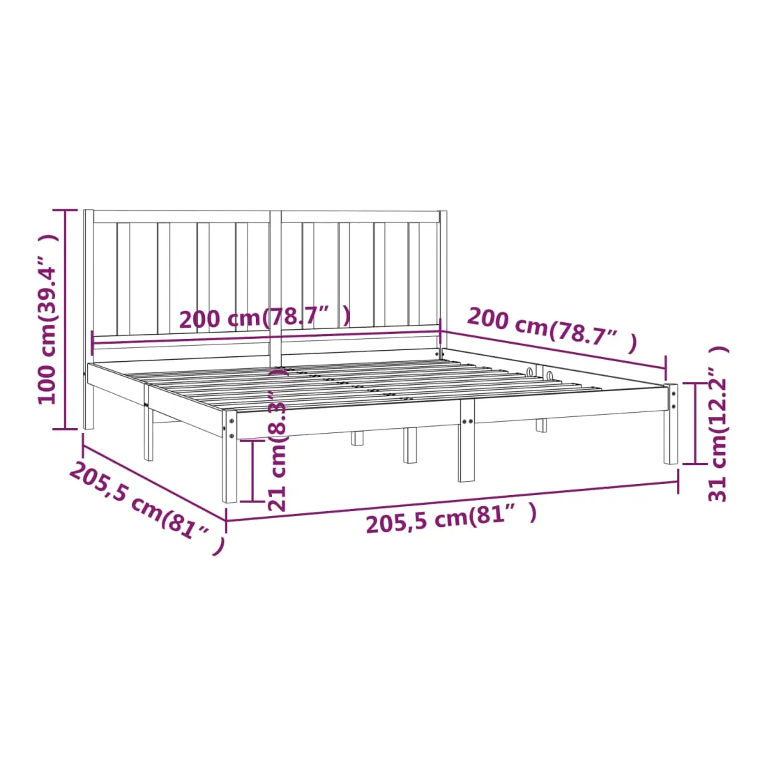 Avec un design simple mais intemporel, ce cadre de lit en bois sera un supplément vraiment pratique et décoratif à votre chambre à coucher. Matériau de première qualité : le bois de pin massif est un matériau naturel magnifique. Le bois de pin a un grain droit et les nœuds donnent au matériau son aspect caractéristique et rustique.Cadre de lit robuste : le cadre en bois assure robustesse et stabilité. Les lattes apportent un soutien supplémentaire à votre lit. Il prolonge la durée de vie de votre matelas en absorbant la majeure partie du stress et du poids sur le lit.Soutien confortable : la tête de lit du cadre de lit vous offre un excellent soutien dorsal lorsque vous êtes assis au lit pour lire ou regarder des films. Remarque :Le matelas n'est pas inclus. Vous pouvez consulter notre boutique pour trouver les matelas assortis.Ce cadre de lit en bois convient à un matelas mesurant 200 x 200 cm.