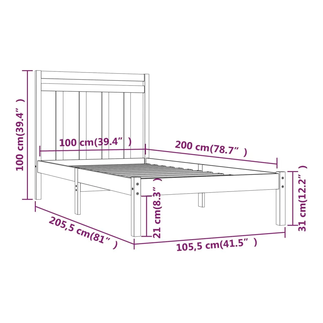 - Dimensions du cadre de lit : 205,5 x 105,5 x 31 cm (L x l x H)