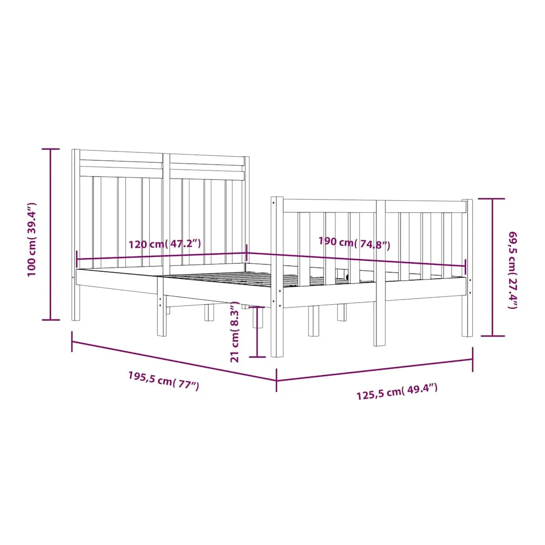 - Dimensions du cadre de lit : 195,5 x 125,5 x 69,5 cm (L x l x H)