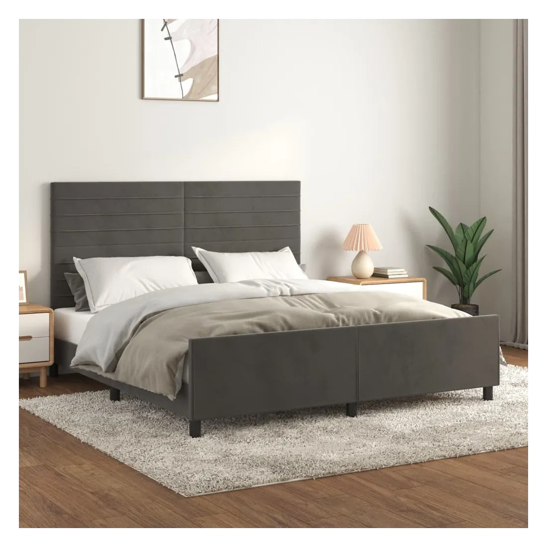 Obtenez une meilleure nuit de sommeil reposante grâce à ce cadre de lit avec tête de lit ! Il est un supplément accueillant à toute chambre à coucher. Velours doux : le velours est un tissu doux et luxueux qui se reconnaît à son tas dense de fibres uniformément coupées qui ont une touche lisse. Le tissu en velours présente un toucher doux distinctif, ce qui le rend confortable au toucher.Hauteur réglable : la tête de lit est réglable en hauteur selon vos préférences.Pieds de soutien : le lit est soutenu par des pieds robustes, qui assurent sa stabilité, sa sécurité et sa fermeté.Lattes de contreplaqué : les lattes de contreplaqué assurent une bonne répartition du poids, garantissant que le matelas reste en place à chaque torsion de votre corps pendant le sommeil.Excellent soutien : la tête de lit vous offre un excellent soutien du dos lorsque vous êtes assis dans votre lit pour lire ou regarder la télévision. Remarque :La livraison comprend uniquement un cadre de lit. Le matelas n'est pas inclus. Vous pouvez consulter notre boutique pour trouver les matelas assortis.Chaque produit est livré avec un manuel de montage dans la boîte pour un montage facile.