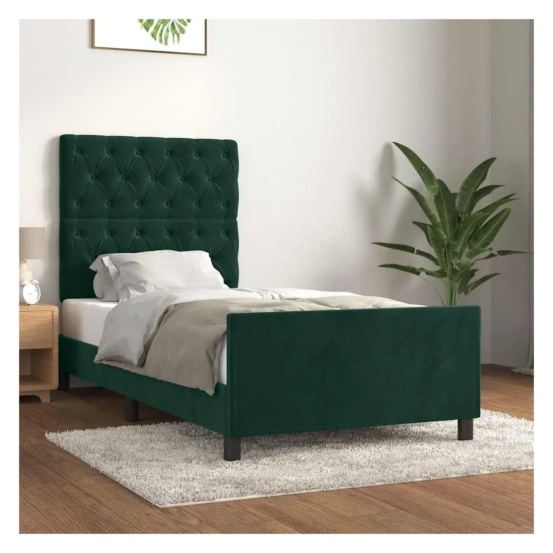Obtenez une meilleure nuit de sommeil reposante grâce à ce cadre de lit avec tête de lit ! Il est un supplément accueillant à toute chambre à coucher. Velours doux : le velours est un tissu doux et luxueux qui se reconnaît à son tas dense de fibres uniformément coupées qui ont une touche lisse. Le tissu en velours présente un toucher doux distinctif, ce qui le rend confortable au toucher.Hauteur réglable : la tête de lit est réglable en hauteur selon vos préférences.Pieds de soutien : le lit est soutenu par des pieds robustes, qui assurent sa stabilité, sa sécurité et sa fermeté.Lattes de contreplaqué : les lattes de contreplaqué assurent une bonne répartition du poids, garantissant que le matelas reste en place à chaque torsion de votre corps pendant le sommeil.Excellent soutien : la tête de lit vous offre un excellent soutien du dos lorsque vous êtes assis dans votre lit pour lire ou regarder la télévision. Remarque :La livraison comprend uniquement un cadre de lit. Le matelas n'est pas inclus. Vous pouvez consulter notre boutique pour trouver les matelas assortis.Chaque produit est livré avec un manuel de montage dans la boîte pour un montage facile.