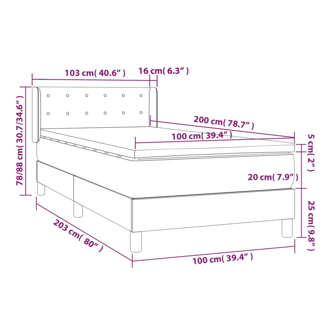 Utilisez ce lit à sommier pour profiter d'une nuit de sommeil réparatrice ! Il vous offre une relaxation maximale et un sommeil agréable. Velours doux : le velours est un tissu doux et luxueux qui se reconnaît à son tas dense de fibres uniformément coupées qui ont une touche lisse. Le tissu en velours présente un toucher doux distinctif, ce qui le rend confortable au toucher.Tête de lit pratique : la tête de lit est réglable en hauteur selon vos préférences. La tête de lit vous offre un excellent soutien du dos lorsque vous êtes assis dans votre lit pour lire ou regarder la télévision.Matelas à ressorts ensachés : le ressort ensaché individuel intégré est connu pour sa très haute qualité tout en assurant un haut niveau de durabilité et d'adaptabilité. Il peut absorber efficacement le bruit et les chocs causés par les sauts et les rotations.Support moyen-dur : ce matelas de lit offre une stabilité accrue et juste le niveau de fermeté sans sacrifier le confort. Il est donc idéal pour les personnes qui dorment sur le dos ou sur le ventre.Protège-matelas doux pour la peau : le protège-matelas est recouvert d'un tissu résistant et doux pour la peau, ce qui le rend souple et confortable. Remarque :Pour des raisons d'hygiène, le matelas ne peut pas être retourné si l'emballage est retiré ou ouvert.Chaque produit est livré avec un manuel de montage dans la boîte pour un montage facile.