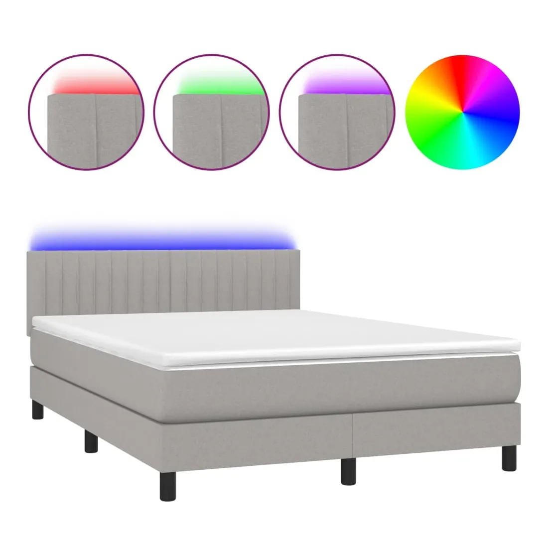 Utilisez ce sommier tapissier avec matelas et LED pour profiter d'un sommeil réparateur ! C'est le point central de votre chambre à coucher. Tissu durable : le tissu présente un aspect simple et épuré, et il est respirant et durable.Tête de lit pratique : la tête de lit est réglable en hauteur selon vos préférences. La tête de lit vous offre un excellent soutien du dos lorsque vous êtes assis dans votre lit pour lire ou regarder la télévision.Bande LED colorée : apportez de l'éclairage dans l'obscurité avec des lumières LED colorées !Matelas à ressorts ensachés : le ressort ensaché individuel intégré est connu pour sa très haute qualité tout en assurant un haut niveau de durabilité et d'adaptabilité. Il peut absorber efficacement le bruit et les chocs causés par les sauts et les rotations.Protège-matelas doux pour la peau : le protège-matelas est recouvert d'un tissu résistant et doux pour la peau, ce qui le rend souple et confortable. Remarque :Pour des raisons d'hygiène, le matelas ne peut pas être retourné si l'emballage est retiré ou ouvert.Chaque produit est livré avec un manuel de montage dans la boîte pour un montage facile.Seule la partie avec un symbole de ciseaux peut être coupée et seule la partie avec l'USB continuera à fonctionner comme avant.Ce produit est doté d'un connecteur USB, mais la source d'alimentation certifiée de USB 5V n'est pas incluse.