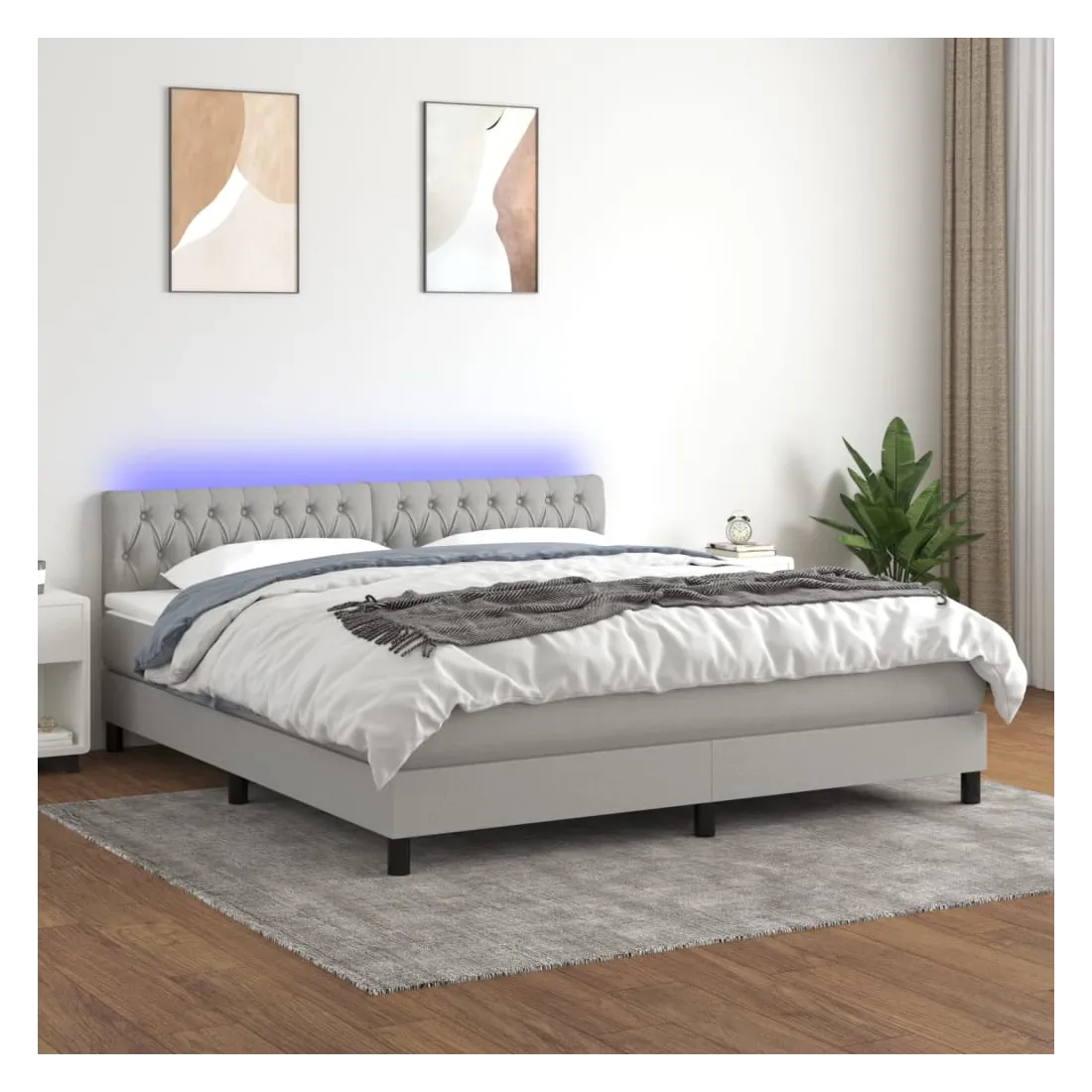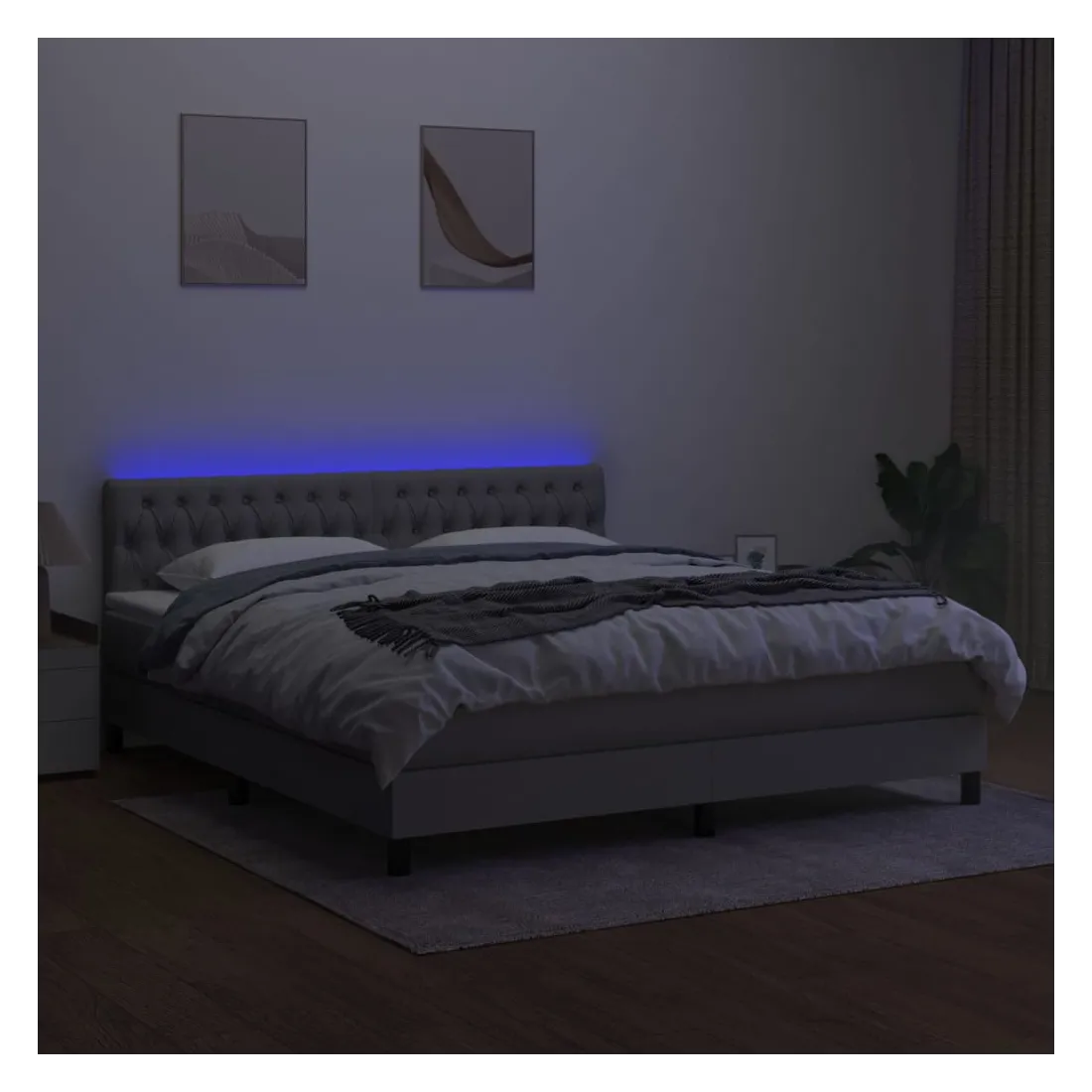 Utilisez ce sommier tapissier avec matelas et LED pour profiter d'un sommeil réparateur ! C'est le point central de votre chambre à coucher. Tissu durable : le tissu présente un aspect simple et épuré, et il est respirant et durable.Tête de lit pratique : la tête de lit est réglable en hauteur selon vos préférences. La tête de lit vous offre un excellent soutien du dos lorsque vous êtes assis dans votre lit pour lire ou regarder la télévision.Bande LED colorée : apportez de l'éclairage dans l'obscurité avec des lumières LED colorées !Matelas à ressorts ensachés : le ressort ensaché individuel intégré est connu pour sa très haute qualité tout en assurant un haut niveau de durabilité et d'adaptabilité. Il peut absorber efficacement le bruit et les chocs causés par les sauts et les rotations.Protège-matelas doux pour la peau : le protège-matelas est recouvert d'un tissu résistant et doux pour la peau, ce qui le rend souple et confortable. Remarque :Pour des raisons d'hygiène, le matelas ne peut pas être retourné si l'emballage est retiré ou ouvert.Chaque produit est livré avec un manuel de montage dans la boîte pour un montage facile.Seule la partie avec un symbole de ciseaux peut être coupée et seule la partie avec l'USB continuera à fonctionner comme avant.Ce produit est doté d'un connecteur USB, mais la source d'alimentation certifiée de USB 5V n'est pas incluse.