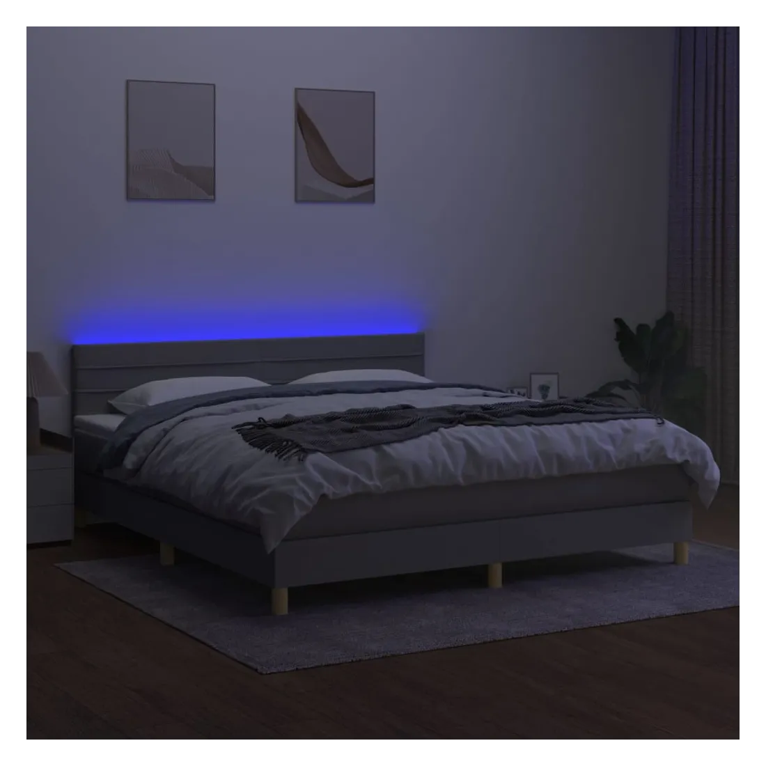 Utilisez ce sommier tapissier avec matelas et LED pour profiter d'un sommeil réparateur ! C'est le point central de votre chambre à coucher. Tissu durable : le tissu présente un aspect simple et épuré, et il est respirant et durable. Tête de lit pratique : la tête de lit est réglable en hauteur selon vos préférences. La tête de lit vous offre un excellent soutien du dos lorsque vous êtes assis dans votre lit pour lire ou regarder la télévision. Bande LED colorée : apportez de l'éclairage dans l'obscurité avec des lumières LED colorées ! Matelas à ressorts ensachés : le ressort ensaché individuel intégré est connu pour sa très haute qualité tout en assurant un haut niveau de durabilité et d'adaptabilité. Il peut absorber efficacement le bruit et les chocs causés par les sauts et les rot
