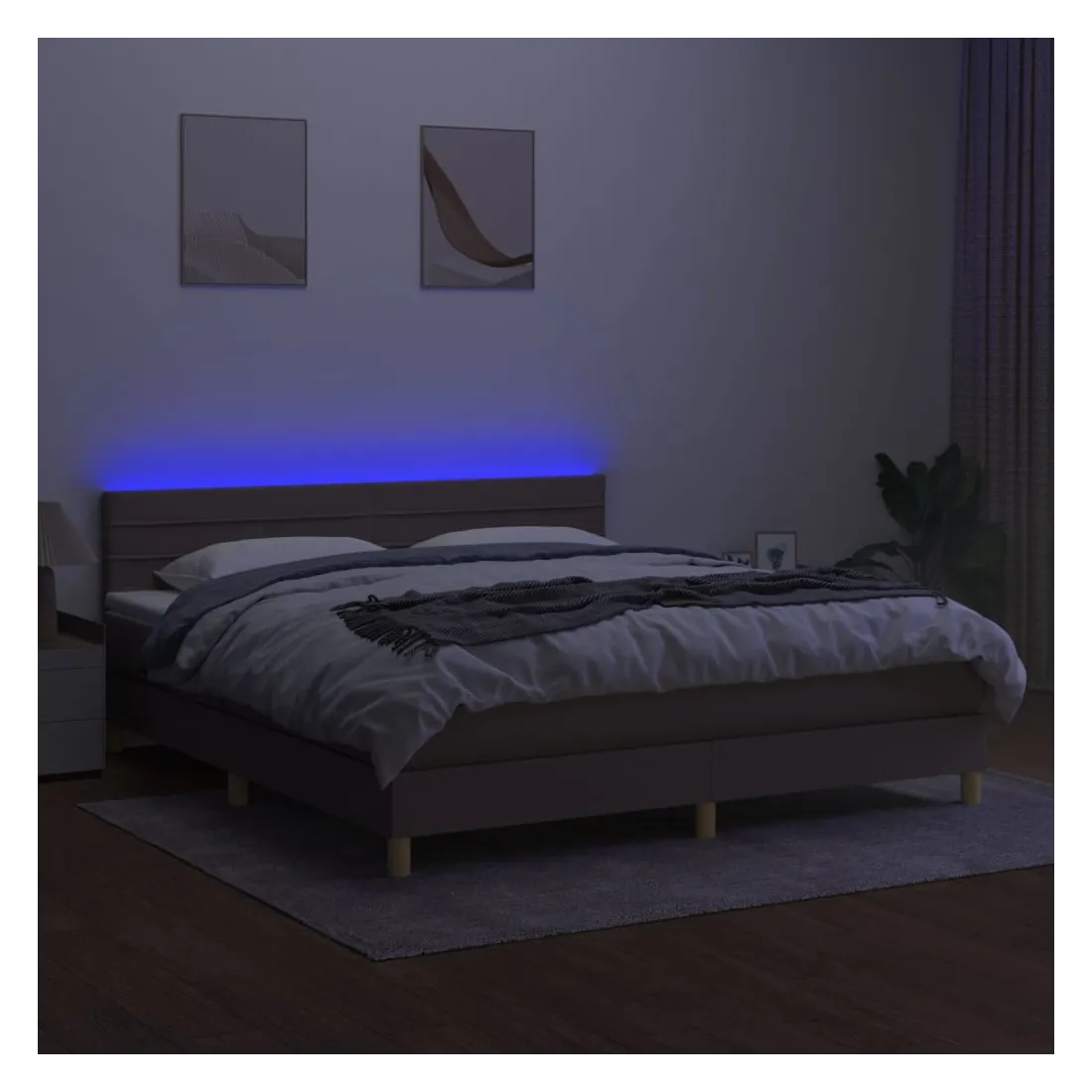 Utilisez ce sommier tapissier avec matelas et LED pour profiter d'un sommeil réparateur ! C'est le point central de votre chambre à coucher. Tissu durable : le tissu présente un aspect simple et épuré, et il est respirant et durable. Tête de lit pratique : la tête de lit est réglable en hauteur selon vos préférences. La tête de lit vous offre un excellent soutien du dos lorsque vous êtes assis dans votre lit pour lire ou regarder la télévision. Bande LED colorée : apportez de l'éclairage dans l'obscurité avec des lumières LED colorées ! Matelas à ressorts ensachés : le ressort ensaché individuel intégré est connu pour sa très haute qualité tout en assurant un haut niveau de durabilité et d'adaptabilité. Il peut absorber efficacement le bruit et les chocs causés par les sauts et les rot