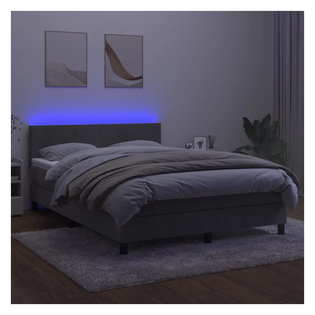 Utilisez ce sommier tapissier avec matelas et LED pour profiter d'un sommeil réparateur ! C'est le point central de votre chambre à coucher. Velours doux : le velours est un tissu doux et luxueux qui se reconnaît à son tas dense de fibres uniformément coupées qui ont une touche lisse. Le tissu en velours présente un toucher doux distinctif, ce qui le rend confortable au toucher.Tête de lit pratique : la tête de lit est réglable en hauteur selon vos préférences. La tête de lit vous offre un excellent soutien du dos lorsque vous êtes assis dans votre lit pour lire ou regarder la télévision.Bande LED colorée : apportez de l'éclairage dans l'obscurité avec des lumières LED colorées !Matelas à ressorts ensachés : le ressort ensaché individuel intégré est connu pour sa très haute qualité tout en assurant un haut niveau de durabilité et d'adaptabilité. Il peut absorber efficacement le bruit et les chocs causés par les sauts et les rotations.Protège-matelas doux pour la peau : le protège-matelas est recouvert d'un tissu résistant et doux pour la peau, ce qui le rend souple et confortable. Remarque :Pour des raisons d'hygiène, le matelas ne peut pas être retourné si l'emballage est retiré ou ouvert.Chaque produit est livré avec un manuel de montage dans la boîte pour un montage facile.Seule la partie avec un symbole de ciseaux peut être coupée et seule la partie avec l'USB continuera à fonctionner comme avant.Ce produit est doté d'un connecteur USB, mais la source d'alimentation certifiée de USB 5V n'est pas incluse.