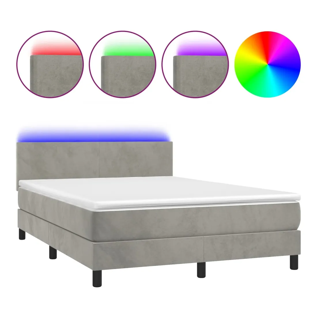 Utilisez ce sommier tapissier avec matelas et LED pour profiter d'un sommeil réparateur ! C'est le point central de votre chambre à coucher. Velours doux : le velours est un tissu doux et luxueux qui se reconnaît à son tas dense de fibres uniformément coupées qui ont une touche lisse. Le tissu en velours présente un toucher doux distinctif, ce qui le rend confortable au toucher.Tête de lit pratique : la tête de lit est réglable en hauteur selon vos préférences. La tête de lit vous offre un excellent soutien du dos lorsque vous êtes assis dans votre lit pour lire ou regarder la télévision.Bande LED colorée : apportez de l'éclairage dans l'obscurité avec des lumières LED colorées !Matelas à ressorts ensachés : le ressort ensaché individuel intégré est connu pour sa très haute qualité tout en assurant un haut niveau de durabilité et d'adaptabilité. Il peut absorber efficacement le bruit et les chocs causés par les sauts et les rotations.Protège-matelas doux pour la peau : le protège-matelas est recouvert d'un tissu résistant et doux pour la peau, ce qui le rend souple et confortable. Remarque :Pour des raisons d'hygiène, le matelas ne peut pas être retourné si l'emballage est retiré ou ouvert.Chaque produit est livré avec un manuel de montage dans la boîte pour un montage facile.Seule la partie avec un symbole de ciseaux peut être coupée et seule la partie avec l'USB continuera à fonctionner comme avant.Ce produit est doté d'un connecteur USB, mais la source d'alimentation certifiée de USB 5V n'est pas incluse.