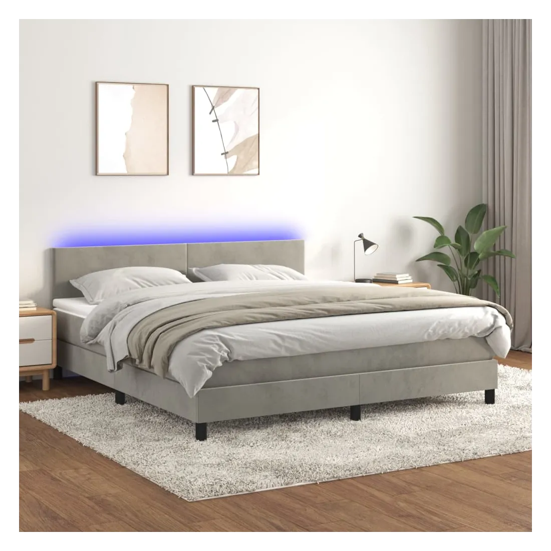 Utilisez ce sommier tapissier avec matelas et LED pour profiter d'un sommeil réparateur ! C'est le point central de votre chambre à coucher. Velours doux : le velours est un tissu doux et luxueux qui se reconnaît à son tas dense de fibres uniformément coupées qui ont une touche lisse. Le tissu en velours présente un toucher doux distinctif, ce qui le rend confortable au toucher.Tête de lit pratique : la tête de lit est réglable en hauteur selon vos préférences. La tête de lit vous offre un excellent soutien du dos lorsque vous êtes assis dans votre lit pour lire ou regarder la télévision.Bande LED colorée : apportez de l'éclairage dans l'obscurité avec des lumières LED colorées !Matelas à ressorts ensachés : le ressort ensaché individuel intégré est connu pour sa très haute qualité tout en assurant un haut niveau de durabilité et d'adaptabilité. Il peut absorber efficacement le bruit et les chocs causés par les sauts et les rotations.Protège-matelas doux pour la peau : le protège-matelas est recouvert d'un tissu résistant et doux pour la peau, ce qui le rend souple et confortable. Remarque :Pour des raisons d'hygiène, le matelas ne peut pas être retourné si l'emballage est retiré ou ouvert.Chaque produit est livré avec un manuel de montage dans la boîte pour un montage facile.Seule la partie avec un symbole de ciseaux peut être coupée et seule la partie avec l'USB continuera à fonctionner comme avant.Ce produit est doté d'un connecteur USB, mais la source d'alimentation certifiée de USB 5V n'est pas incluse.