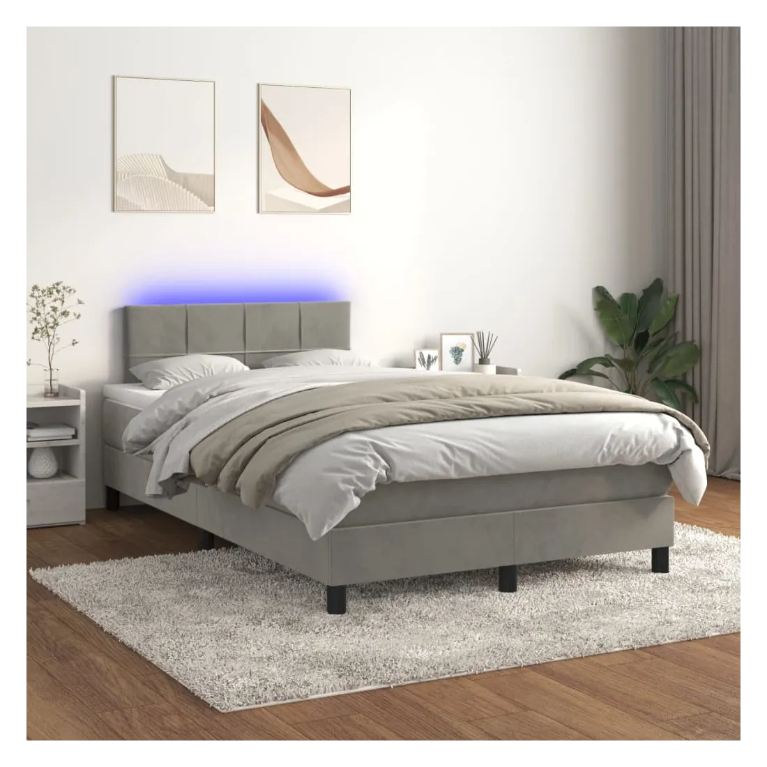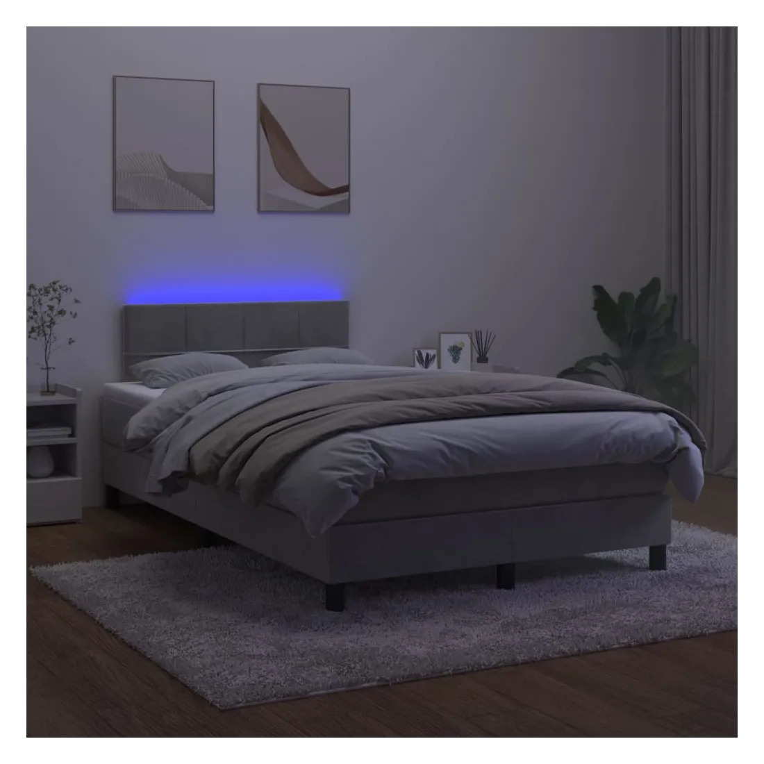 Utilisez ce sommier tapissier avec matelas et LED pour profiter d'un sommeil réparateur ! C'est le point central de votre chambre à coucher. Velours doux : le velours est un tissu doux et luxueux qui se reconnaît à son tas dense de fibres uniformément coupées qui ont une touche lisse. Le tissu en velours présente un toucher doux distinctif, ce qui le rend confortable au toucher.Tête de lit pratique : la tête de lit est réglable en hauteur selon vos préférences. La tête de lit vous offre un excellent soutien du dos lorsque vous êtes assis dans votre lit pour lire ou regarder la télévision.Bande LED colorée : apportez de l'éclairage dans l'obscurité avec des lumières LED colorées !Matelas à ressorts ensachés : le ressort ensaché individuel intégré est connu pour sa très haute qualité tout en assurant un haut niveau de durabilité et d'adaptabilité. Il peut absorber efficacement le bruit et les chocs causés par les sauts et les rotations.Protège-matelas doux pour la peau : le protège-matelas est recouvert d'un tissu résistant et doux pour la peau, ce qui le rend souple et confortable. Remarque :Pour des raisons d'hygiène, le matelas ne peut pas être retourné si l'emballage est retiré ou ouvert.Chaque produit est livré avec un manuel de montage dans la boîte pour un montage facile.Seule la partie avec un symbole de ciseaux peut être coupée et seule la partie avec l'USB continuera à fonctionner comme avant.Ce produit est doté d'un connecteur USB, mais la source d'alimentation certifiée de USB 5V n'est pas incluse.