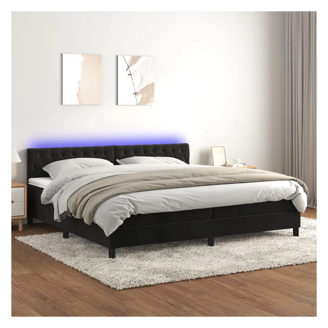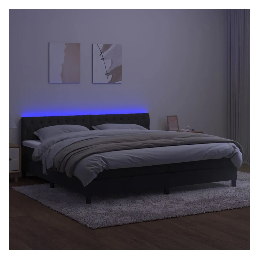 Utilisez ce sommier tapissier avec matelas et LED pour profiter d'un sommeil réparateur ! C'est le point central de votre chambre à coucher. Velours doux : le velours est un tissu doux et luxueux qui se reconnaît à son tas dense de fibres uniformément coupées qui ont une touche lisse. Le tissu en velours présente un toucher doux distinctif, ce qui le rend confortable au toucher.Tête de lit pratique : la tête de lit est réglable en hauteur selon vos préférences. La tête de lit vous offre un excellent soutien du dos lorsque vous êtes assis dans votre lit pour lire ou regarder la télévision.Bande LED colorée : apportez de l'éclairage dans l'obscurité avec des lumières LED colorées !Matelas à ressorts ensachés : le ressort ensaché individuel intégré est connu pour sa très haute qualité tout en assurant un haut niveau de durabilité et d'adaptabilité. Il peut absorber efficacement le bruit et les chocs causés par les sauts et les rotations.Protège-matelas doux pour la peau : le protège-matelas est recouvert d'un tissu résistant et doux pour la peau, ce qui le rend souple et confortable. Remarque :Pour des raisons d'hygiène, le matelas ne peut pas être retourné si l'emballage est retiré ou ouvert.Chaque produit est livré avec un manuel de montage dans la boîte pour un montage facile.Seule la partie avec un symbole de ciseaux peut être coupée et seule la partie avec l'USB continuera à fonctionner comme avant.Ce produit est doté d'un connecteur USB, mais la source d'alimentation certifiée de USB 5V n'est pas incluse.