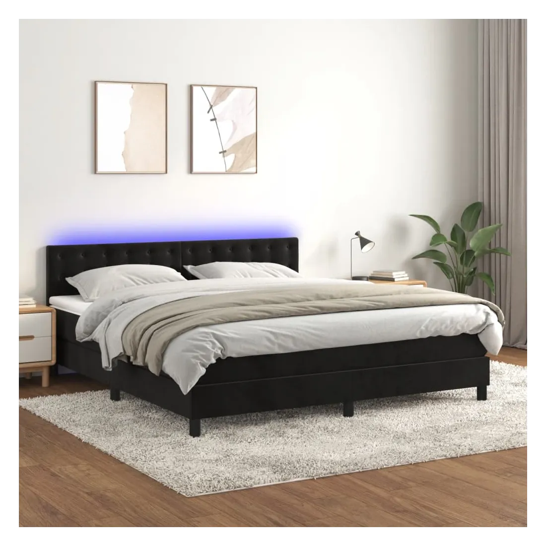 Utilisez ce sommier tapissier avec matelas et LED pour profiter d'un sommeil réparateur ! C'est le point central de votre chambre à coucher. Velours doux : le velours est un tissu doux et luxueux qui se reconnaît à son tas dense de fibres uniformément coupées qui ont une touche lisse. Le tissu en velours présente un toucher doux distinctif, ce qui le rend confortable au toucher.Tête de lit pratique : la tête de lit est réglable en hauteur selon vos préférences. La tête de lit vous offre un excellent soutien du dos lorsque vous êtes assis dans votre lit pour lire ou regarder la télévision.Bande LED colorée : apportez de l'éclairage dans l'obscurité avec des lumières LED colorées !Matelas à ressorts ensachés : le ressort ensaché individuel intégré est connu pour sa très haute qualité tout en assurant un haut niveau de durabilité et d'adaptabilité. Il peut absorber efficacement le bruit et les chocs causés par les sauts et les rotations.Protège-matelas doux pour la peau : le protège-matelas est recouvert d'un tissu résistant et doux pour la peau, ce qui le rend souple et confortable. Remarque :Pour des raisons d'hygiène, le matelas ne peut pas être retourné si l'emballage est retiré ou ouvert.Chaque produit est livré avec un manuel de montage dans la boîte pour un montage facile.Seule la partie avec un symbole de ciseaux peut être coupée et seule la partie avec l'USB continuera à fonctionner comme avant.Ce produit est doté d'un connecteur USB, mais la source d'alimentation certifiée de USB 5V n'est pas incluse.