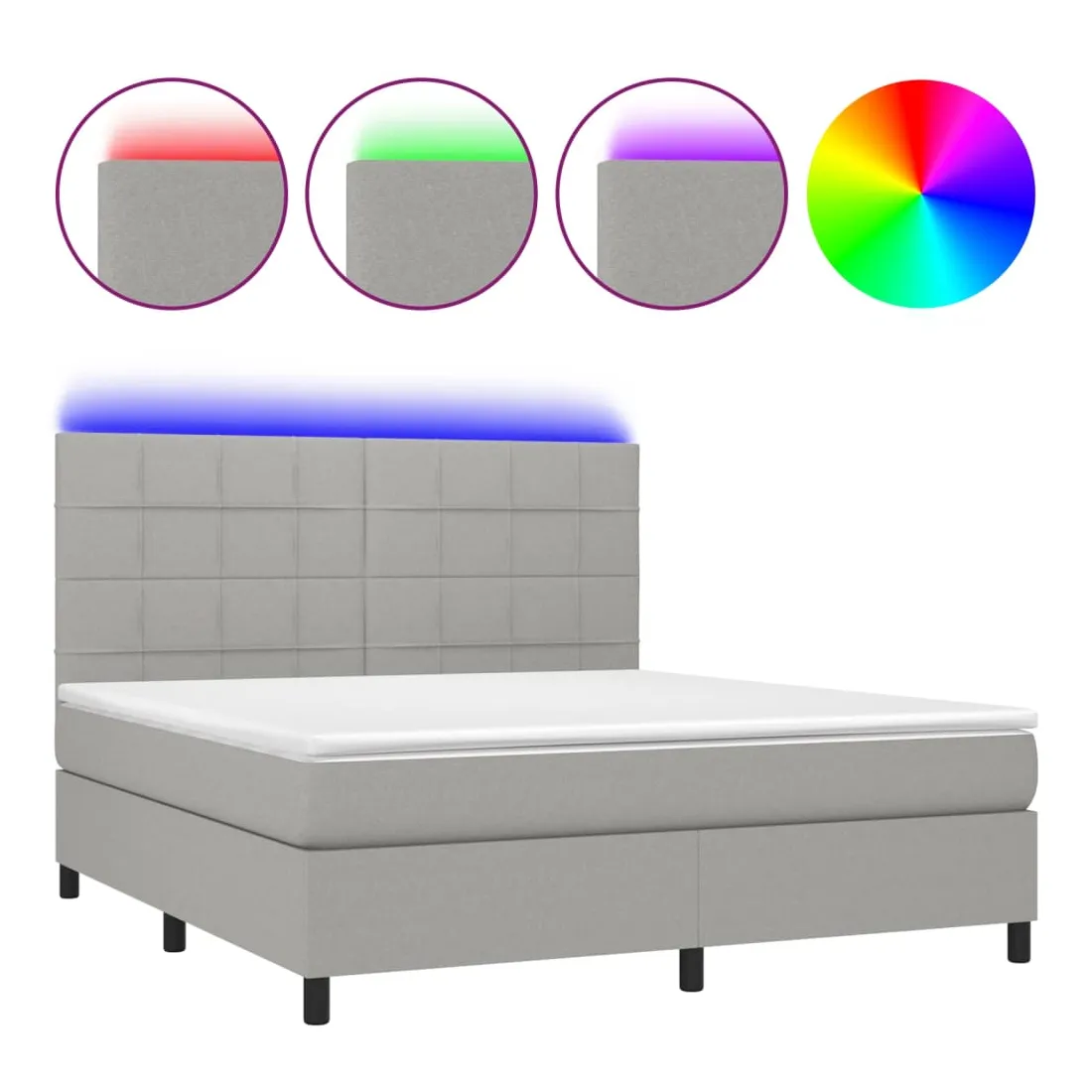 Utilisez ce sommier tapissier avec matelas et LED pour profiter d'un sommeil réparateur ! C'est le point central de votre chambre à coucher. Tissu durable : le tissu présente un aspect simple et épuré, et il est respirant et durable.Tête de lit pratique : la tête de lit est réglable en hauteur selon vos préférences. La tête de lit vous offre un excellent soutien du dos lorsque vous êtes assis dans votre lit pour lire ou regarder la télévision.Bande LED colorée : apportez de l'éclairage dans l'obscurité avec des lumières LED colorées !Matelas à ressorts ensachés : le ressort ensaché individuel intégré est connu pour sa très haute qualité tout en assurant un haut niveau de durabilité et d'adaptabilité. Il peut absorber efficacement le bruit et les chocs causés par les sauts et les rotations.Protège-matelas doux pour la peau : le protège-matelas est recouvert d'un tissu résistant et doux pour la peau, ce qui le rend souple et confortable. Remarque :Pour des raisons d'hygiène, le matelas ne peut pas être retourné si l'emballage est retiré ou ouvert.Seule la partie avec un symbole de ciseaux peut être coupée et seule la partie avec l'USB continuera à fonctionner comme avant.Chaque produit est livré avec un manuel de montage dans la boîte pour un montage facile.Ce produit est doté d'un connecteur USB, mais la source d'alimentation certifiée de USB 5V n'est pas incluse.