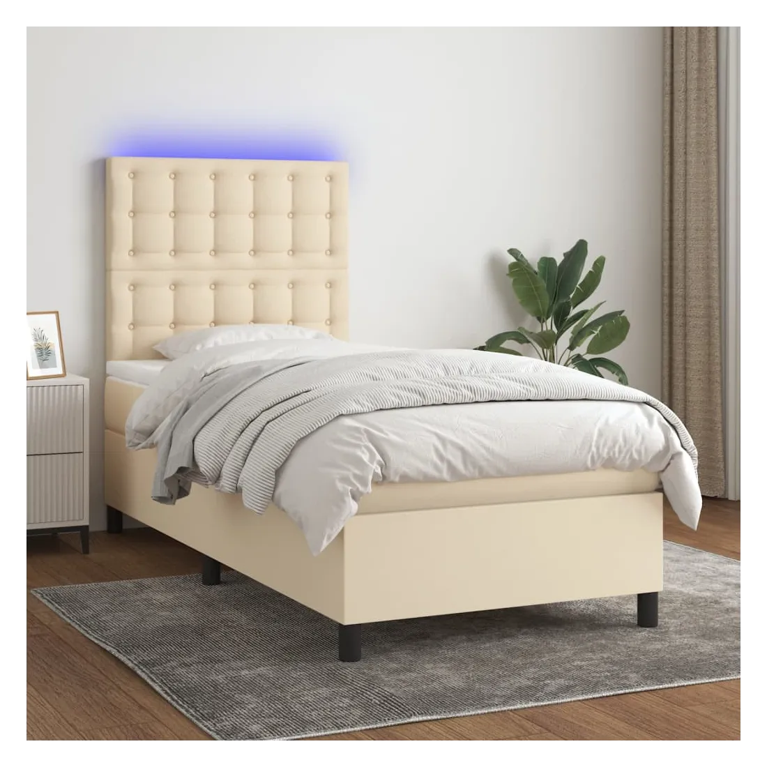Utilisez ce sommier tapissier avec matelas et LED pour profiter d'un sommeil réparateur ! C'est le point central de votre chambre à coucher. Tissu durable : le tissu présente un aspect simple et épuré, et il est respirant et durable.Tête de lit pratique : la tête de lit est réglable en hauteur selon vos préférences. La tête de lit vous offre un excellent soutien du dos lorsque vous êtes assis dans votre lit pour lire ou regarder la télévision.Bande LED colorée : apportez de l'éclairage dans l'obscurité avec des lumières LED colorées !Matelas à ressorts ensachés : le ressort ensaché individuel intégré est connu pour sa très haute qualité tout en assurant un haut niveau de durabilité et d'adaptabilité. Il peut absorber efficacement le bruit et les chocs causés par les sauts et les rotations.Protège-matelas doux pour la peau : le protège-matelas est recouvert d'un tissu résistant et doux pour la peau, ce qui le rend souple et confortable. Remarque :Pour des raisons d'hygiène, le matelas ne peut pas être retourné si l'emballage est retiré ou ouvert.Seule la partie avec un symbole de ciseaux peut être coupée et seule la partie avec l'USB continuera à fonctionner comme avant.Chaque produit est livré avec un manuel de montage dans la boîte pour un montage facile.Ce produit est doté d'un connecteur USB, mais la source d'alimentation certifiée de USB 5V n'est pas incluse.