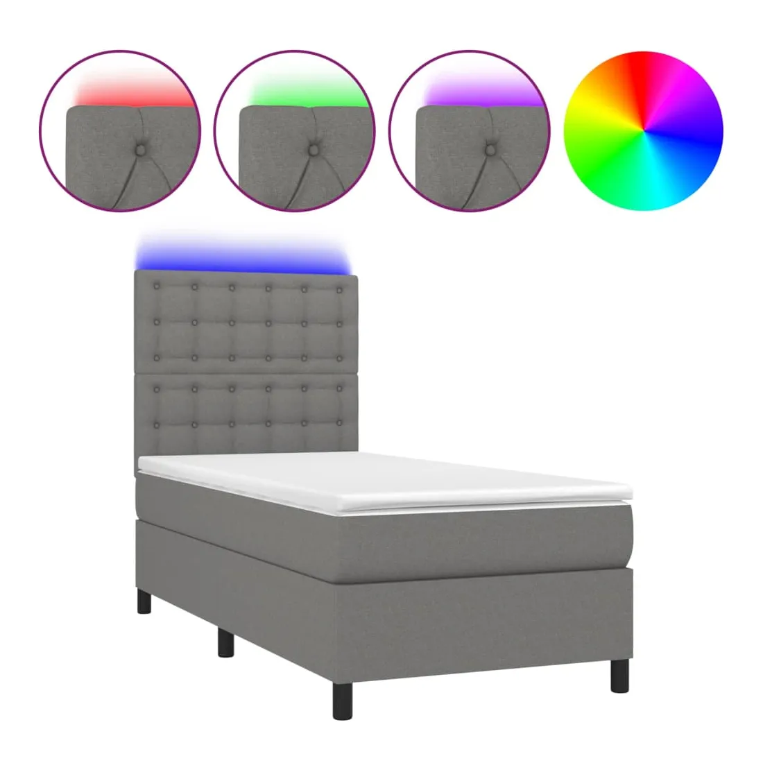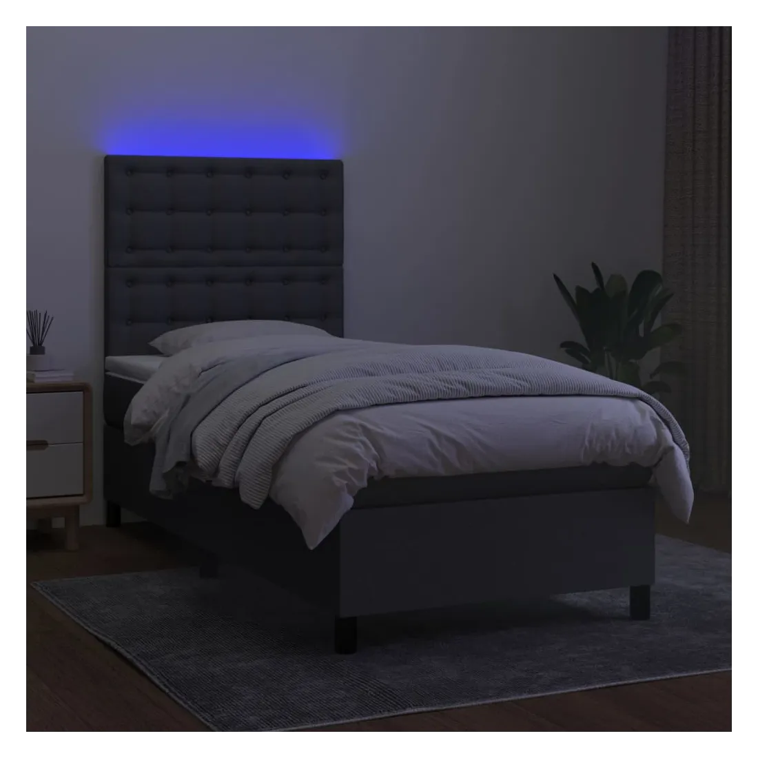 Utilisez ce sommier tapissier avec matelas et LED pour profiter d'un sommeil réparateur ! C'est le point central de votre chambre à coucher. Tissu durable : le tissu présente un aspect simple et épuré, et il est respirant et durable.Tête de lit pratique : la tête de lit est réglable en hauteur selon vos préférences. La tête de lit vous offre un excellent soutien du dos lorsque vous êtes assis dans votre lit pour lire ou regarder la télévision.Bande LED colorée : apportez de l'éclairage dans l'obscurité avec des lumières LED colorées !Matelas à ressorts ensachés : le ressort ensaché individuel intégré est connu pour sa très haute qualité tout en assurant un haut niveau de durabilité et d'adaptabilité. Il peut absorber efficacement le bruit et les chocs causés par les sauts et les rotations.Protège-matelas doux pour la peau : le protège-matelas est recouvert d'un tissu résistant et doux pour la peau, ce qui le rend souple et confortable. Remarque :Pour des raisons d'hygiène, le matelas ne peut pas être retourné si l'emballage est retiré ou ouvert.Seule la partie avec un symbole de ciseaux peut être coupée et seule la partie avec l'USB continuera à fonctionner comme avant.Chaque produit est livré avec un manuel de montage dans la boîte pour un montage facile.Ce produit est doté d'un connecteur USB, mais la source d'alimentation certifiée de USB 5V n'est pas incluse.