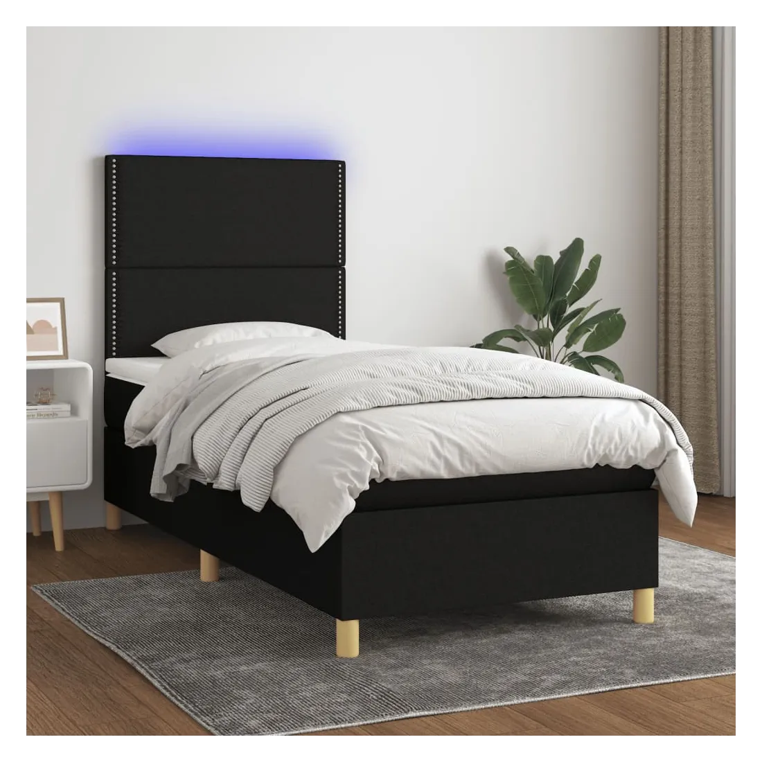 Utilisez ce sommier tapissier avec matelas et LED pour profiter d'un sommeil réparateur ! C'est le point central de votre chambre à coucher. Tissu durable : le tissu présente un aspect simple et épuré, et il est respirant et durable.Tête de lit pratique : la tête de lit est réglable en hauteur selon vos préférences. La tête de lit vous offre un excellent soutien du dos lorsque vous êtes assis dans votre lit pour lire ou regarder la télévision.Bande LED colorée : apportez de l'éclairage dans l'obscurité avec des lumières LED colorées !Matelas à ressorts ensachés : le ressort ensaché individuel intégré est connu pour sa très haute qualité tout en assurant un haut niveau de durabilité et d'adaptabilité. Il peut absorber efficacement le bruit et les chocs causés par les sauts et les rotations.Protège-matelas doux pour la peau : le protège-matelas est recouvert d'un tissu résistant et doux pour la peau, ce qui le rend souple et confortable. Remarque :Pour des raisons d'hygiène, le matelas ne peut pas être retourné si l'emballage est retiré ou ouvert.Seule la partie avec un symbole de ciseaux peut être coupée et seule la partie avec l'USB continuera à fonctionner comme avant.Chaque produit est livré avec un manuel de montage dans la boîte pour un montage facile.Ce produit est doté d'un connecteur USB, mais la source d'alimentation certifiée de USB 5V n'est pas incluse.