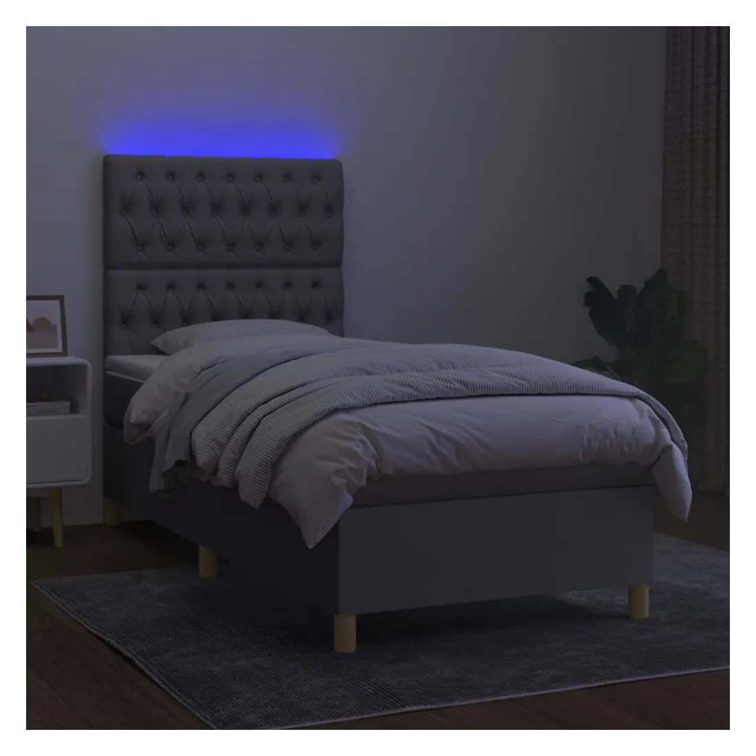 Utilisez ce sommier tapissier avec matelas et LED pour profiter d'un sommeil réparateur ! C'est le point central de votre chambre à coucher. Tissu durable : le tissu présente un aspect simple et épuré, et il est respirant et durable.Tête de lit pratique : la tête de lit est réglable en hauteur selon vos préférences. La tête de lit vous offre un excellent soutien du dos lorsque vous êtes assis dans votre lit pour lire ou regarder la télévision.Bande LED colorée : apportez de l'éclairage dans l'obscurité avec des lumières LED colorées !Matelas à ressorts ensachés : le ressort ensaché individuel intégré est connu pour sa très haute qualité tout en assurant un haut niveau de durabilité et d'adaptabilité. Il peut absorber efficacement le bruit et les chocs causés par les sauts et les rotations.Protège-matelas doux pour la peau : le protège-matelas est recouvert d'un tissu résistant et doux pour la peau, ce qui le rend souple et confortable. Remarque :Pour des raisons d'hygiène, le matelas ne peut pas être retourné si l'emballage est retiré ou ouvert.Seule la partie avec un symbole de ciseaux peut être coupée et seule la partie avec l'USB continuera à fonctionner comme avant.Chaque produit est livré avec un manuel de montage dans la boîte pour un montage facile.Ce produit est doté d'un connecteur USB, mais la source d'alimentation certifiée de USB 5V n'est pas incluse.
