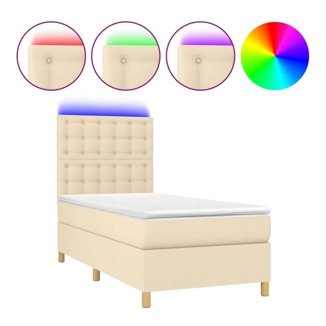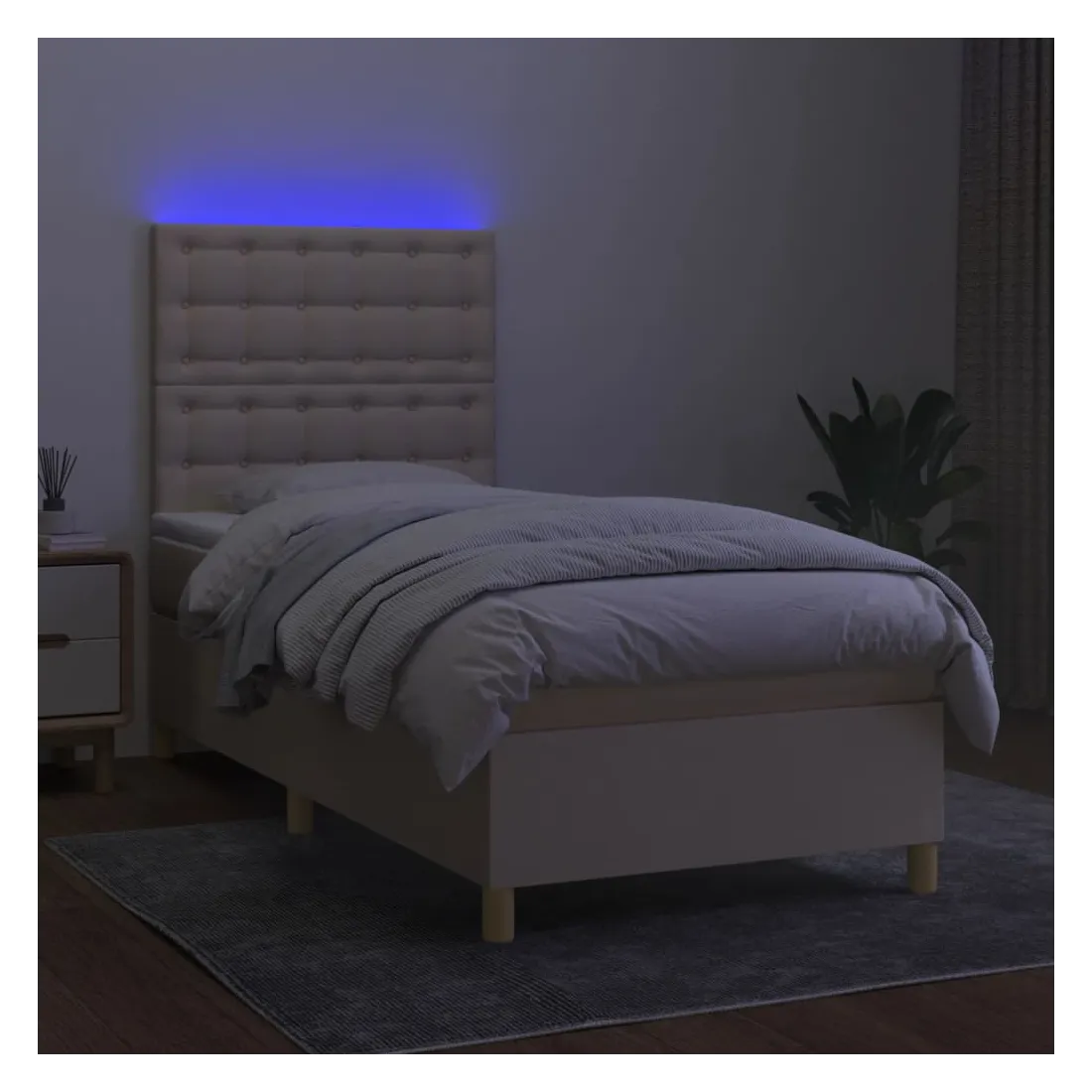Utilisez ce sommier tapissier avec matelas et LED pour profiter d'un sommeil réparateur ! C'est le point central de votre chambre à coucher. Tissu durable : le tissu présente un aspect simple et épuré, et il est respirant et durable.Tête de lit pratique : la tête de lit est réglable en hauteur selon vos préférences. La tête de lit vous offre un excellent soutien du dos lorsque vous êtes assis dans votre lit pour lire ou regarder la télévision.Bande LED colorée : apportez de l'éclairage dans l'obscurité avec des lumières LED colorées !Matelas à ressorts ensachés : le ressort ensaché individuel intégré est connu pour sa très haute qualité tout en assurant un haut niveau de durabilité et d'adaptabilité. Il peut absorber efficacement le bruit et les chocs causés par les sauts et les rotations.Protège-matelas doux pour la peau : le protège-matelas est recouvert d'un tissu résistant et doux pour la peau, ce qui le rend souple et confortable. Remarque :Pour des raisons d'hygiène, le matelas ne peut pas être retourné si l'emballage est retiré ou ouvert.Seule la partie avec un symbole de ciseaux peut être coupée et seule la partie avec l'USB continuera à fonctionner comme avant.Chaque produit est livré avec un manuel de montage dans la boîte pour un montage facile.Ce produit est doté d'un connecteur USB, mais la source d'alimentation certifiée de USB 5V n'est pas incluse.