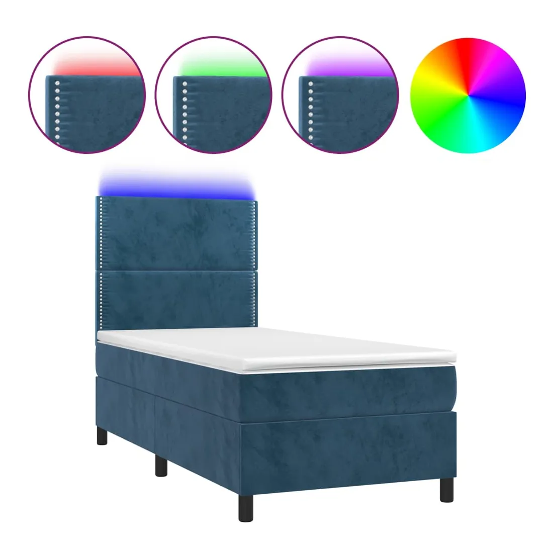 Utilisez ce sommier tapissier avec matelas et LED pour profiter d'un sommeil réparateur ! C'est le point central de votre chambre à coucher. Velours doux : le velours est un tissu doux et luxueux qui se reconnaît à son tas dense de fibres uniformément coupées qui ont une touche lisse. Le tissu en velours présente un toucher doux distinctif, ce qui le rend confortable au toucher.Tête de lit pratique : la tête de lit est réglable en hauteur selon vos préférences. La tête de lit vous offre un excellent soutien du dos lorsque vous êtes assis dans votre lit pour lire ou regarder la télévision.Bande LED colorée : apportez de l'éclairage dans l'obscurité avec des lumières LED colorées !Matelas à ressorts ensachés : le ressort ensaché individuel intégré est connu pour sa très haute qualité tout en assurant un haut niveau de durabilité et d'adaptabilité. Il peut absorber efficacement le bruit et les chocs causés par les sauts et les rotations.Protège-matelas doux pour la peau : le protège-matelas est recouvert d'un tissu résistant et doux pour la peau, ce qui le rend souple et confortable. Remarque :Pour des raisons d'hygiène, le matelas ne peut pas être retourné si l'emballage est retiré ou ouvert.Seule la partie avec un symbole de ciseaux peut être coupée et seule la partie avec l'USB continuera à fonctionner comme avant.Chaque produit est livré avec un manuel de montage dans la boîte pour un montage facile.Ce produit est doté d'un connecteur USB, mais la source d'alimentation certifiée de USB 5V n'est pas incluse.