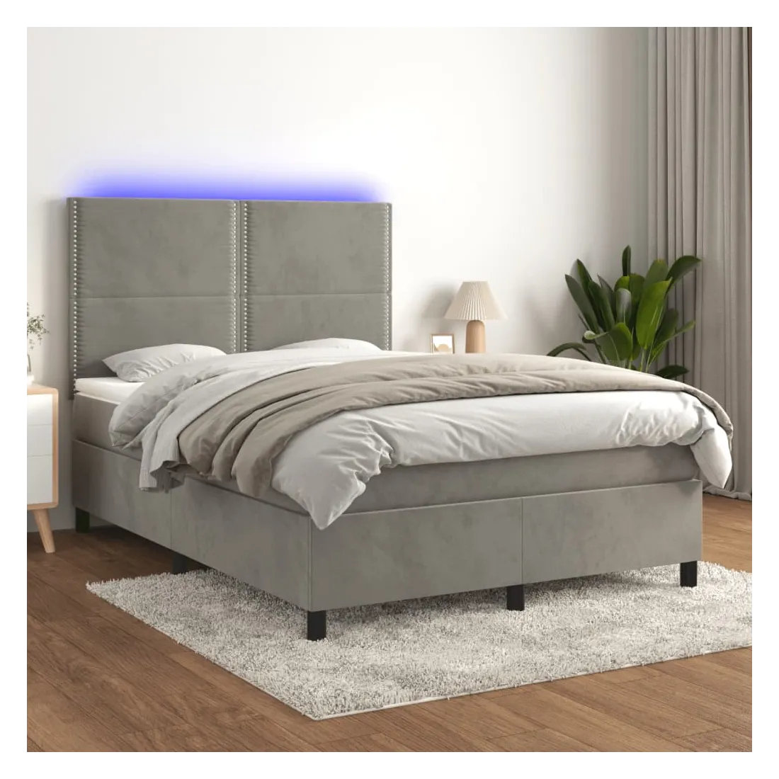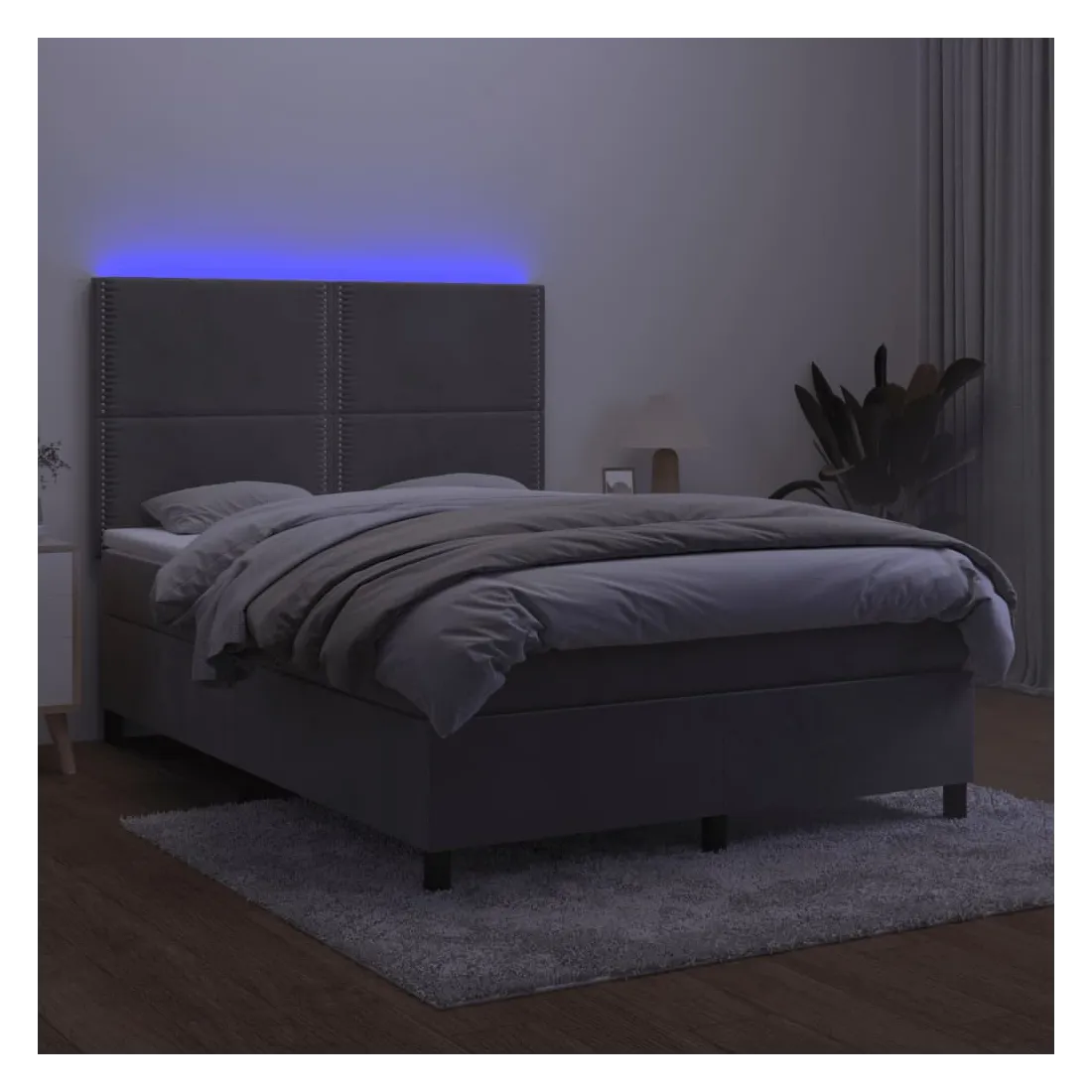 Utilisez ce sommier tapissier avec matelas et LED pour profiter d'un sommeil réparateur ! C'est le point central de votre chambre à coucher. Velours doux : le velours est un tissu doux et luxueux qui se reconnaît à son tas dense de fibres uniformément coupées qui ont une touche lisse. Le tissu en velours présente un toucher doux distinctif, ce qui le rend confortable au toucher.Tête de lit pratique : la tête de lit est réglable en hauteur selon vos préférences. La tête de lit vous offre un excellent soutien du dos lorsque vous êtes assis dans votre lit pour lire ou regarder la télévision.Bande LED colorée : apportez de l'éclairage dans l'obscurité avec des lumières LED colorées !Matelas à ressorts ensachés : le ressort ensaché individuel intégré est connu pour sa très haute qualité tout en assurant un haut niveau de durabilité et d'adaptabilité. Il peut absorber efficacement le bruit et les chocs causés par les sauts et les rotations.Protège-matelas doux pour la peau : le protège-matelas est recouvert d'un tissu résistant et doux pour la peau, ce qui le rend souple et confortable. Remarque :Pour des raisons d'hygiène, le matelas ne peut pas être retourné si l'emballage est retiré ou ouvert.Seule la partie avec un symbole de ciseaux peut être coupée et seule la partie avec l'USB continuera à fonctionner comme avant.Chaque produit est livré avec un manuel de montage dans la boîte pour un montage facile.Ce produit est doté d'un connecteur USB, mais la source d'alimentation certifiée de USB 5V n'est pas incluse.